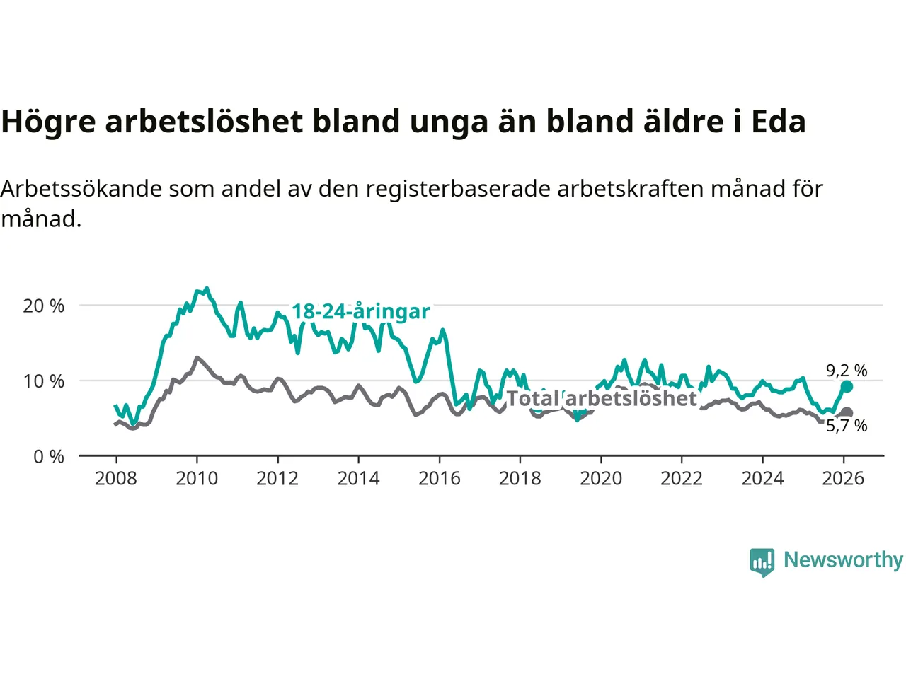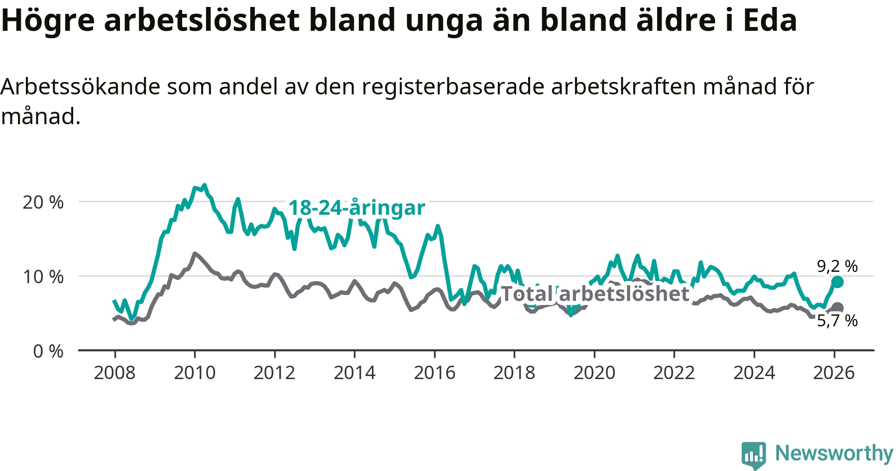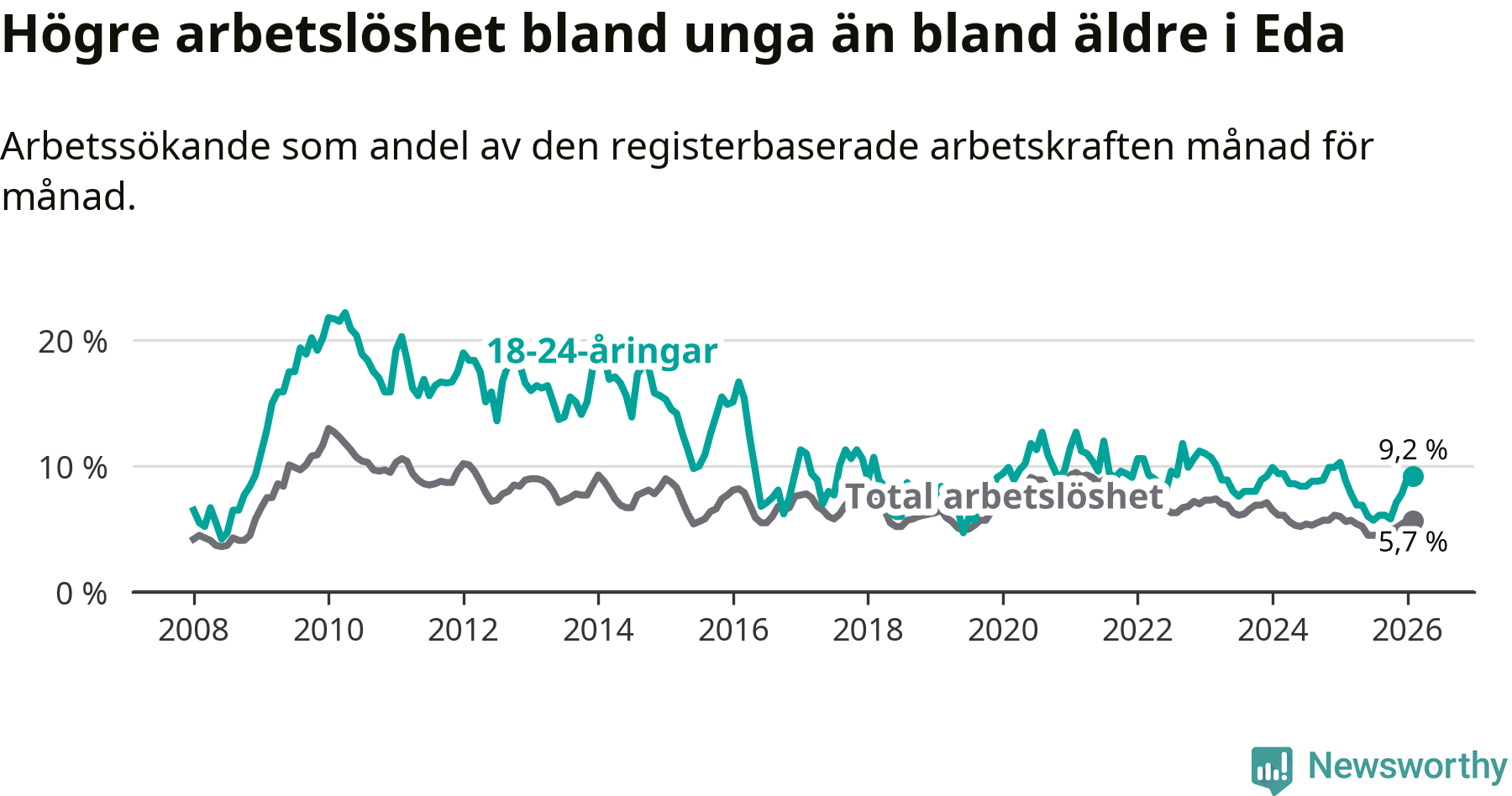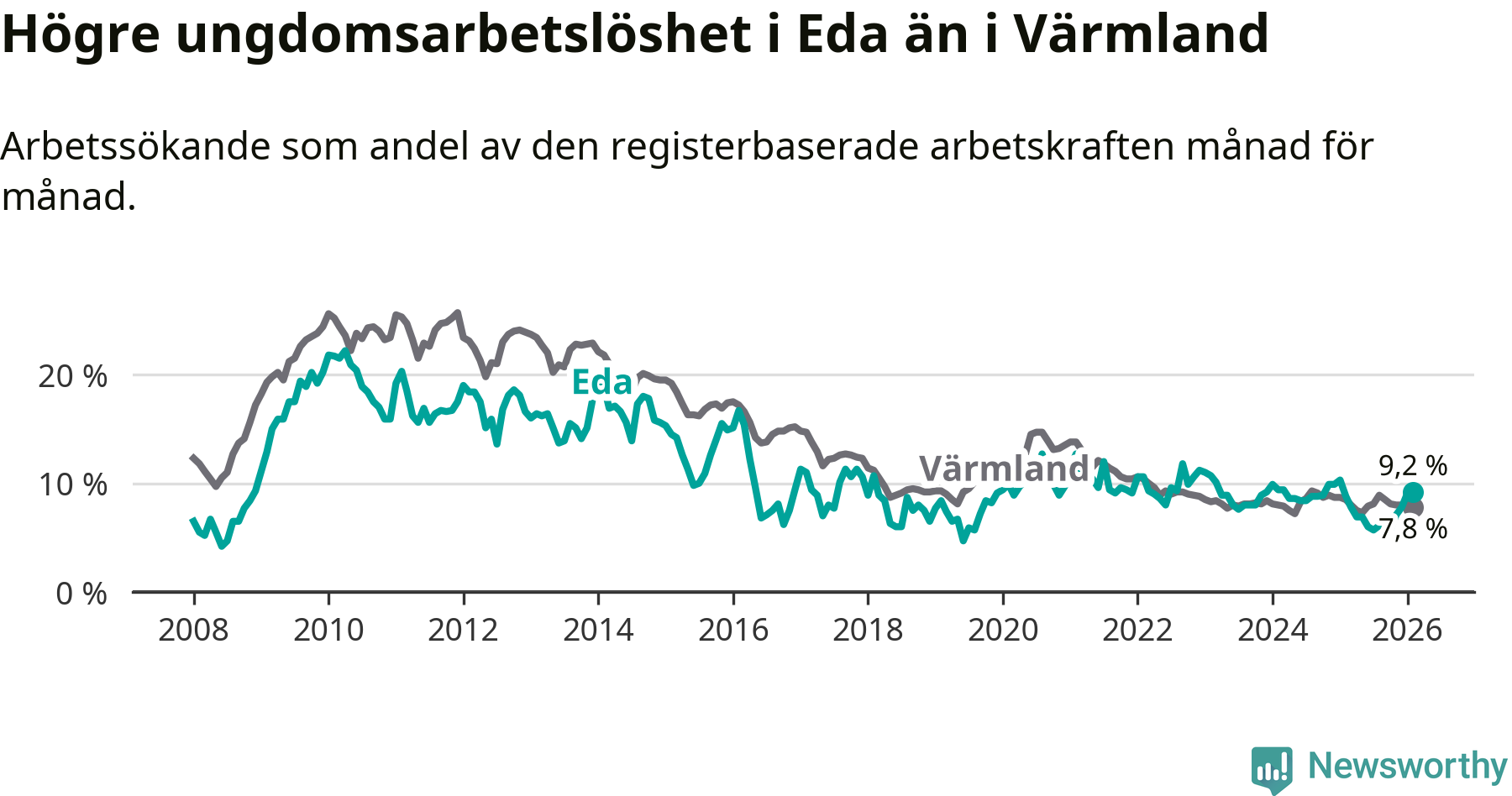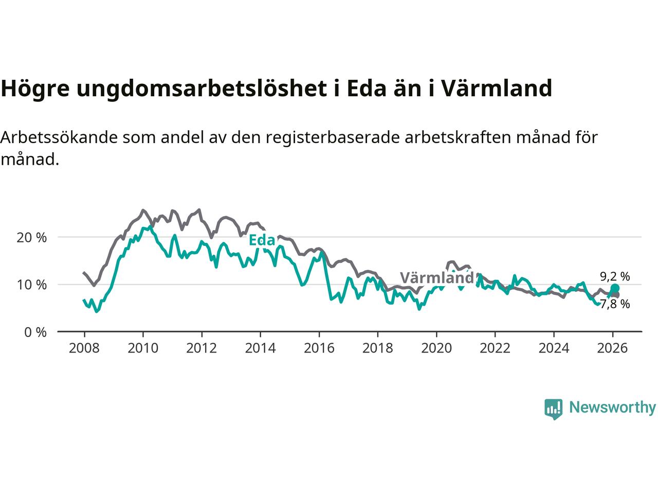 Medan Eda har ungefär samma total arbetslöshet som Värmland, ligger ungdomsarbetslösheten 1,4 procentenheter högre i Eda.