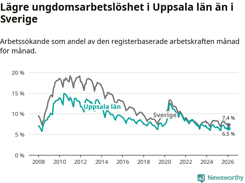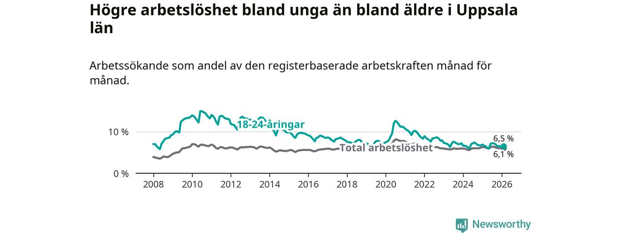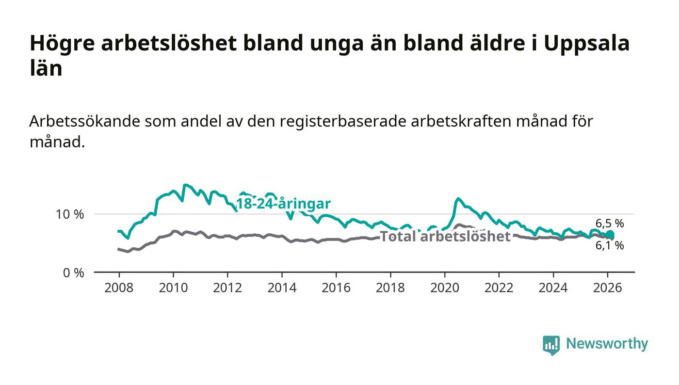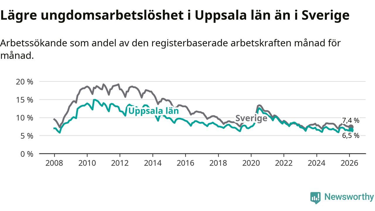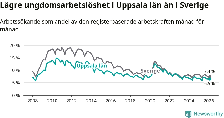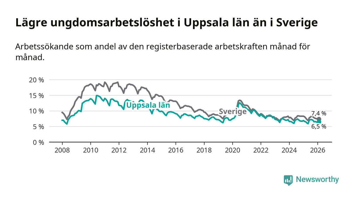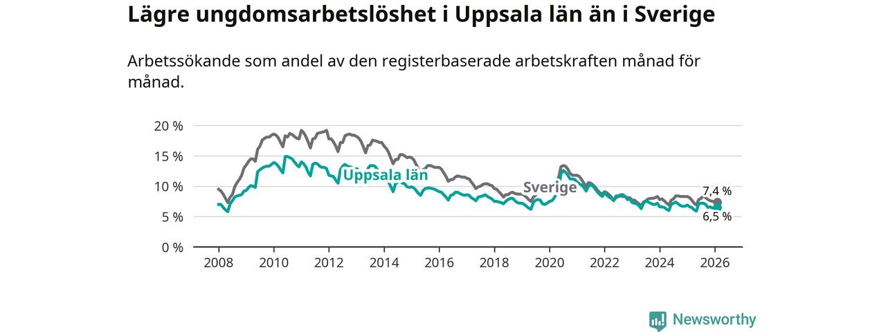 I och med den senaste månadens nedgång har de ungas arbetslöshet i Uppsala sjunkit sju månader i följd (ner från 7,2 procent i juli 2025 till 6,5 procent nu).