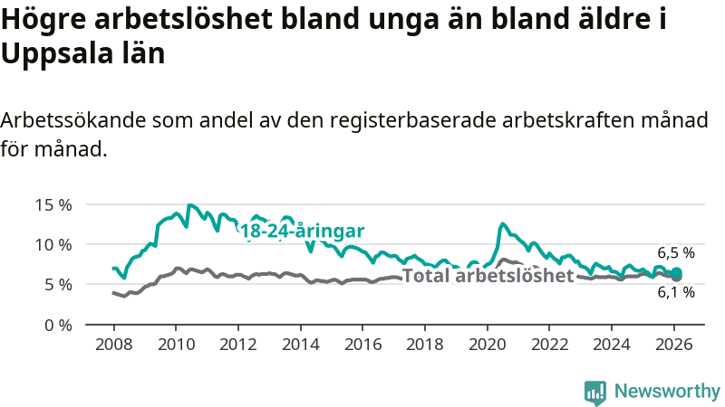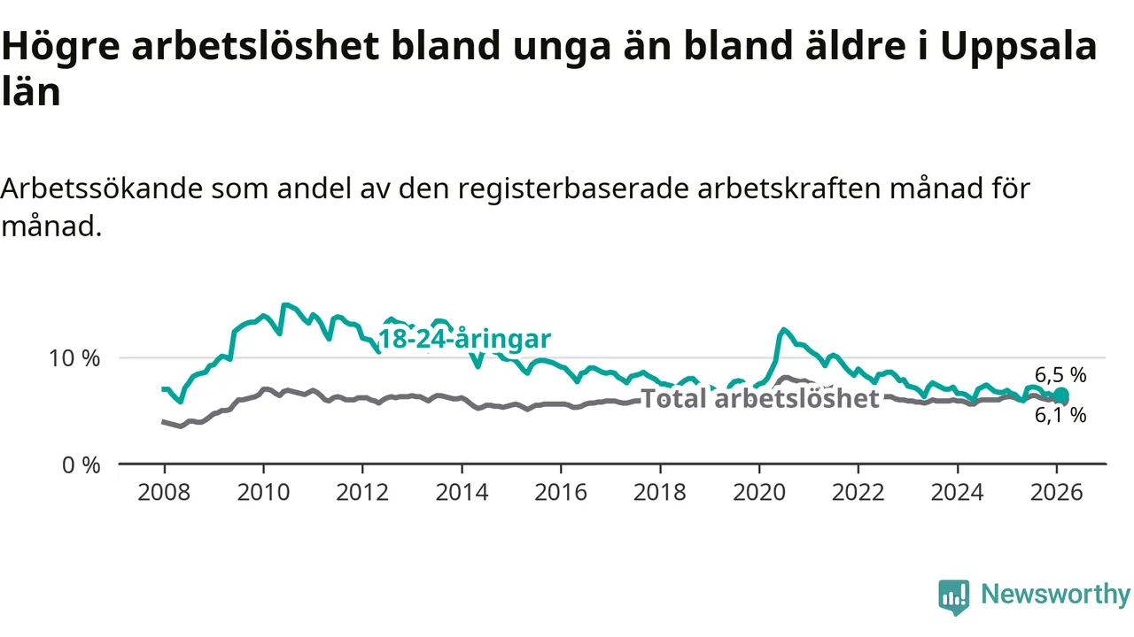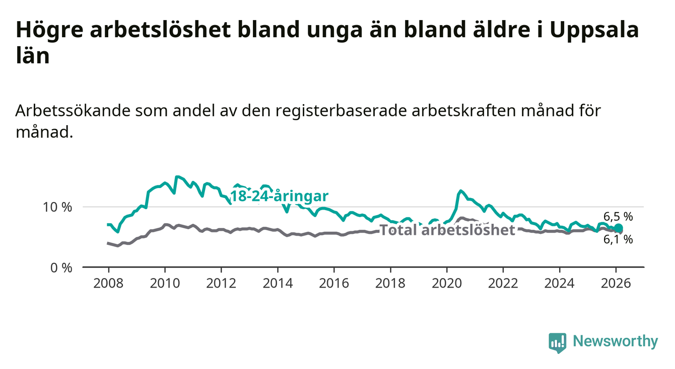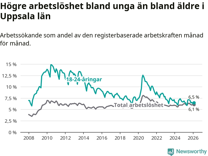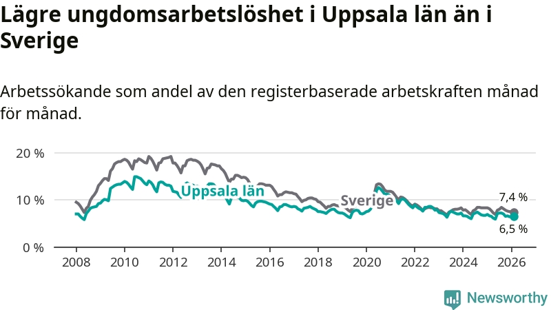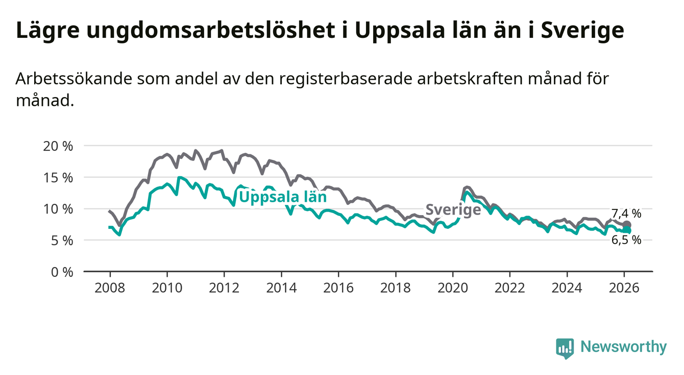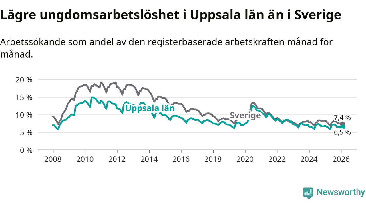 I och med den senaste månadens nedgång har de ungas arbetslöshet i Uppsala sjunkit sju månader i följd (ner från 7,2 procent i juli 2025 till 6,5 procent nu).