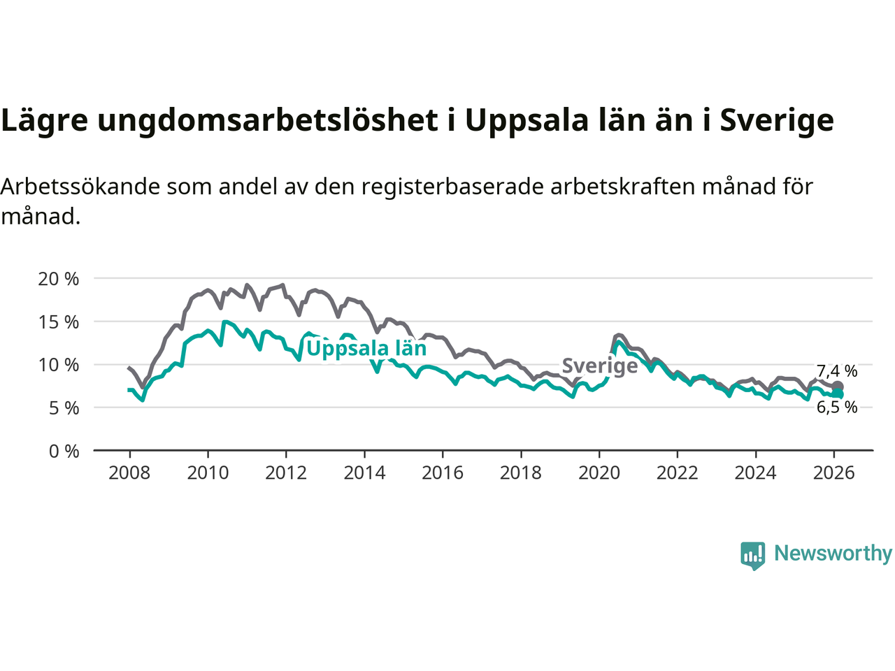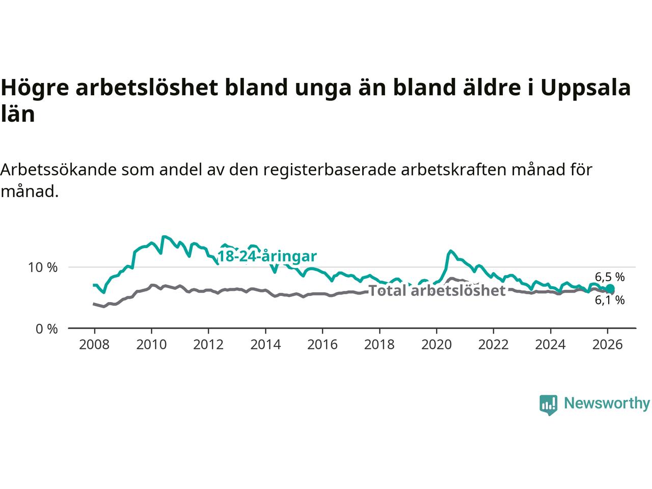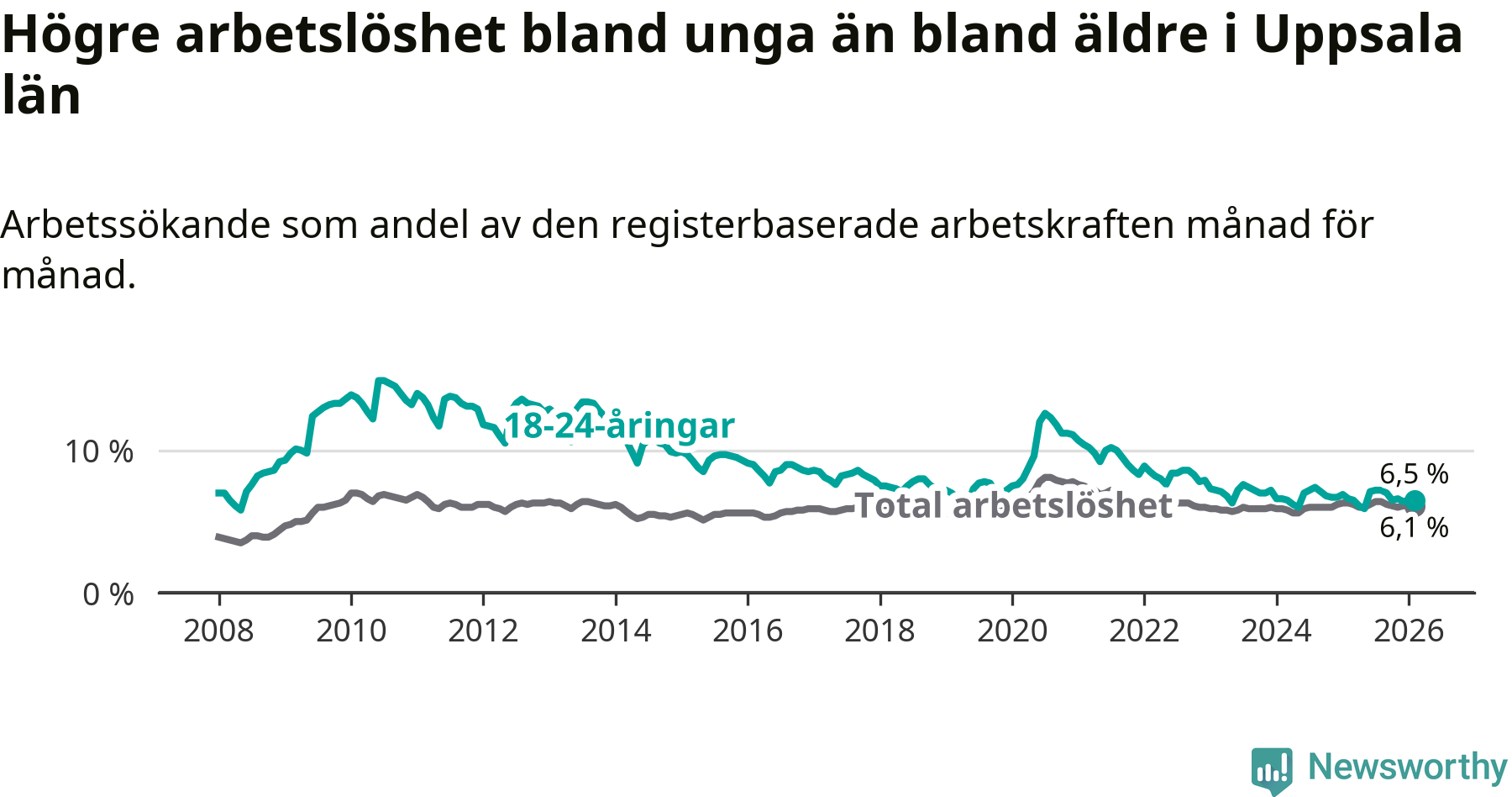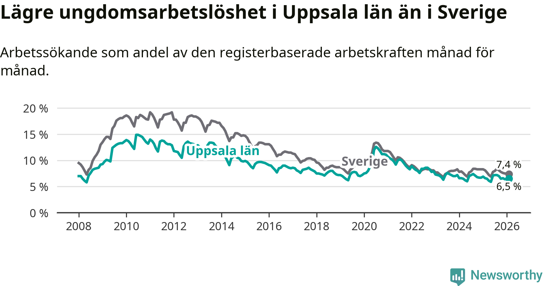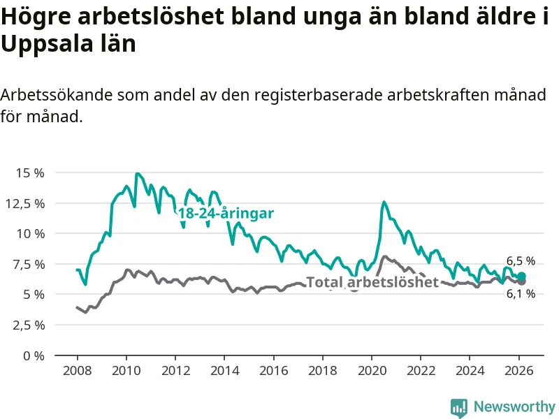I och med den senaste månadens nedgång har de ungas arbetslöshet i Uppsala sjunkit sju månader i följd (ner från 7,2 procent i juli 2025 till 6,5 procent nu).