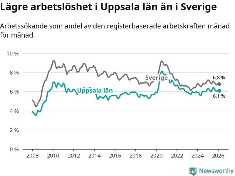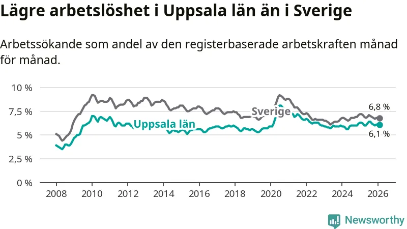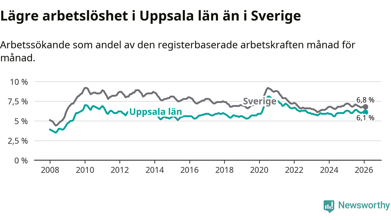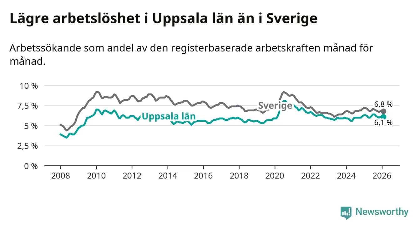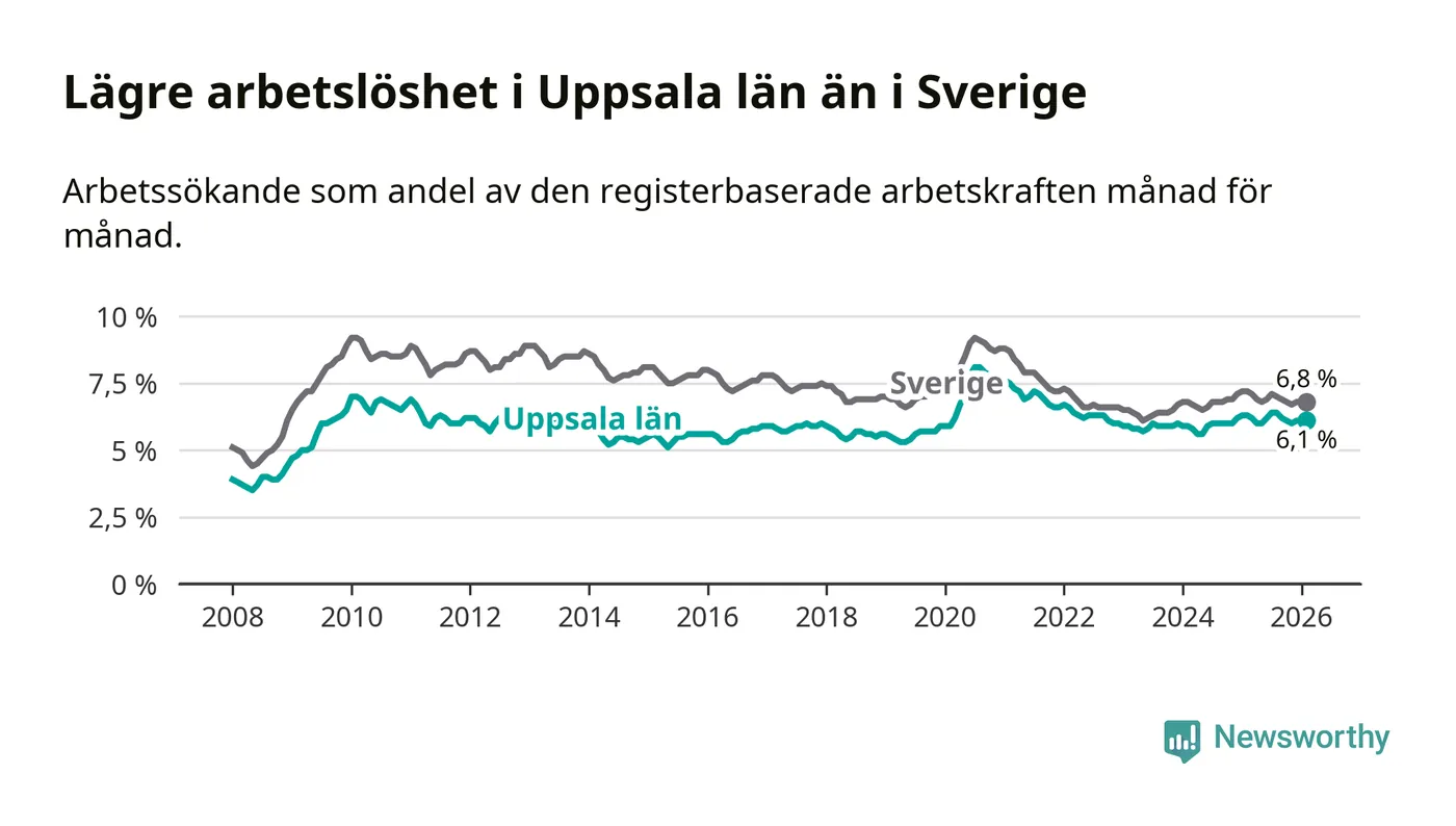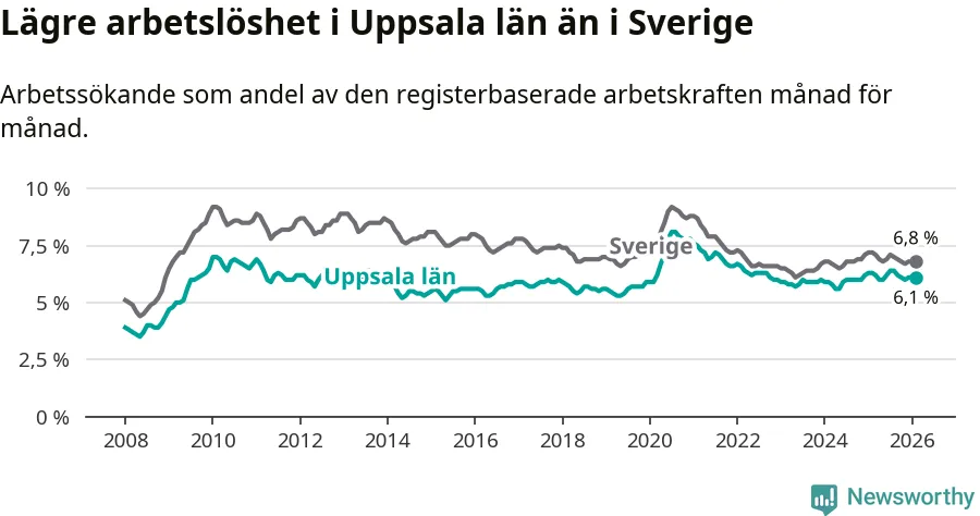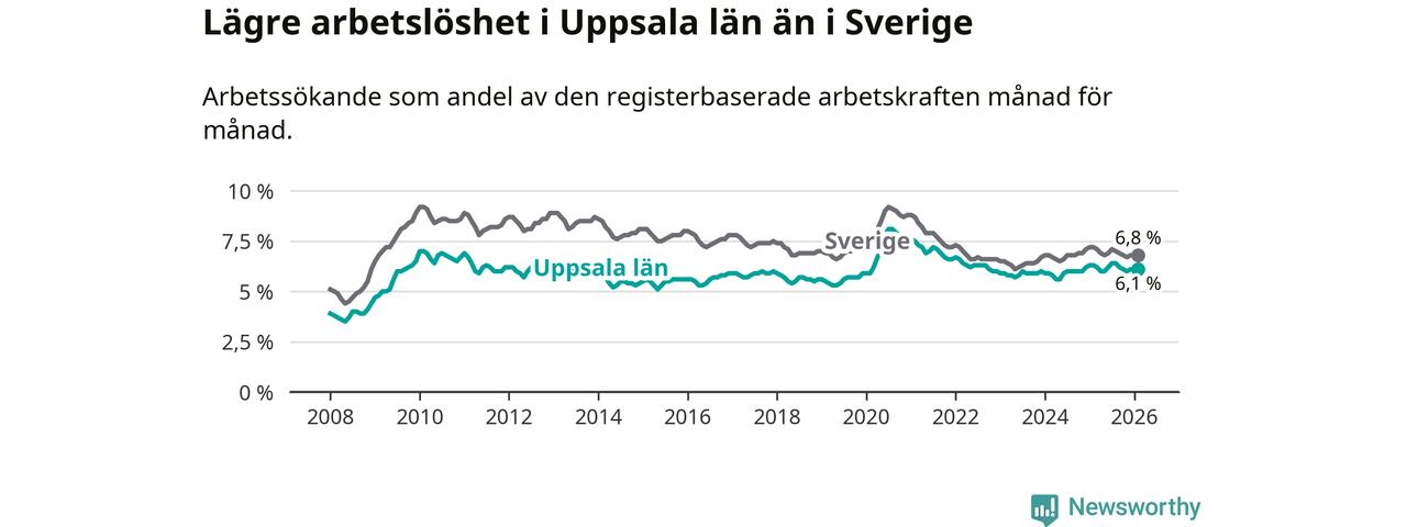 Under februari månad rapporterade Uppsala län en total arbetslöshet på 6,1 procent. Det är en minskning jämfört med samma tidpunkt i fjol (−0,2 procentenheter). Även i Sverige sjunker arbetslösheten .