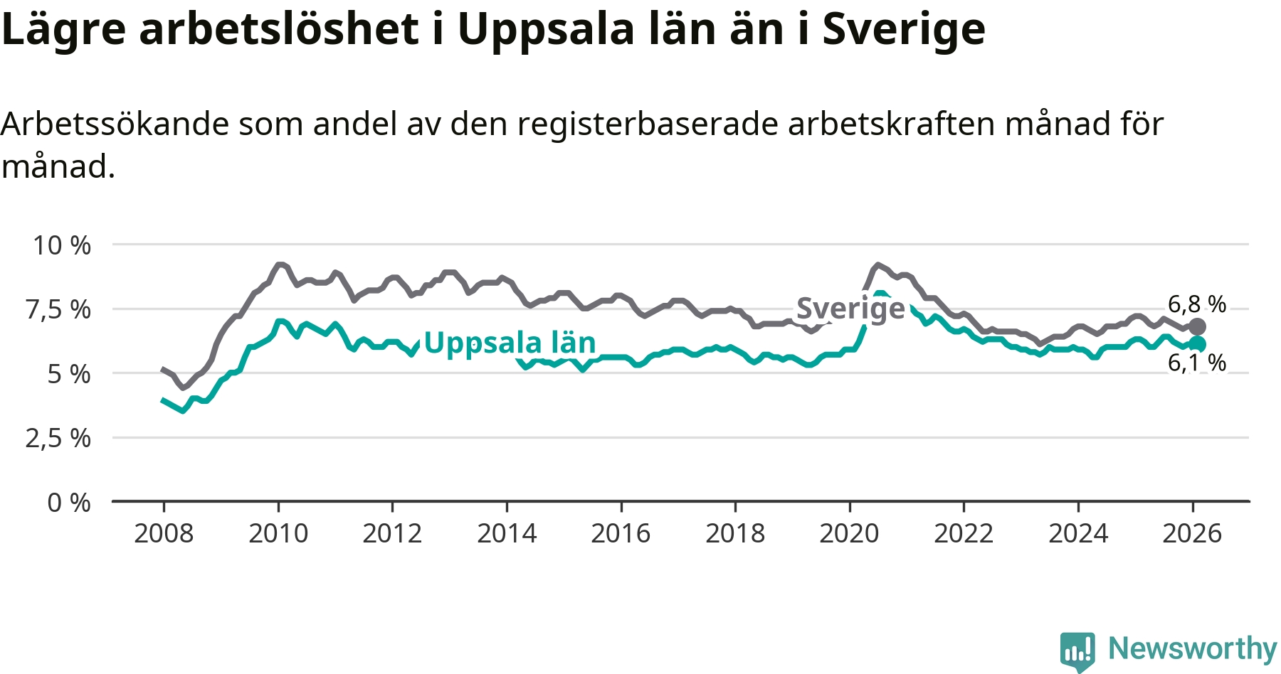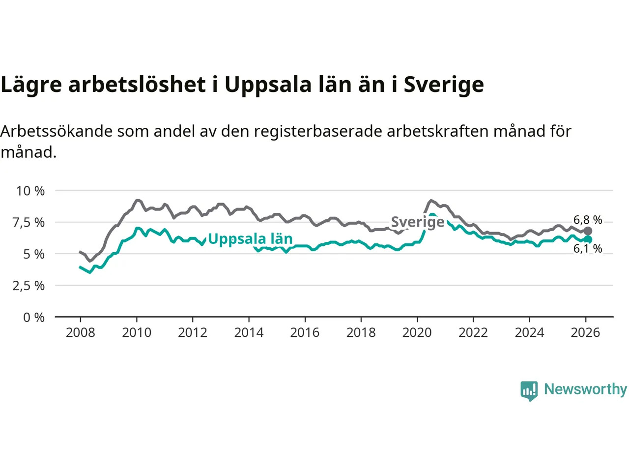 Uppsala hade redan tidigare lägre arbetslöshet än snittet i hela Sverige och nu växer klyftan (6,1 procent i länet, jämfört med 6,8 procent i hela riket). Norrbotten har den lägsta arbetslösheten i riket (3,8 procent), medan Skåne har den högsta (8,8 procent). För att Uppsala skulle komma ner i samma arbetslöshetsnivå som Norrbotten skulle 4 769 personer behöva sysselsättas.