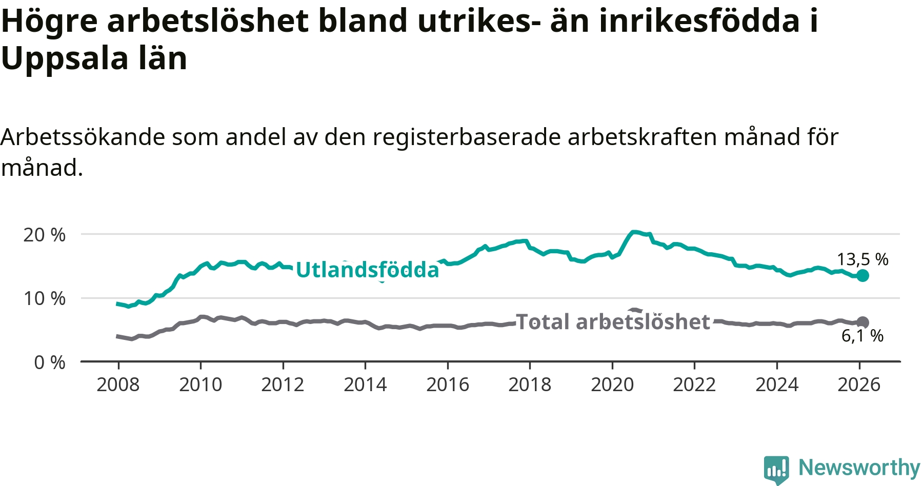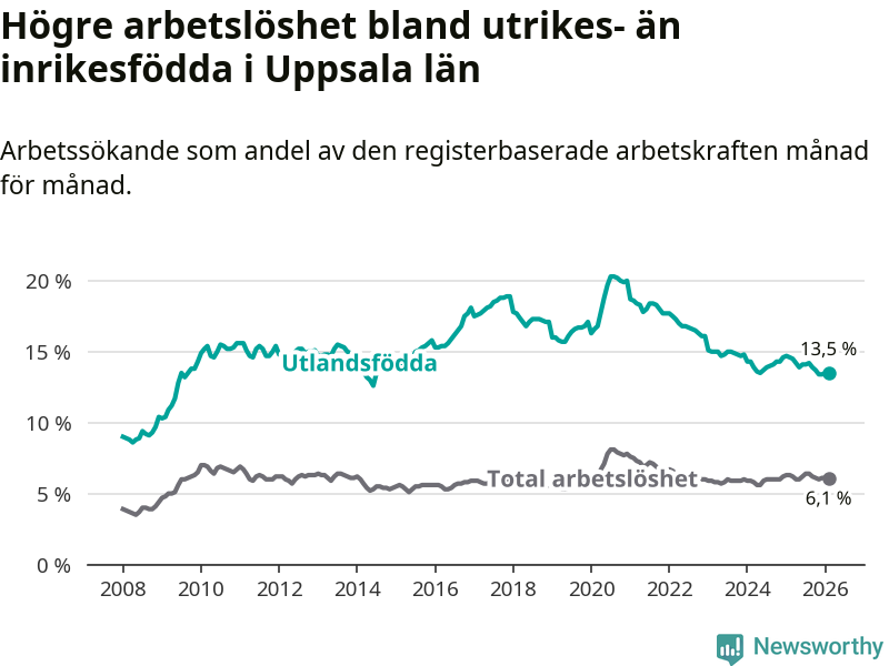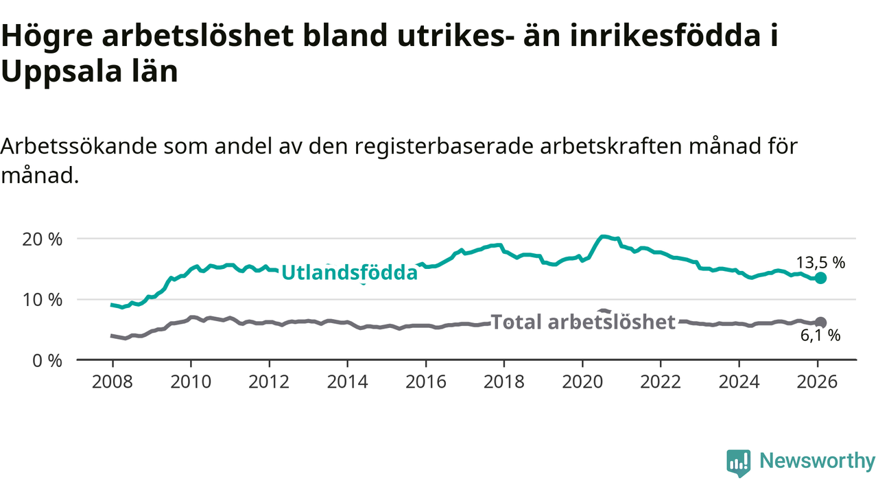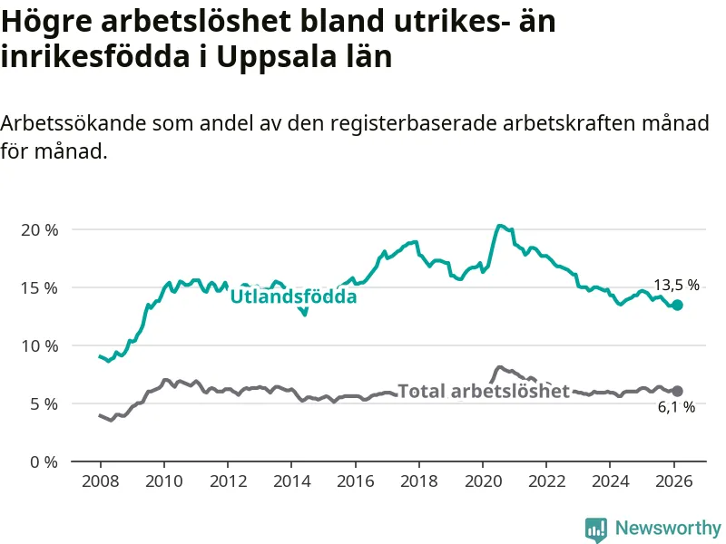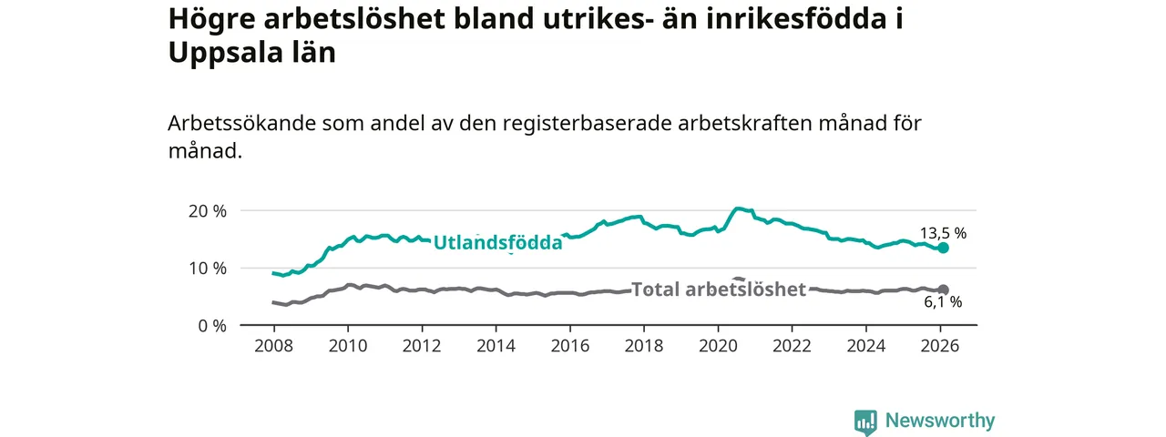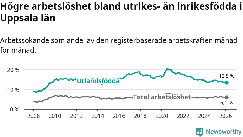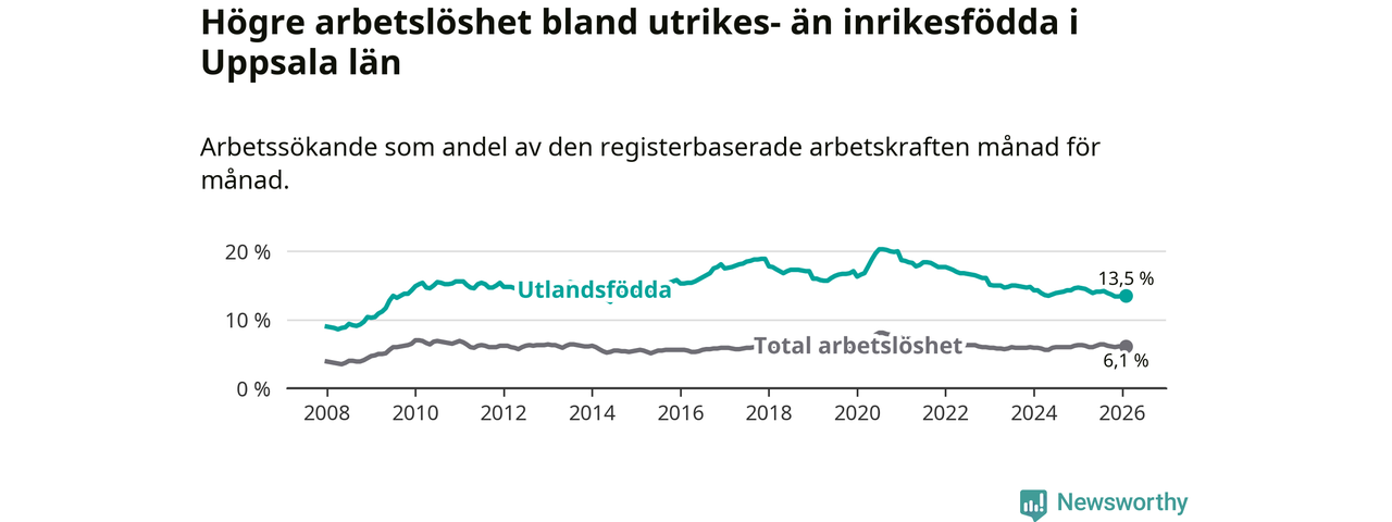Arbetslösheten bland utlandsfödda var 13,5 procent i Uppsala under februari månad, motsvarande 6 620 av 49 037 personer. Det är 1,1 procentenheter färre än vid samma tidpunkt i fjol (−342 om man räknar personer). Därmed är de utlandsföddas arbetslöshet lägre än vid samma tidpunkt i fjol för sjätte månaden i följd.