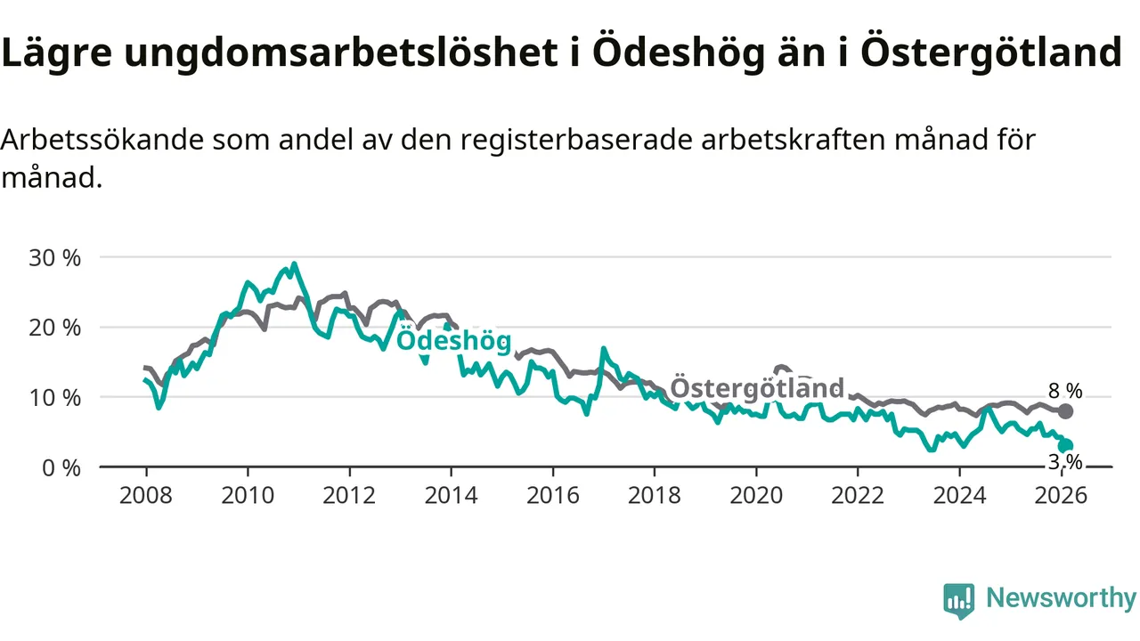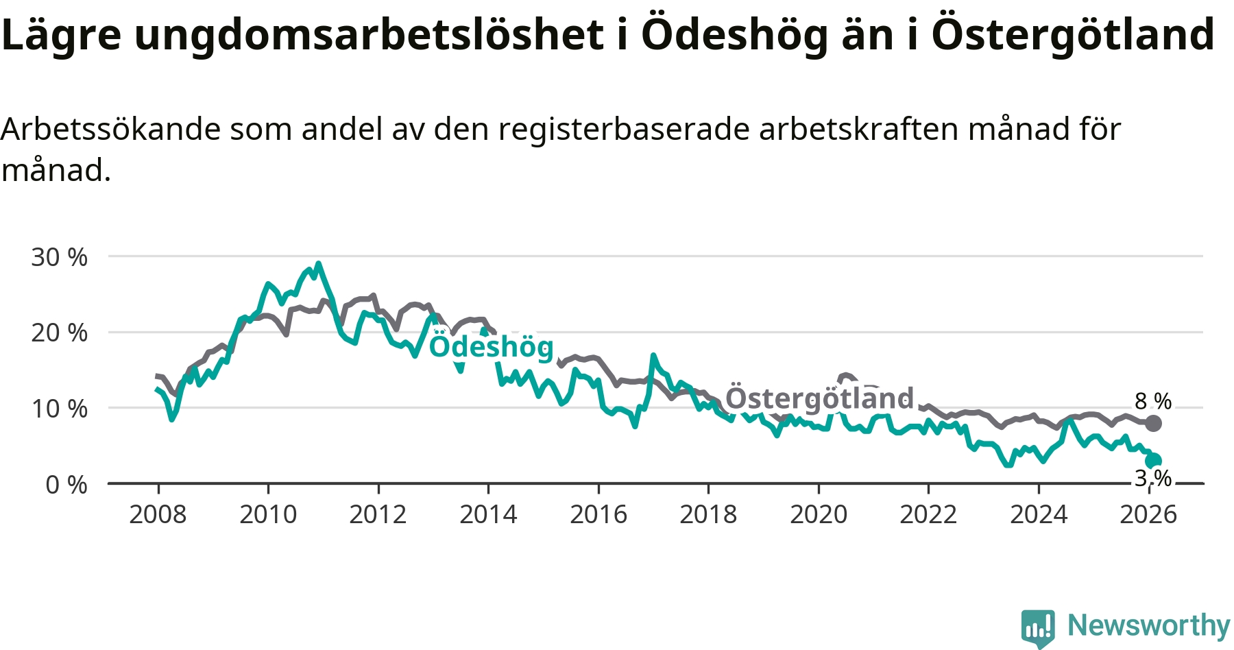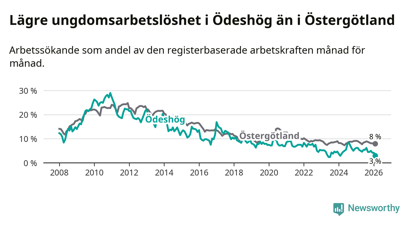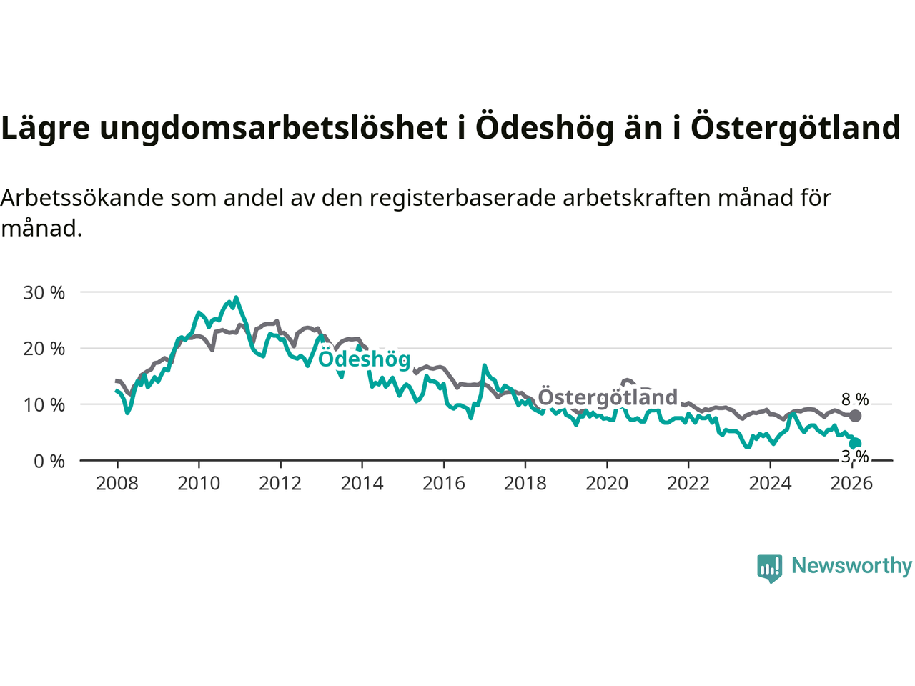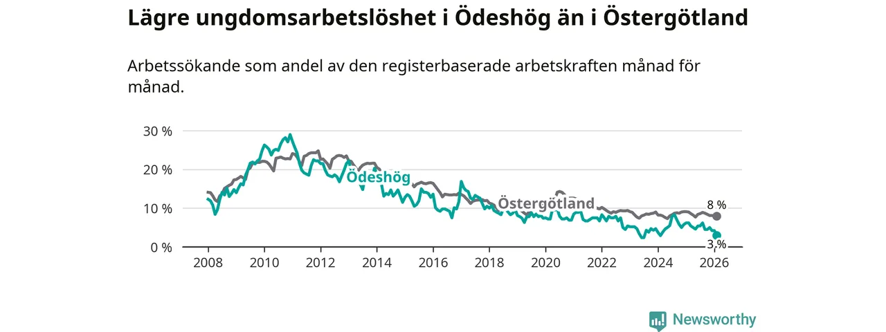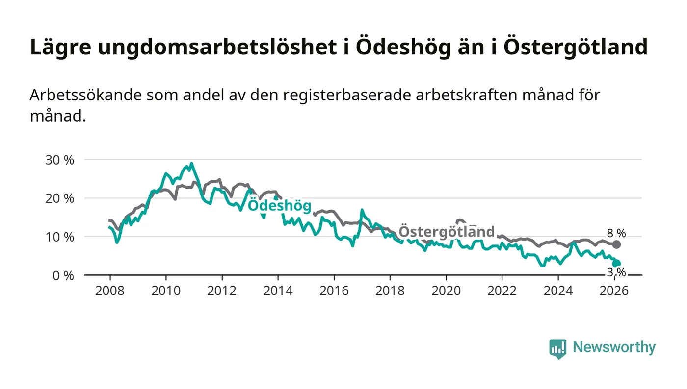 Graf: Arbetslöshet bland unga i Ödeshögs kommun och Östergötlands län