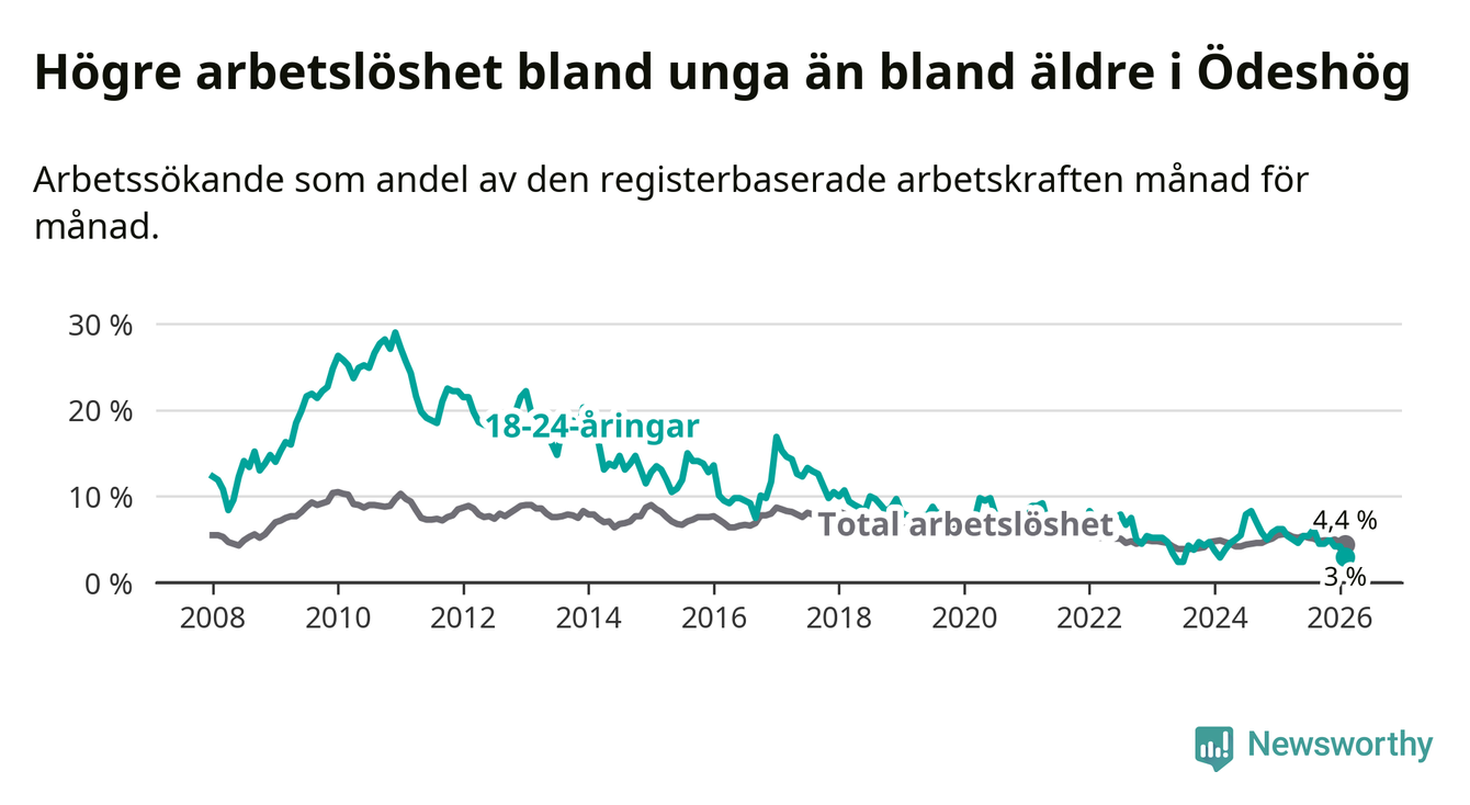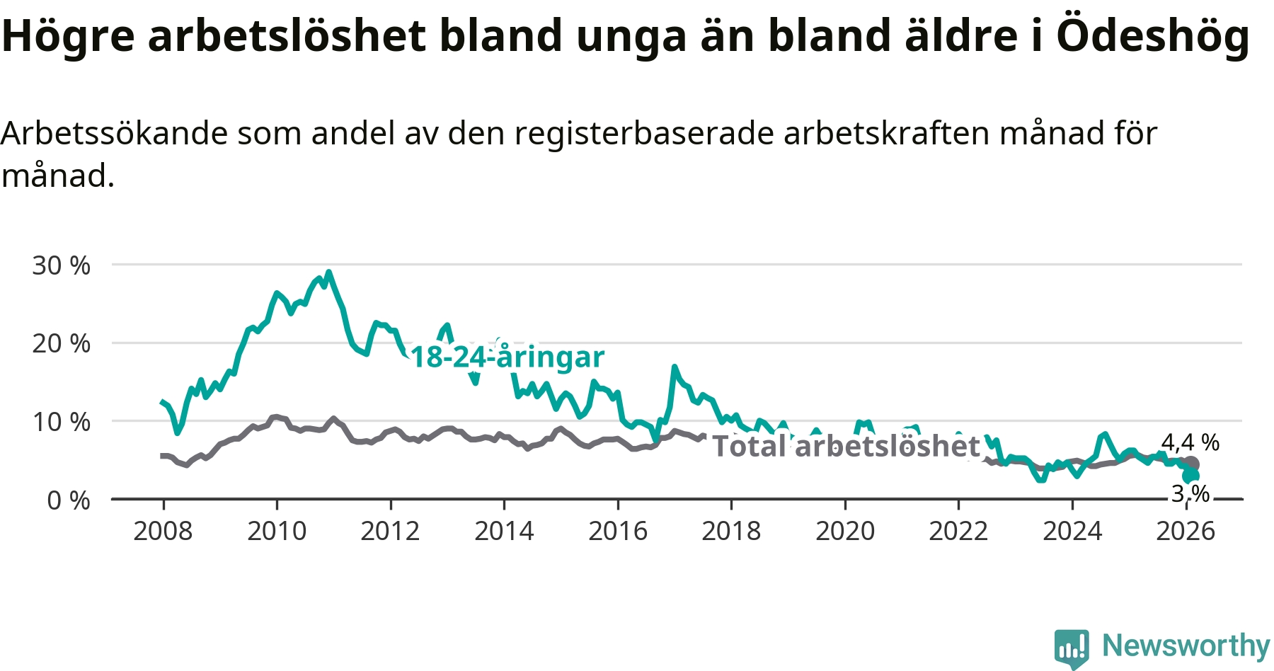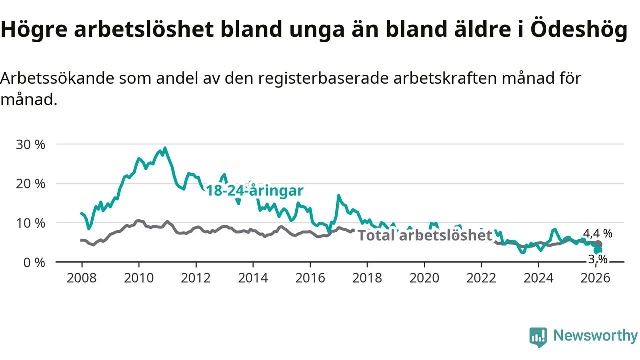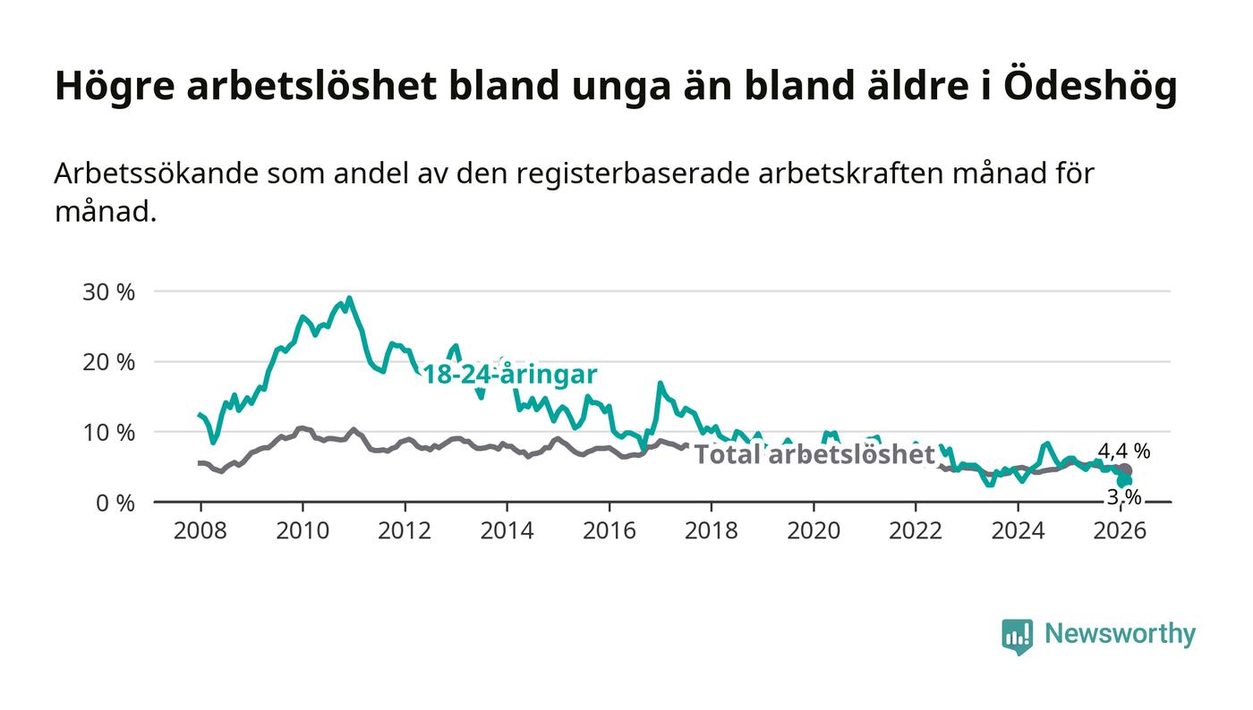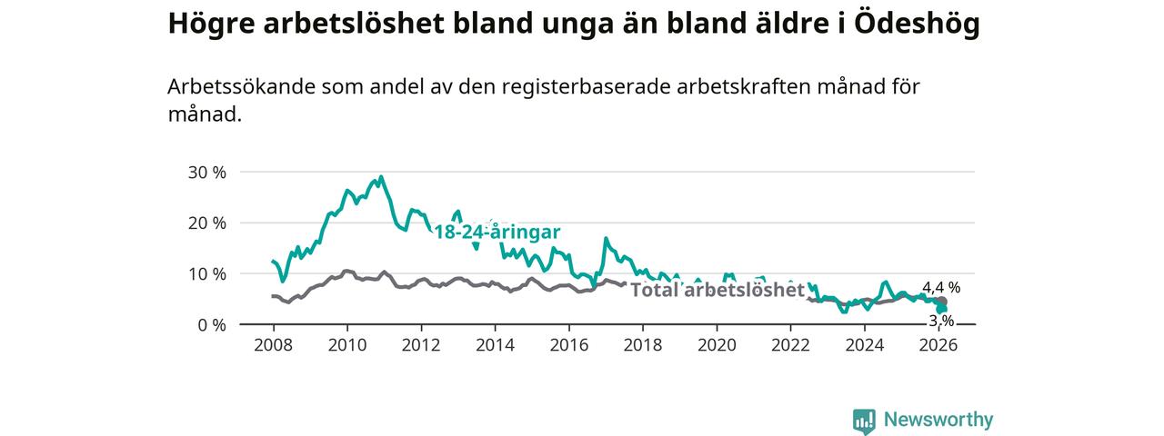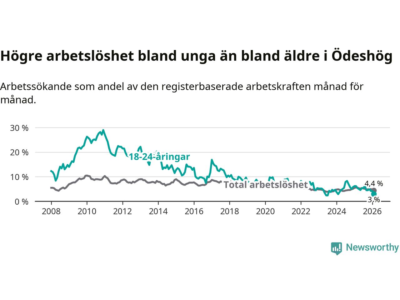 Graf: Arbetslöshet bland unga i Ödeshögs kommun och Östergötlands län