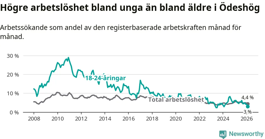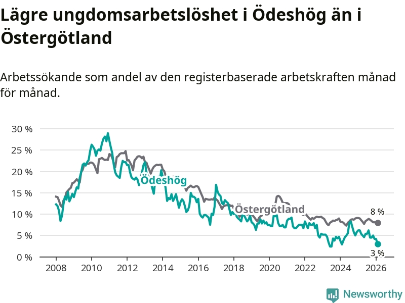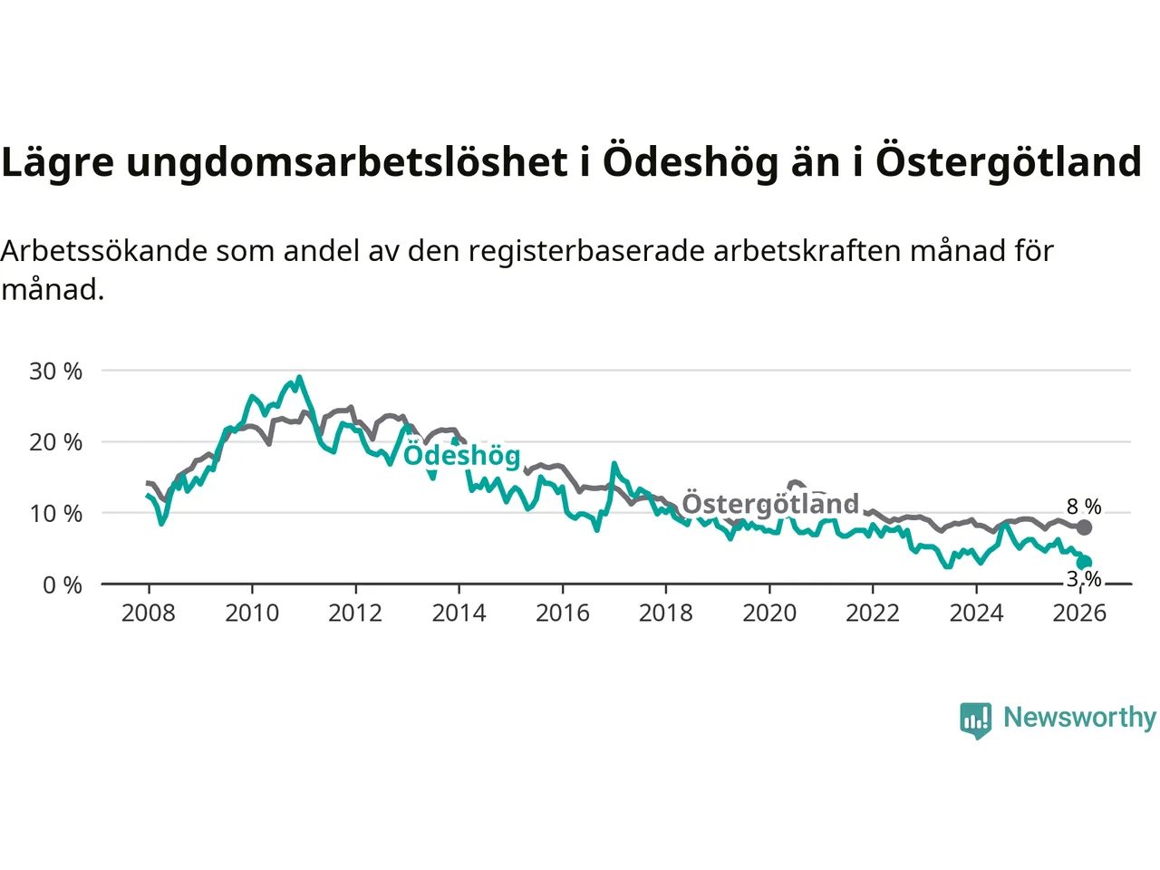 Precis som den totala arbetslösheten ligger ungdomsarbetslösheten i Ödeshög lägre än i Östergötland som helhet. Skillnaden mellan kommunen och länet är 5,0 procentenheter.
