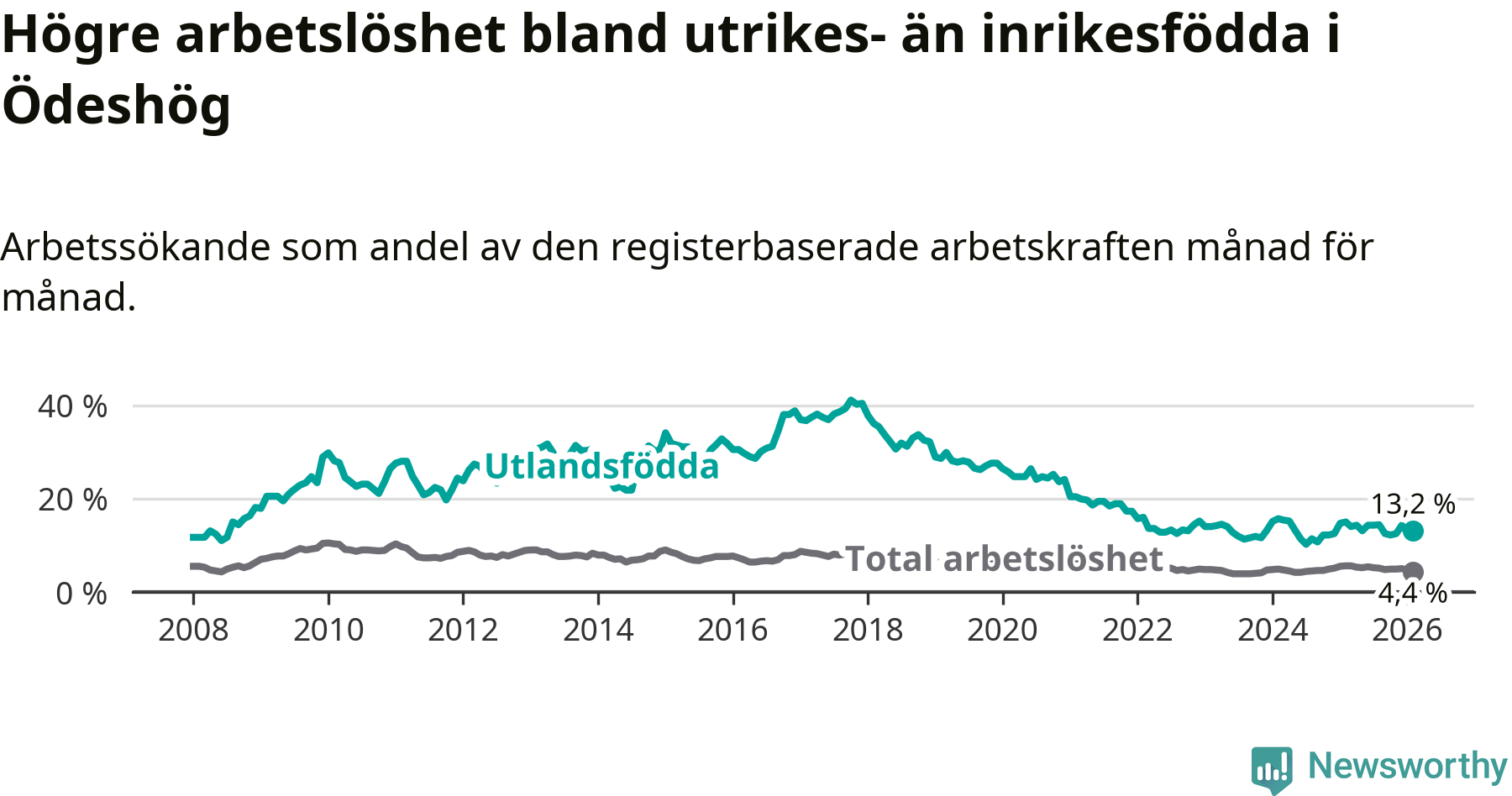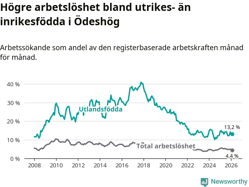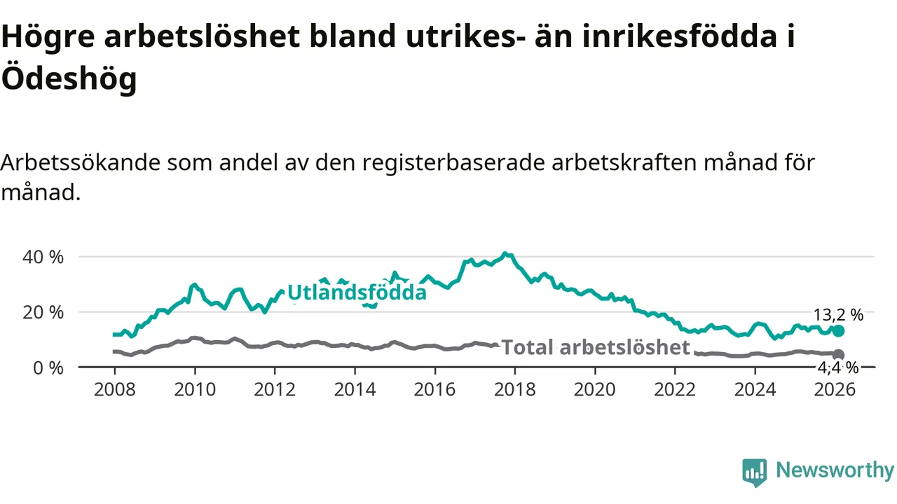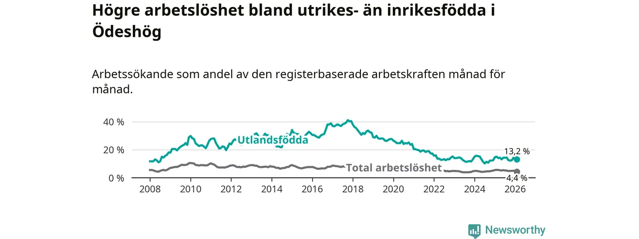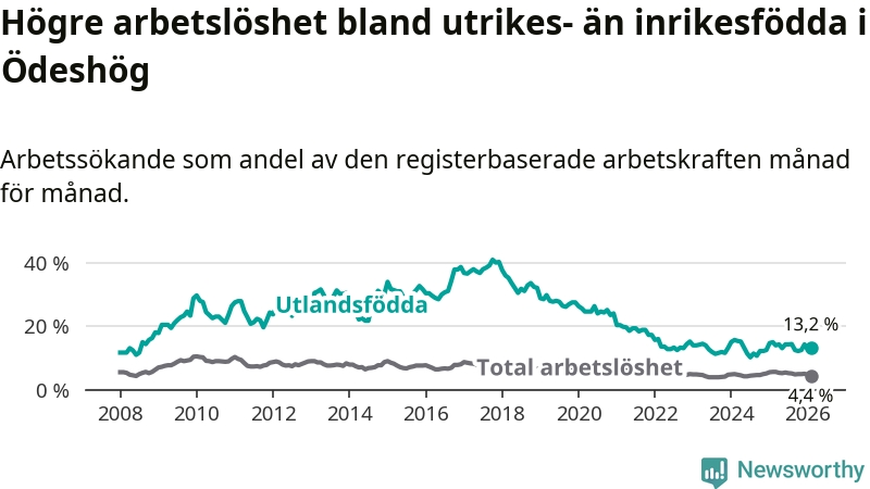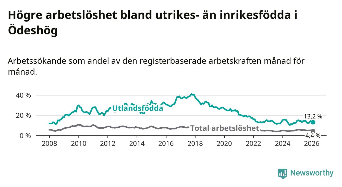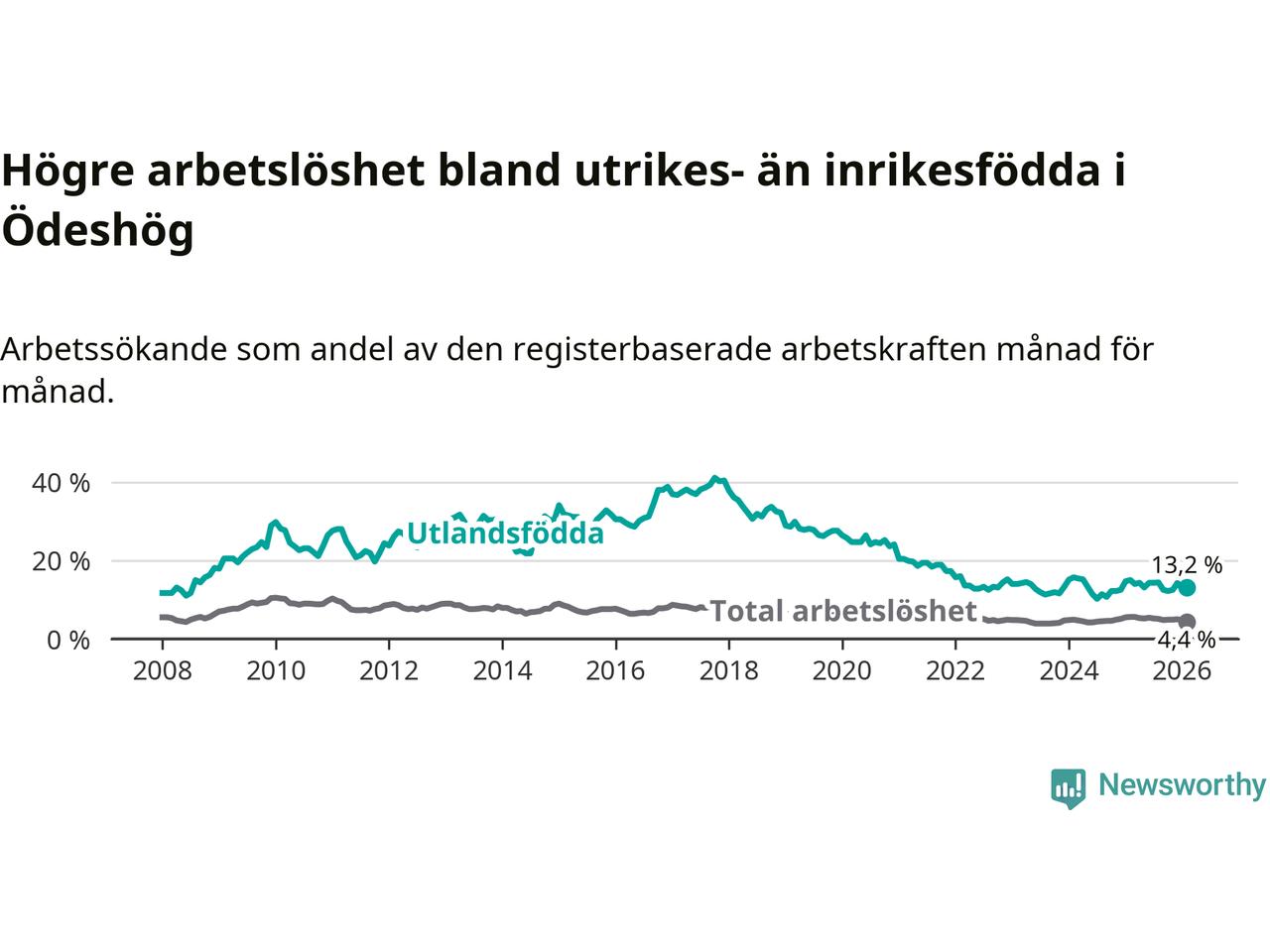 Arbetslösheten bland utlandsfödda var 13,2 procent i Ödeshög under februari månad, motsvarande 44 av 333 personer. Det är 1,8 procentenheter färre än vid samma tidpunkt i fjol (−5 om man räknar personer).