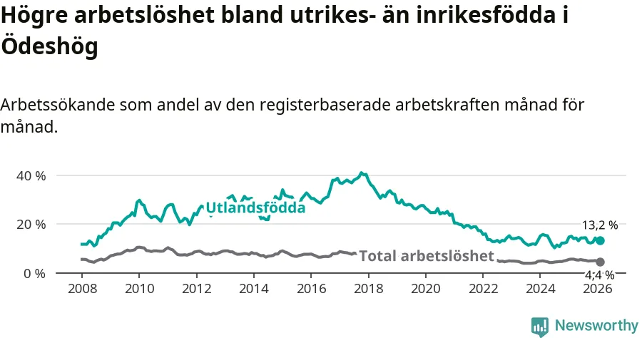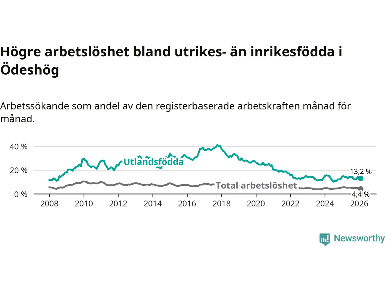 Skillnaden i arbetslöshet mellan utrikesfödda och hela befolkningen är 8,8 procentenheter i Ödeshög. Det är en mindre skillnad än för ett år sedan (−0,6 procentenheter).