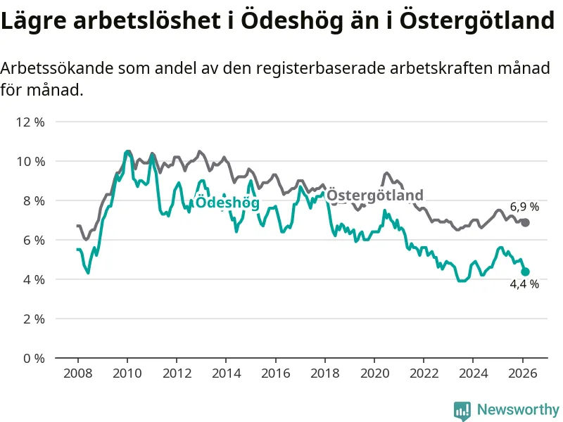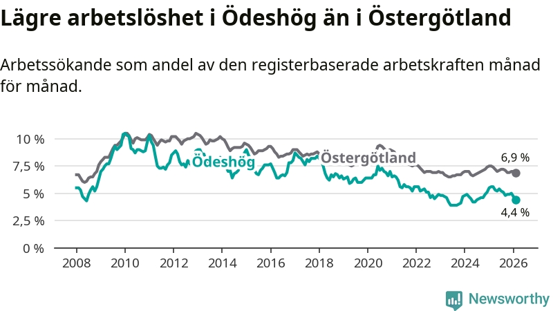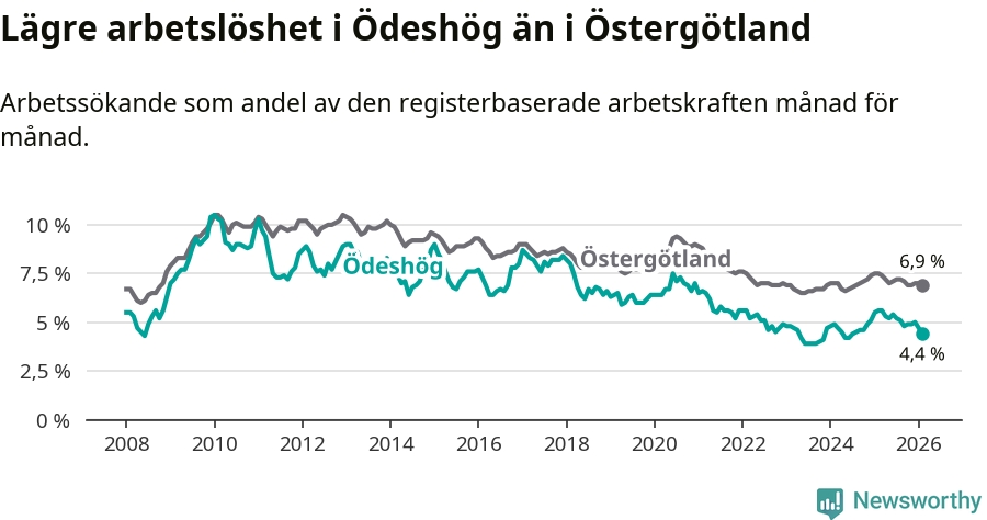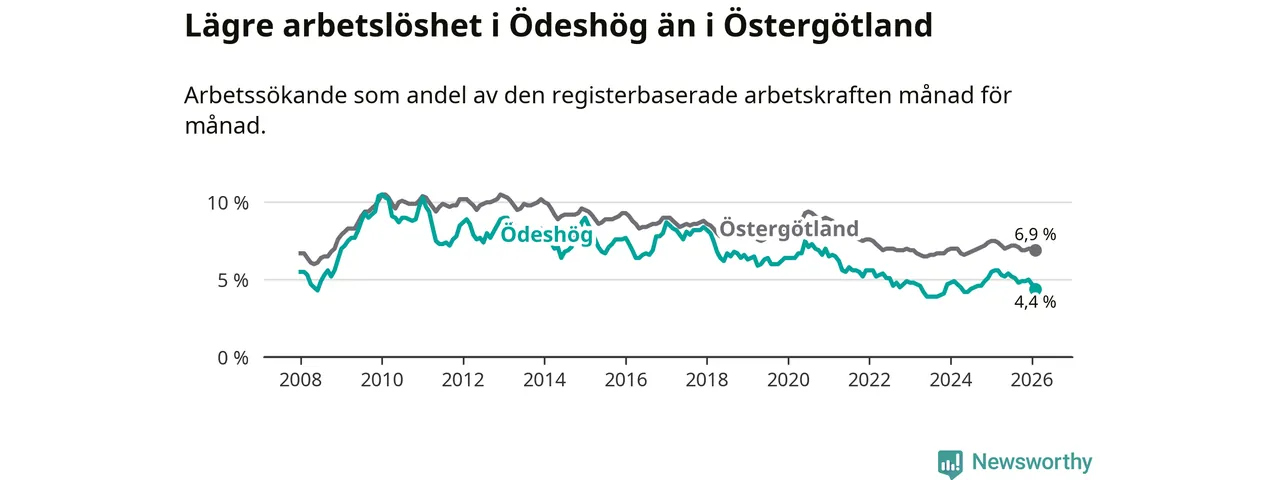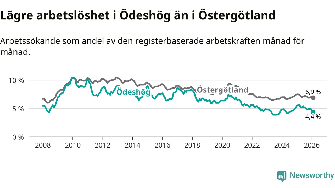 Under februari månad rapporterade Ödeshögs kommun en total arbetslöshet på 4,4 procent. Det är en minskning jämfört med samma tidpunkt i fjol (−1,2 procentenheter). Även i Östergötlands län sjunker arbetslösheten .
