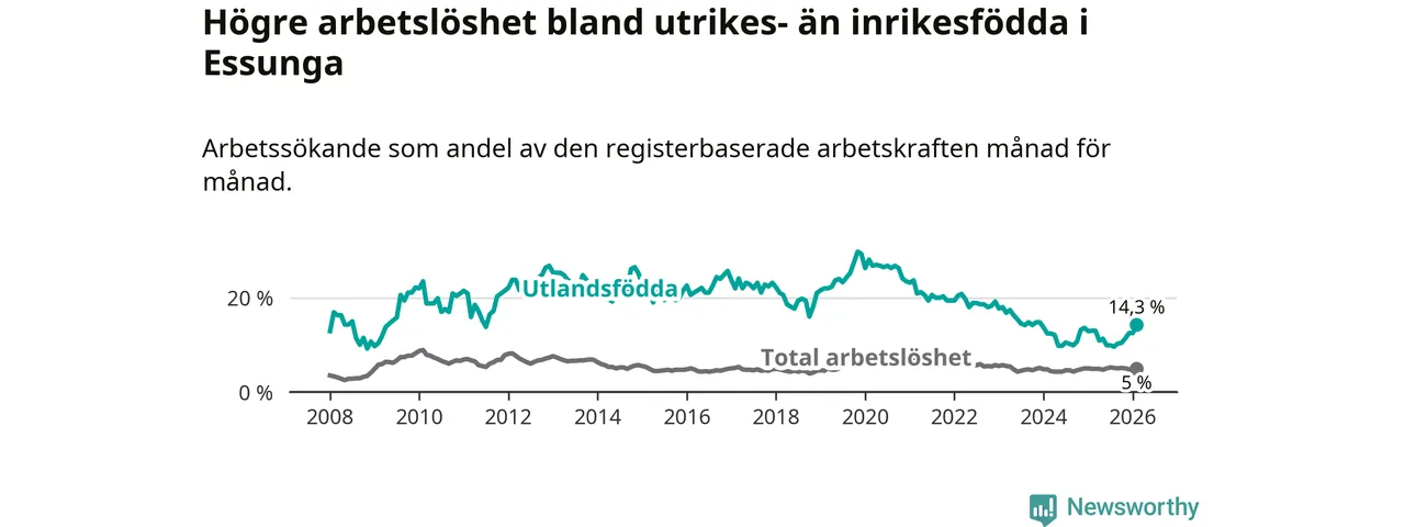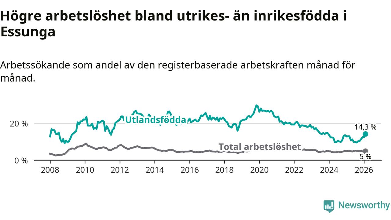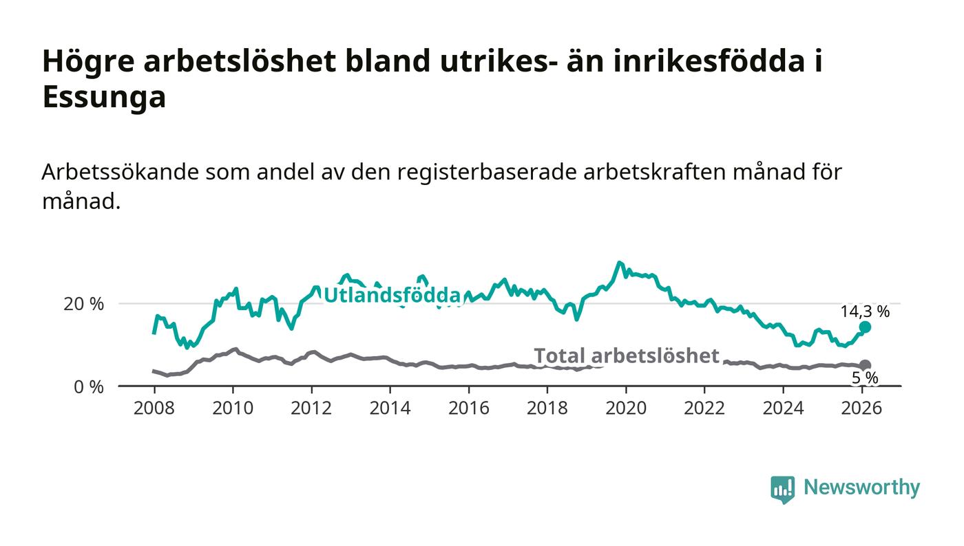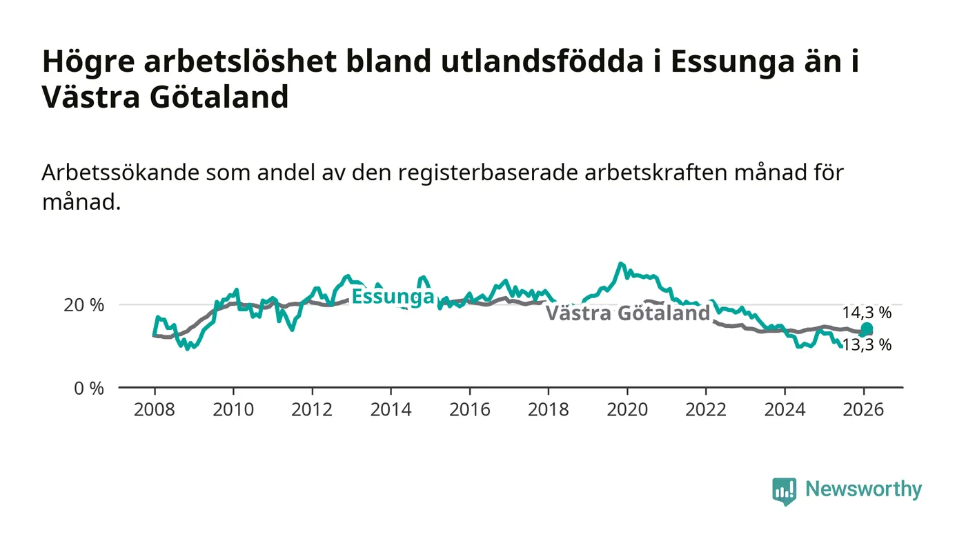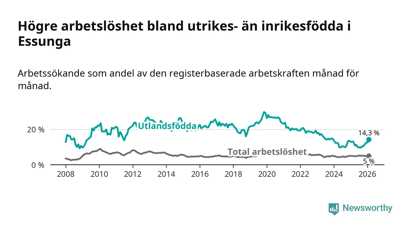Arbetslösheten bland utlandsfödda var 14,3 procent i Essunga under februari månad, motsvarande 40 av 280 personer. Det är 1,3 procentenheter fler än vid samma tidpunkt i fjol (+3 om man räknar personer). Den senaste månadens uppgång innebär ett trendbrott. Under de fyra föregående månaderna hade arbetslösheten bland utlandsfödda varit lägre än motsvarande tidpunkt året innan.
