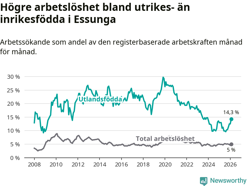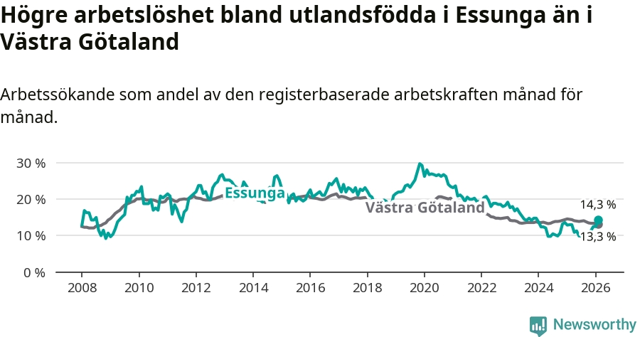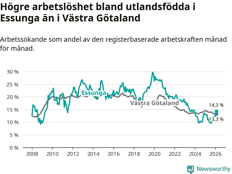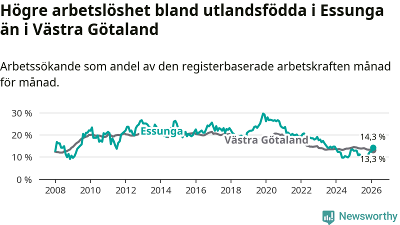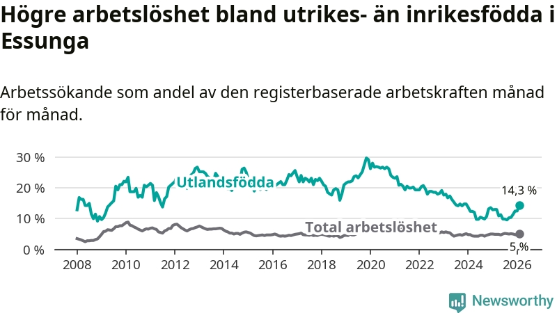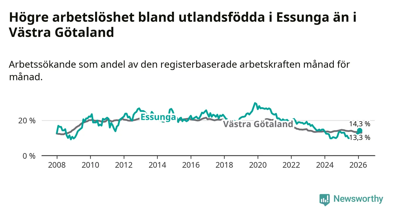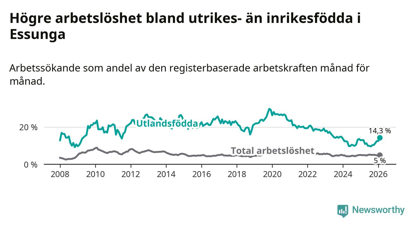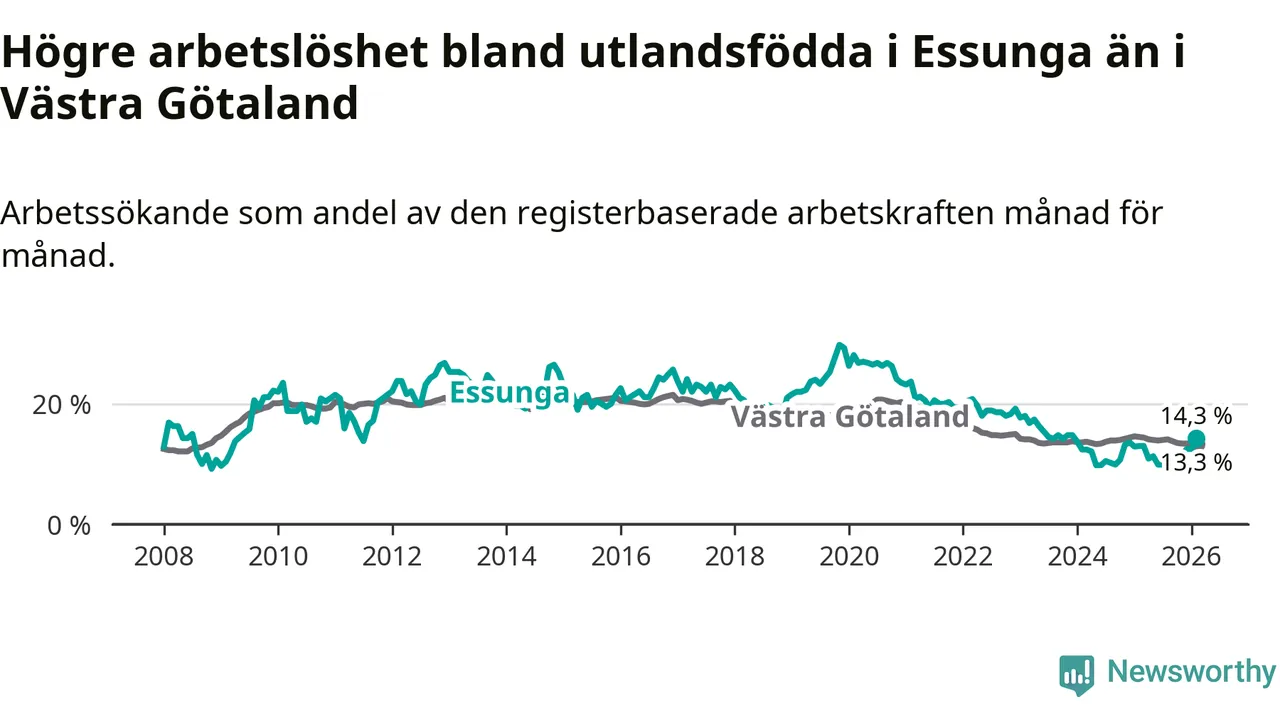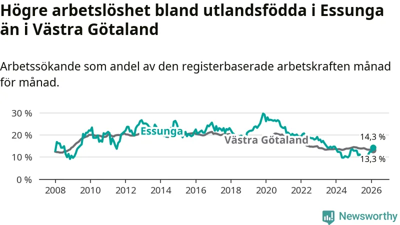 Arbetslösheten bland utlandsfödda var 14,3 procent i Essunga under februari månad, motsvarande 40 av 280 personer. Det är 1,3 procentenheter fler än vid samma tidpunkt i fjol (+3 om man räknar personer). Den senaste månadens uppgång innebär ett trendbrott. Under de fyra föregående månaderna hade arbetslösheten bland utlandsfödda varit lägre än motsvarande tidpunkt året innan.