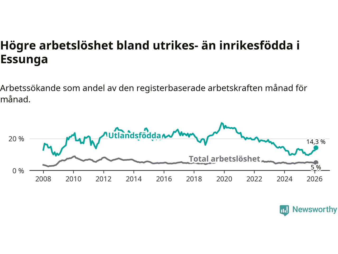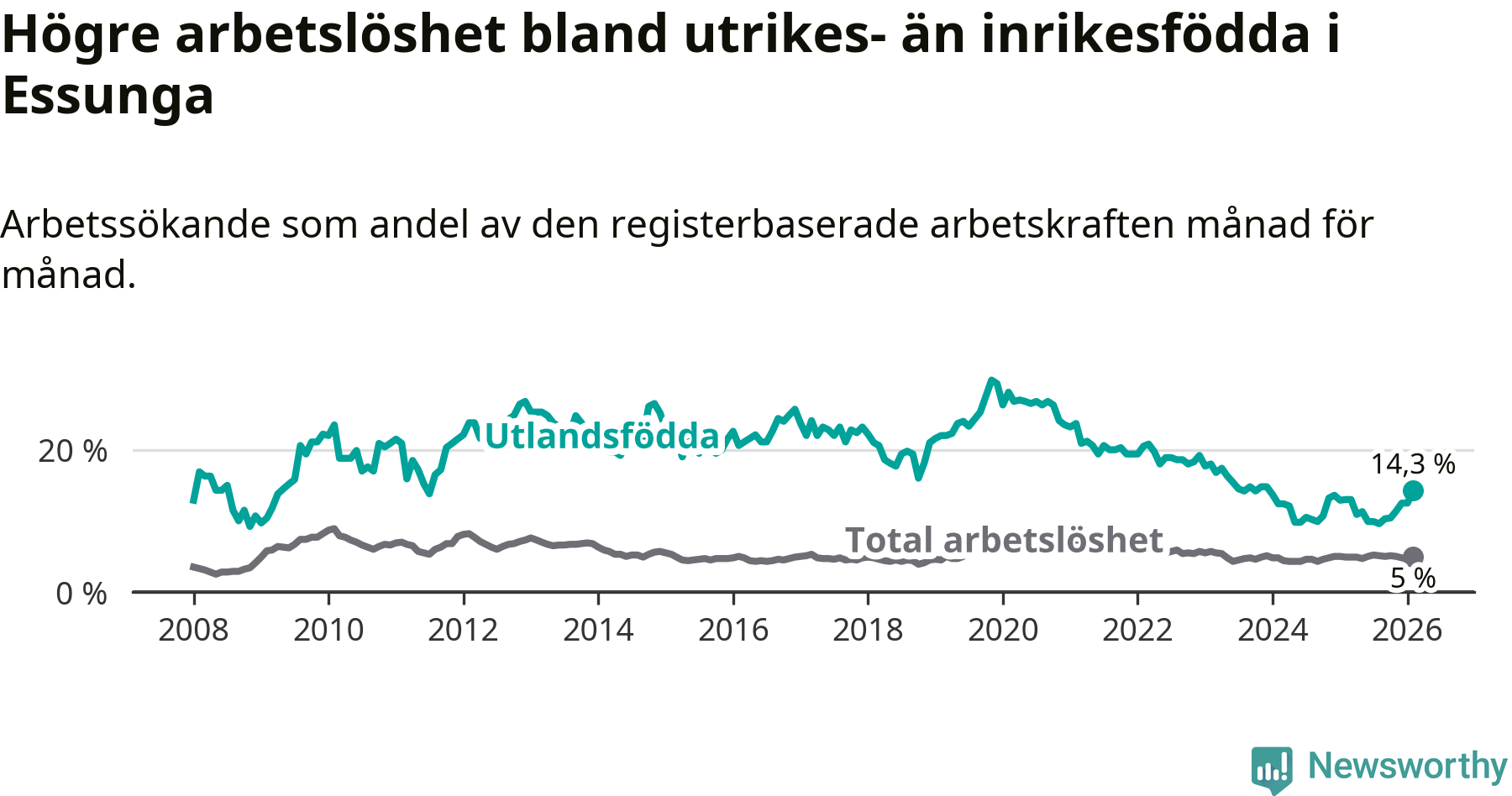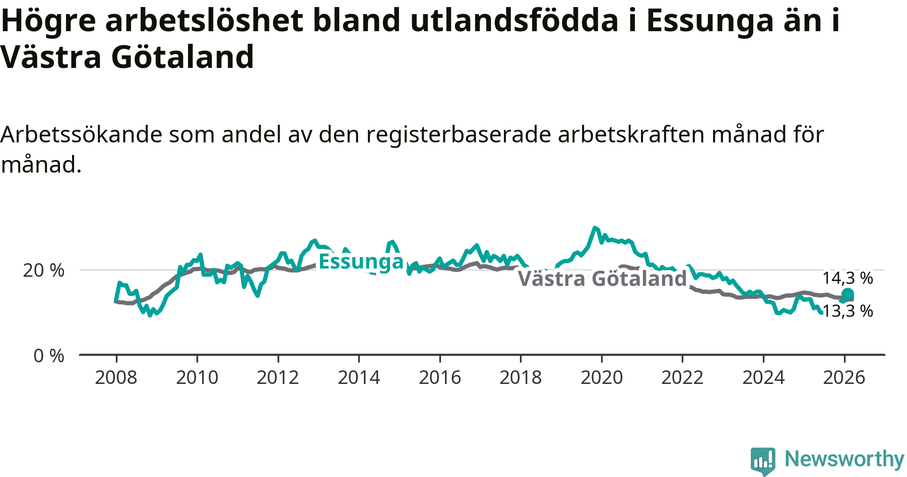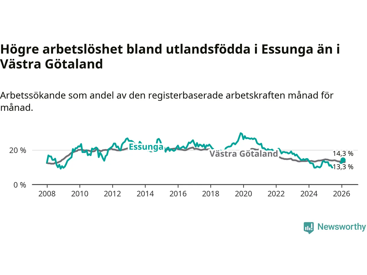 Arbetslösheten bland utlandsfödda var 14,3 procent i Essunga under februari månad, motsvarande 40 av 280 personer. Det är 1,3 procentenheter fler än vid samma tidpunkt i fjol (+3 om man räknar personer). Den senaste månadens uppgång innebär ett trendbrott. Under de fyra föregående månaderna hade arbetslösheten bland utlandsfödda varit lägre än motsvarande tidpunkt året innan.