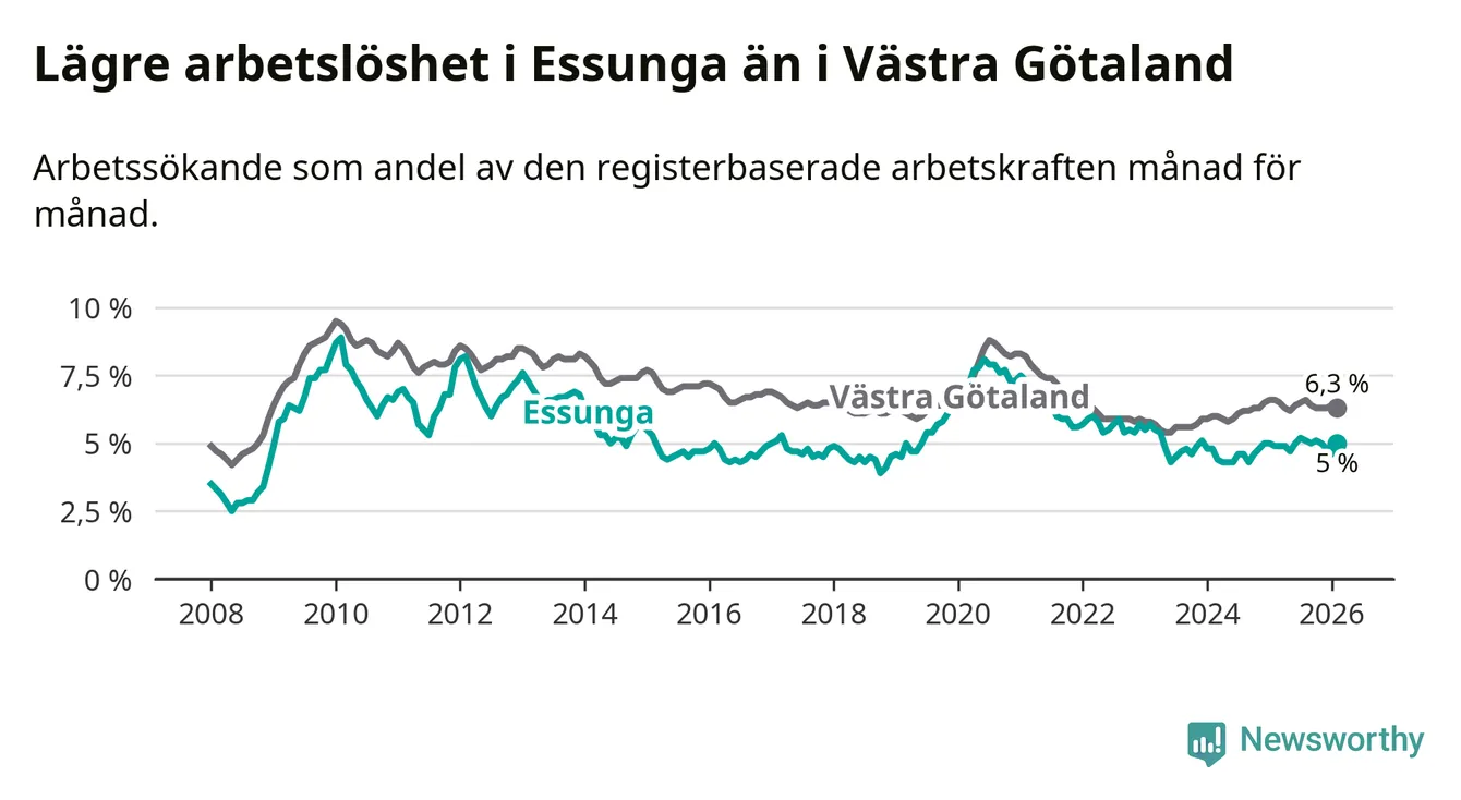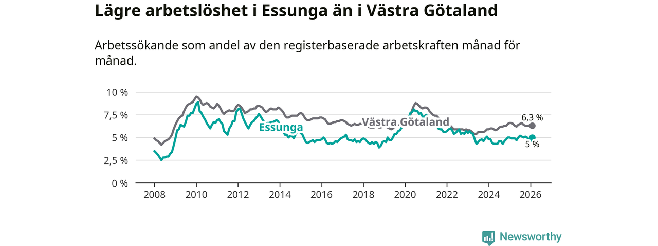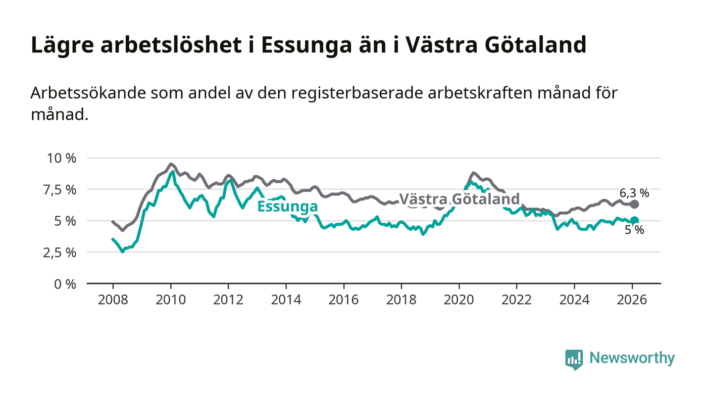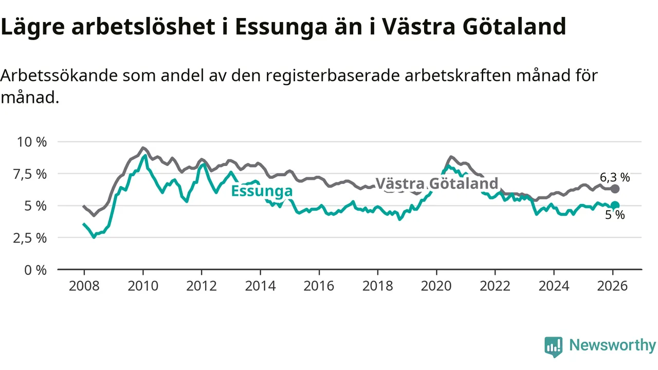 Anmärkningsvärt är att arbetslösheten nu, för första gången sedan januari 2024, är högre i Essunga än snittet i Västra Götaland.