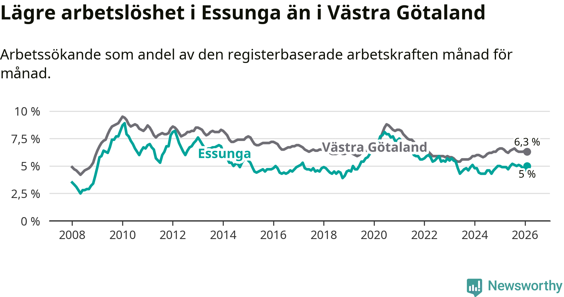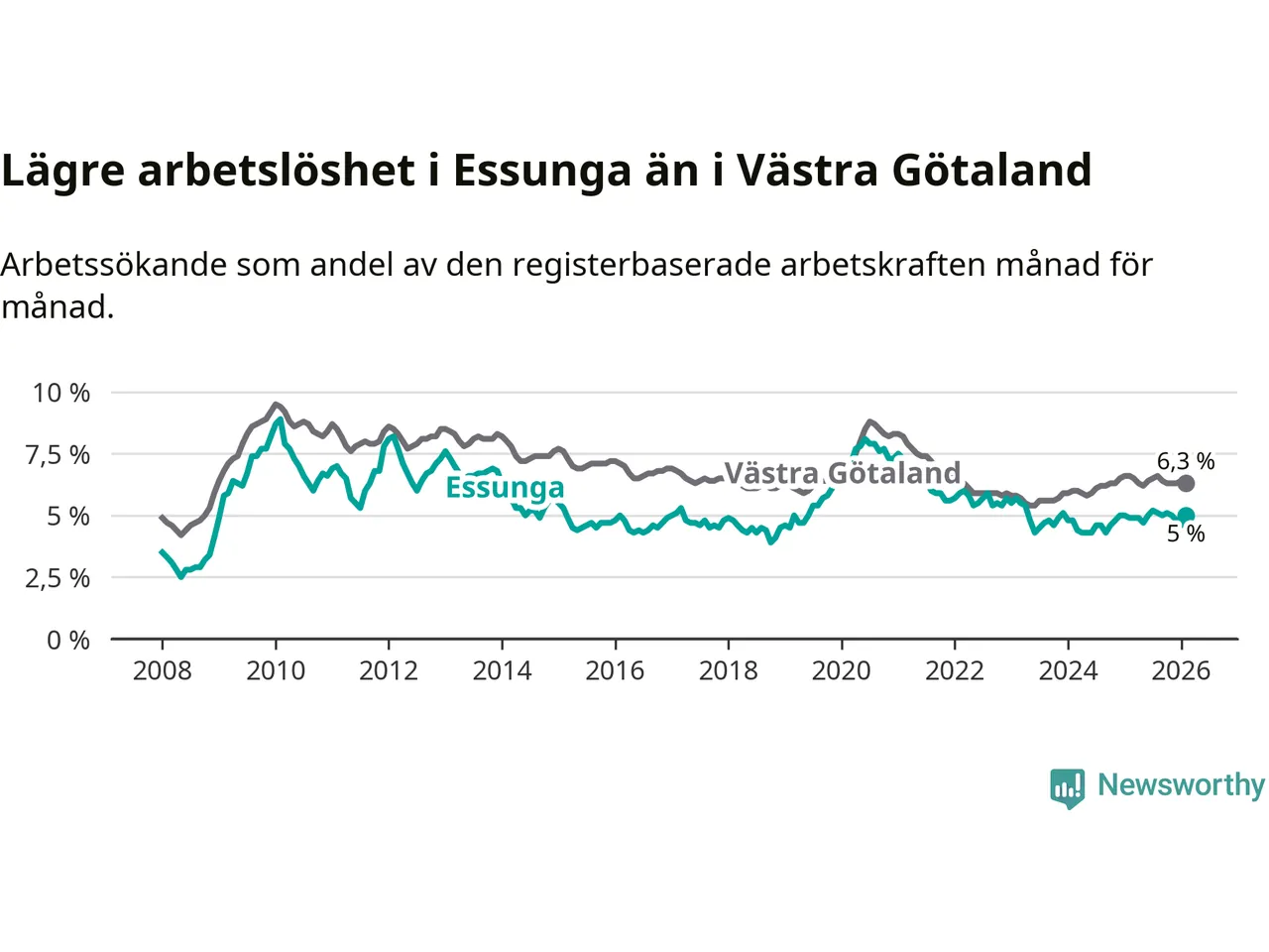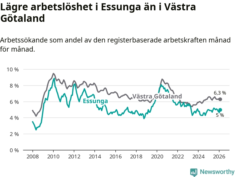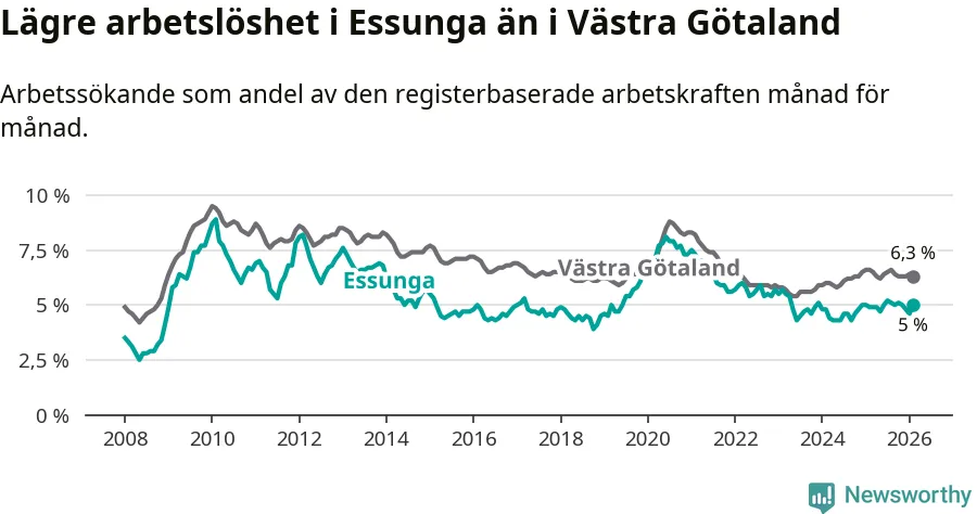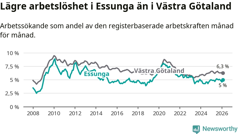 Anmärkningsvärt är att arbetslösheten nu, för första gången sedan januari 2024, är högre i Essunga än snittet i Västra Götaland.