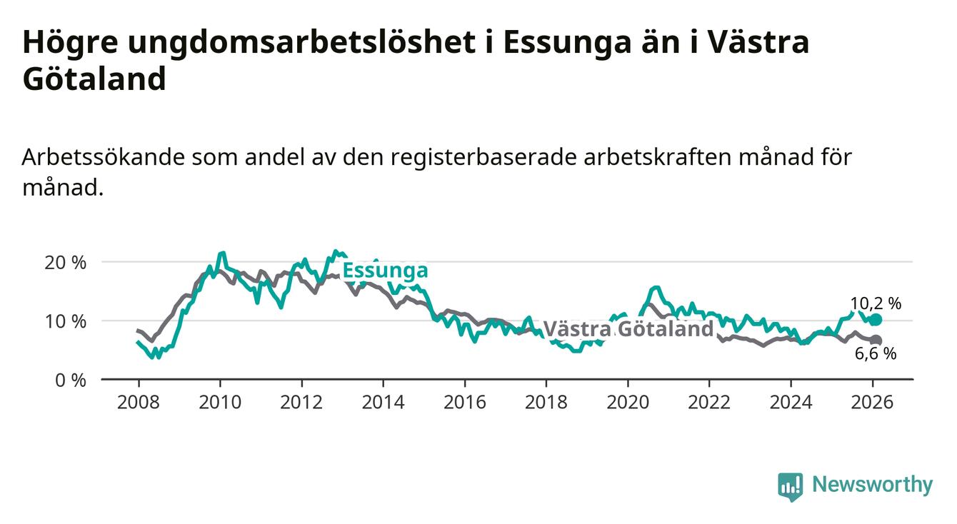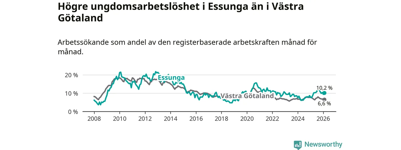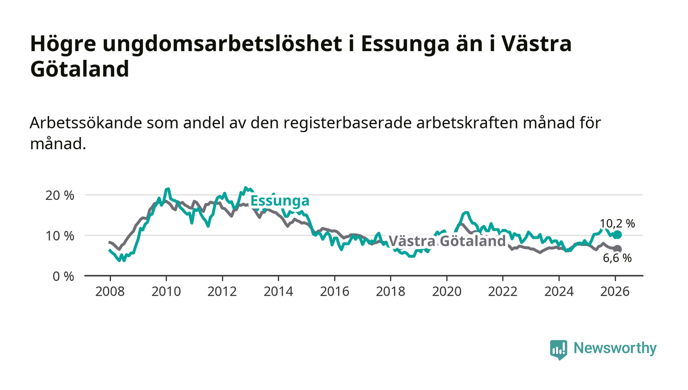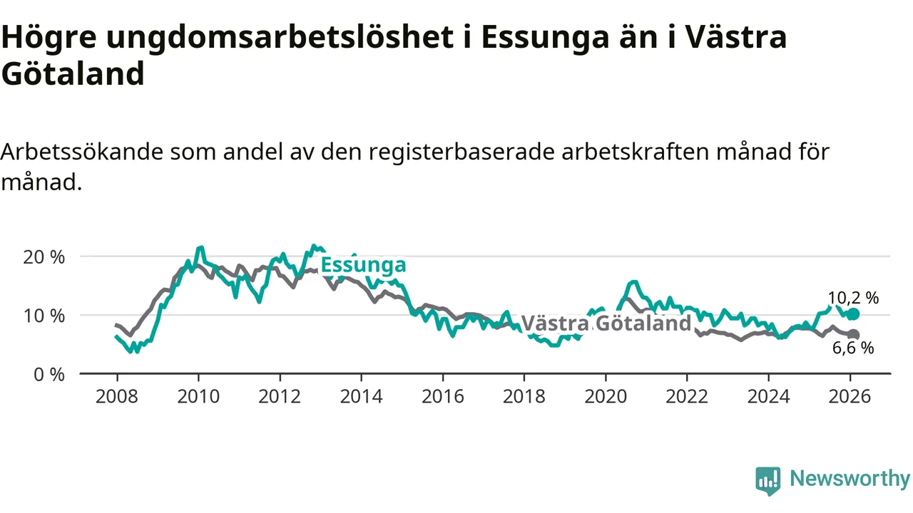 Medan Essunga har lägre total arbetslöshet än Västra Götaland, ligger ungdomsarbetslösheten 3,6 procentenheter högre i Essunga.