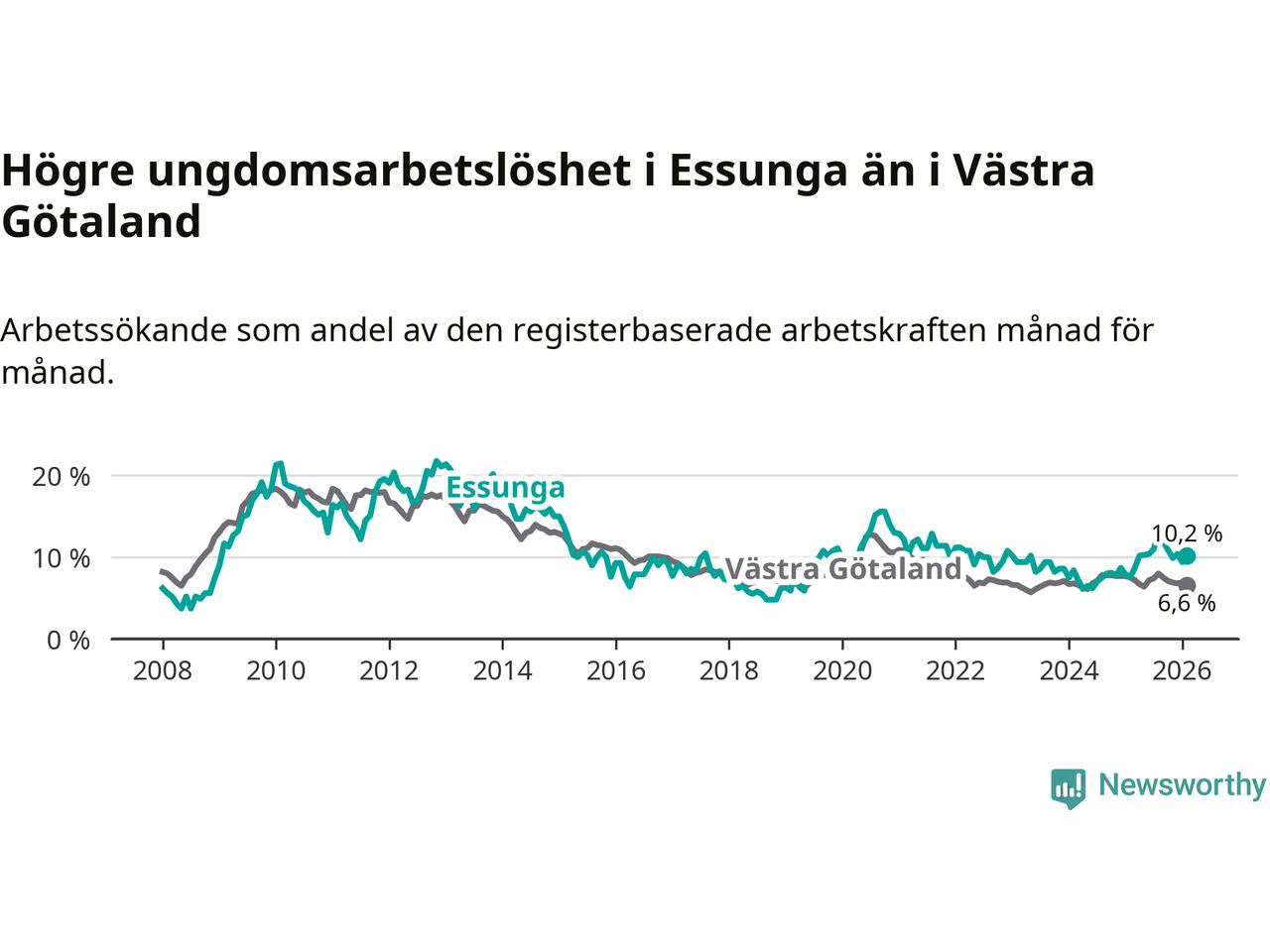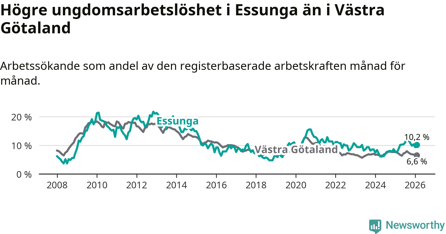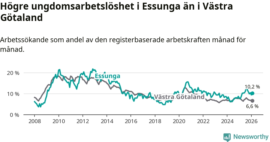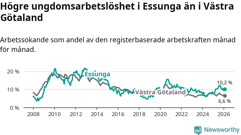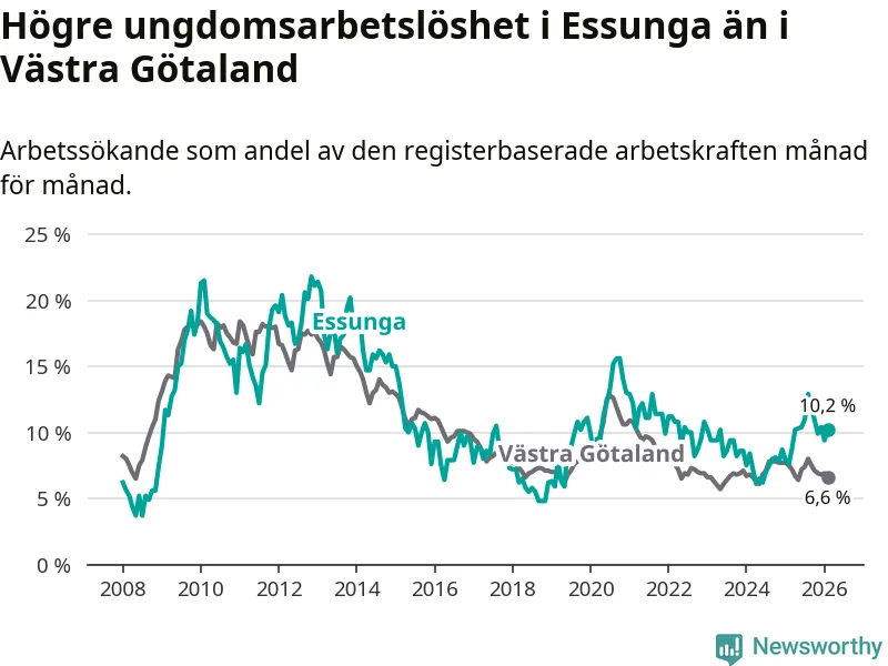Medan Essunga har lägre total arbetslöshet än Västra Götaland, ligger ungdomsarbetslösheten 3,6 procentenheter högre i Essunga.