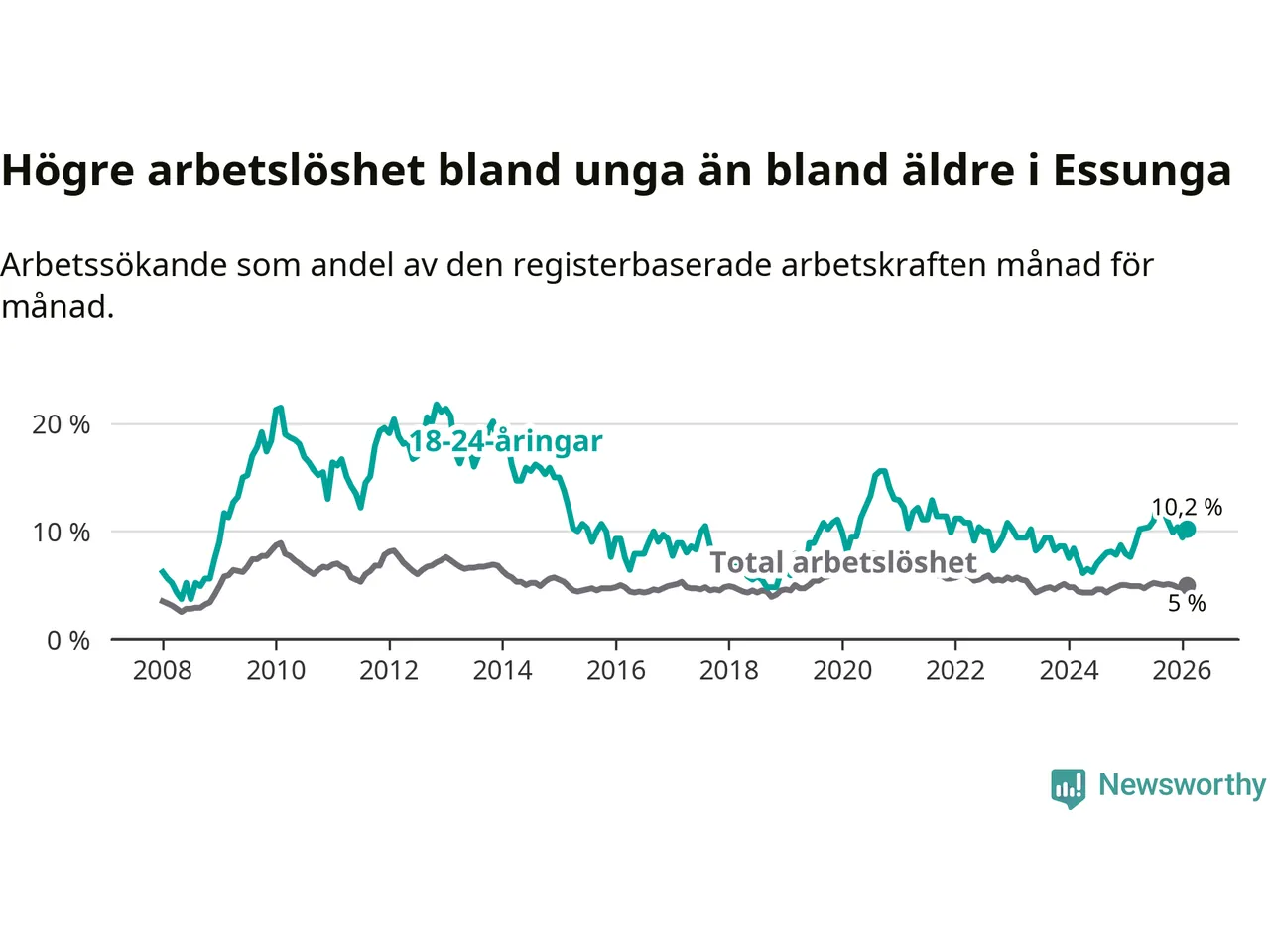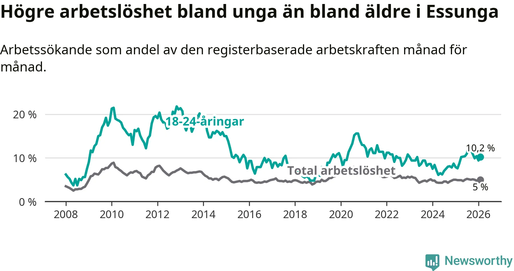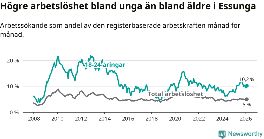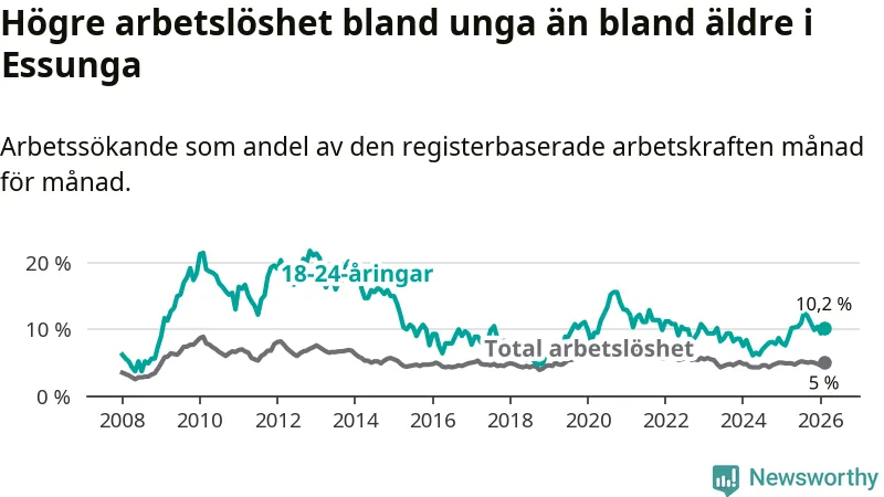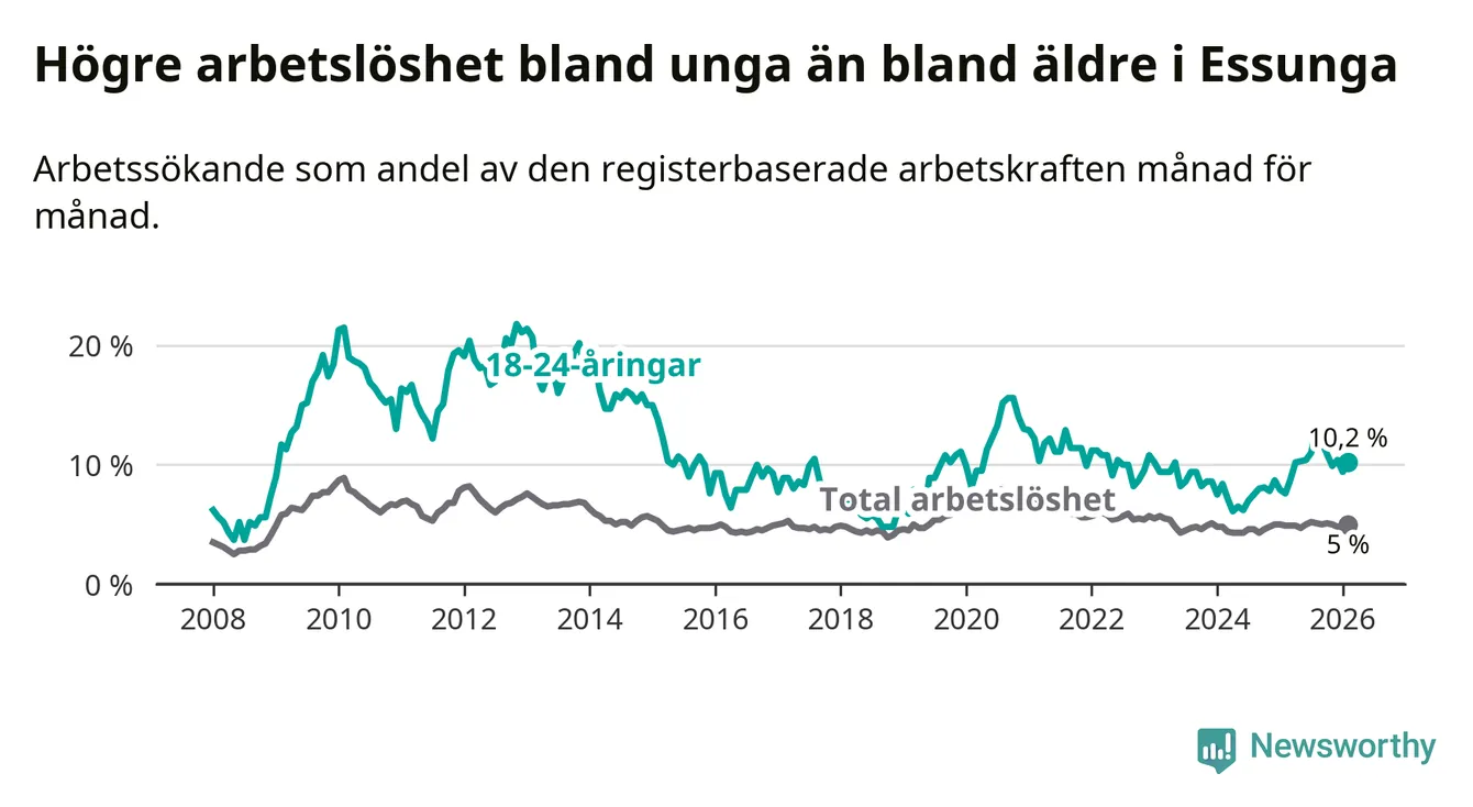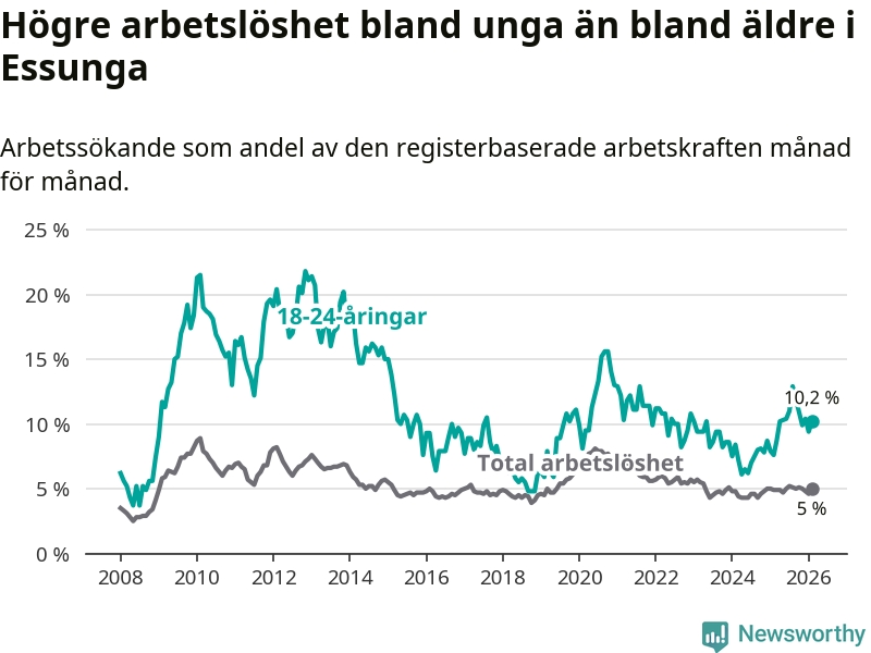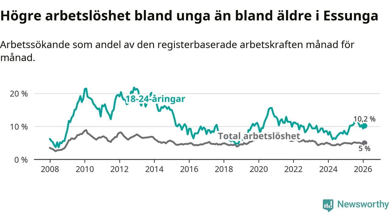 I och med den senaste månadens uppgång har de ungas arbetslöshet i Essunga stigit tolv månader i följd (upp från 7,6 procent i februari 2025 till 10,2 procent nu).