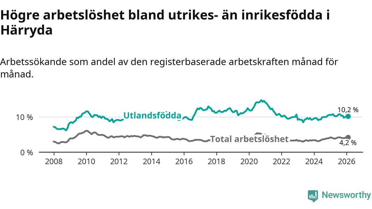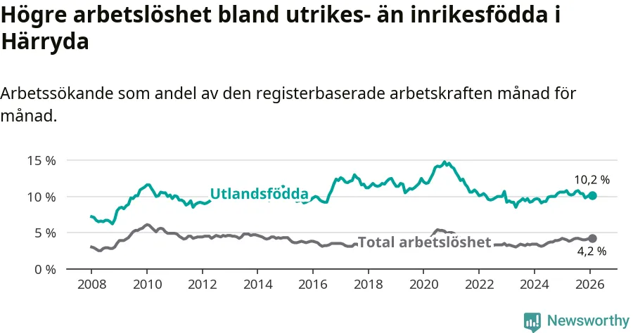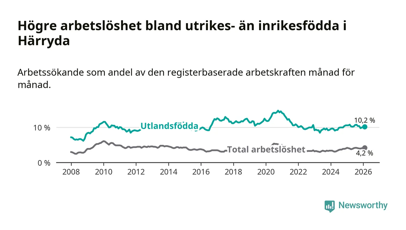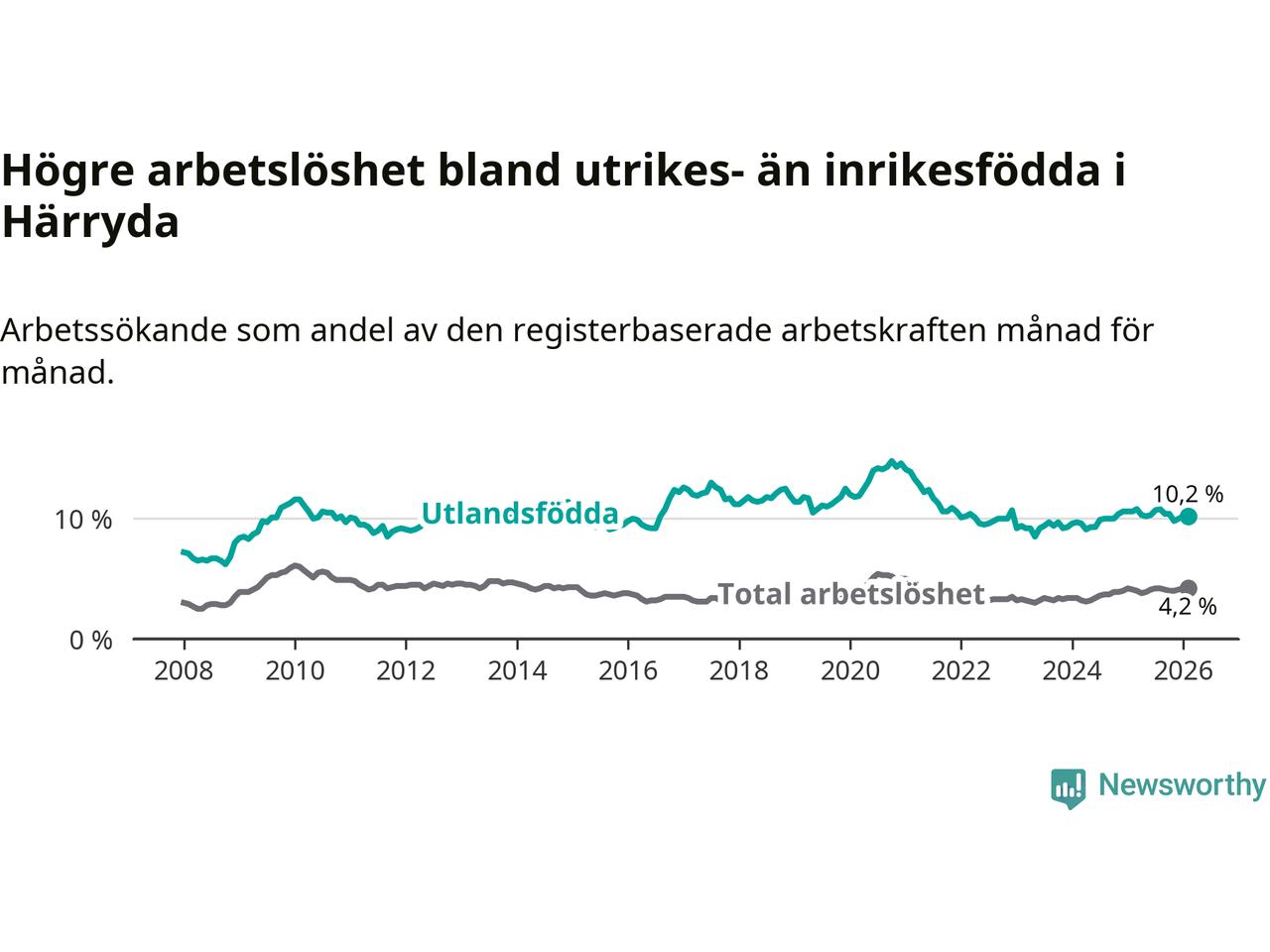 Arbetslösheten bland utlandsfödda var 10,2 procent i Härryda under februari månad, motsvarande 336 av 3 294 personer. Det är 0,4 procentenheter färre än vid samma tidpunkt i fjol (−11 om man räknar personer).