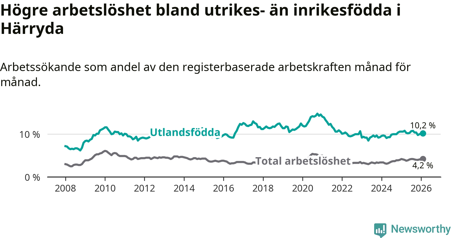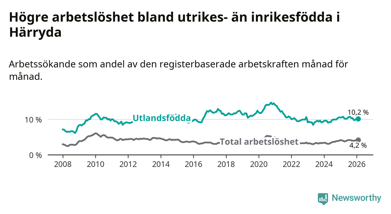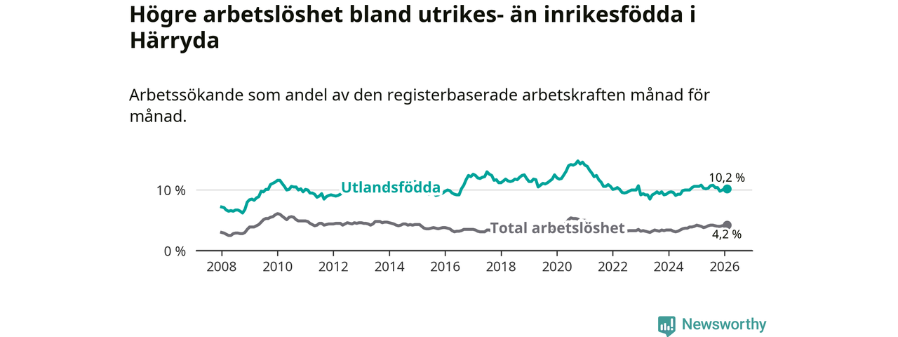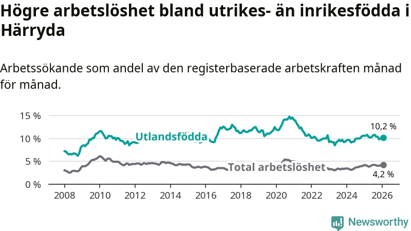 Arbetslösheten bland utlandsfödda var 10,2 procent i Härryda under februari månad, motsvarande 336 av 3 294 personer. Det är 0,4 procentenheter färre än vid samma tidpunkt i fjol (−11 om man räknar personer).