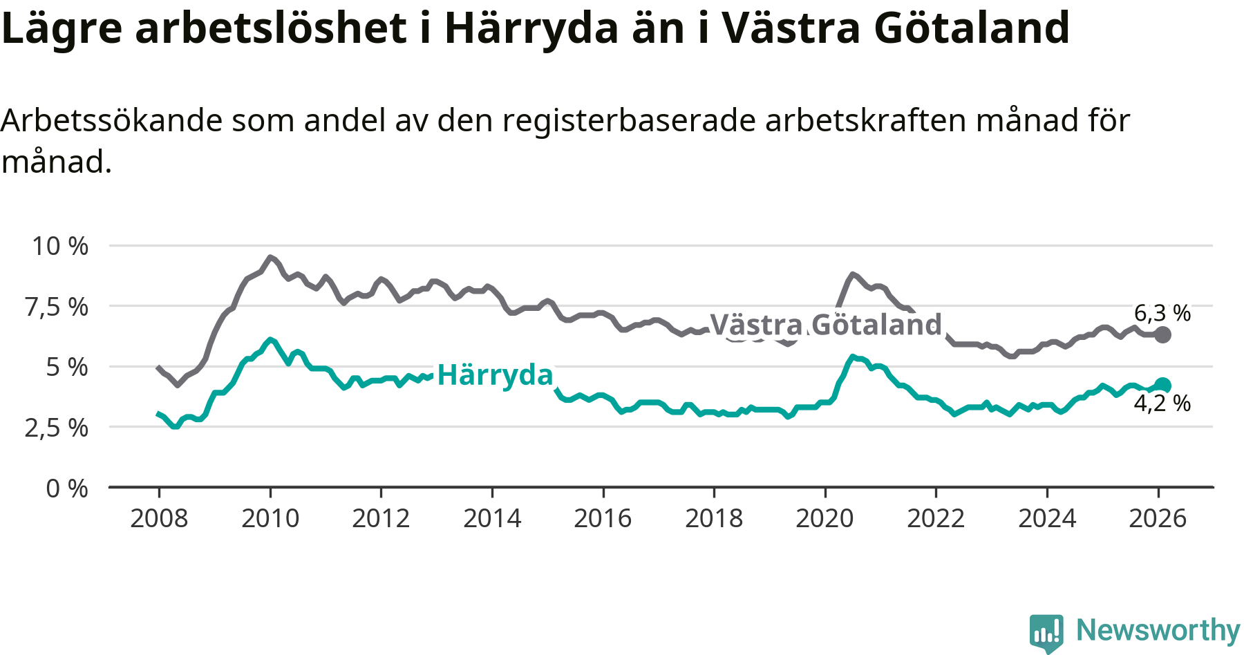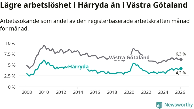 Även om arbetslösheten i Härryda alltså ökar, så ligger den fortfarande under snittet i hela Västra Götalands län (4,2 procent i kommunen, jämfört med 6,3 procent i hela länet). Öckerö har den lägsta arbetslösheten i länet (2,7 procent), medan Gullspång har den högsta (8,3 procent). För att Härryda skulle komma ner i samma arbetslöshetsnivå som Öckerö skulle 311 personer behöva sysselsättas.