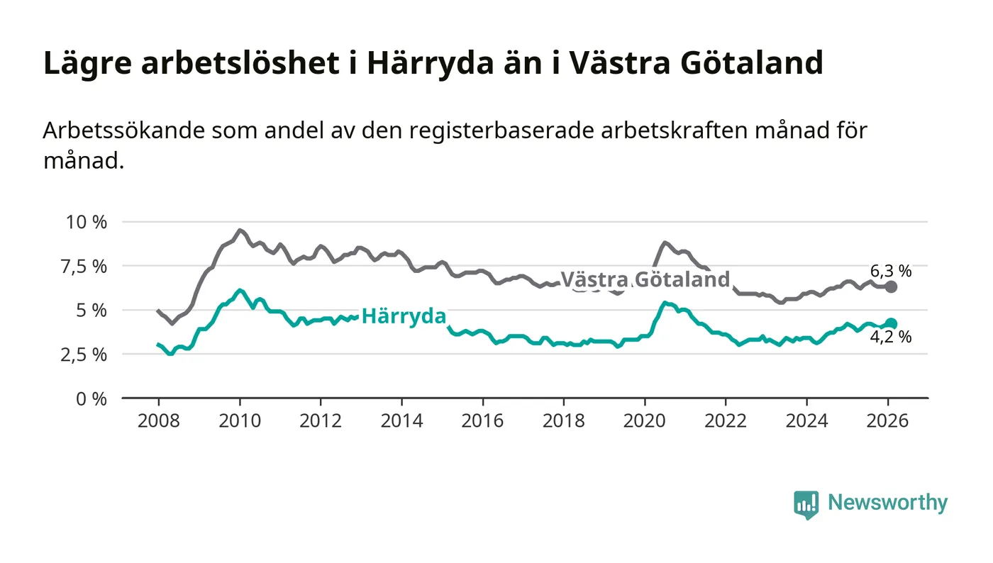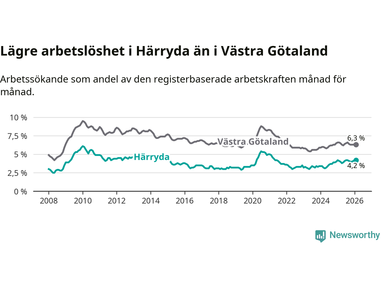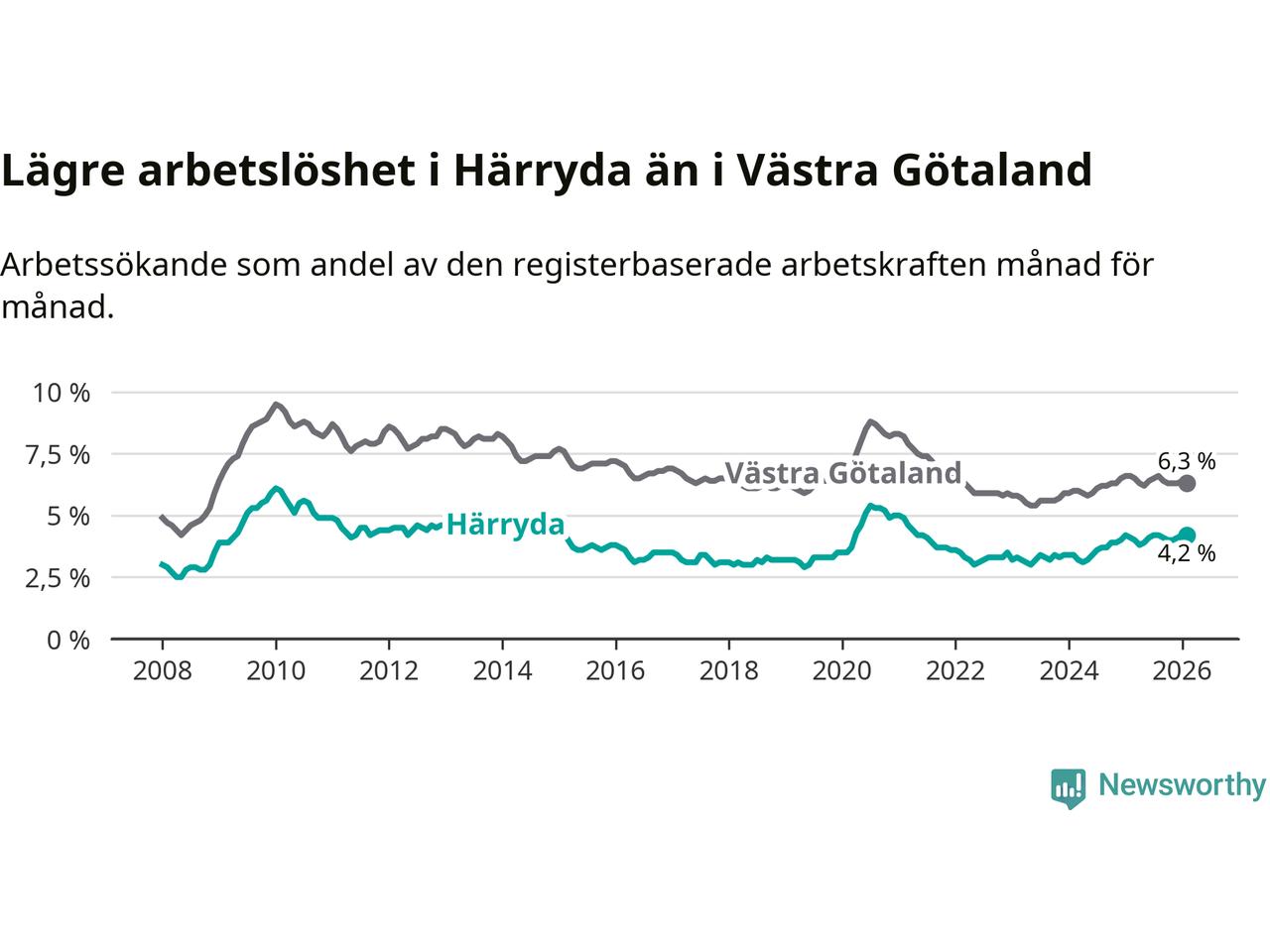 Under februari månad rapporterade Härryda kommun en total arbetslöshet på 4,2 procent. Det är en ökning jämfört med samma tidpunkt i fjol (+0,1 procentenheter). I Västra Götalands län däremot sjunker arbetslösheten .
