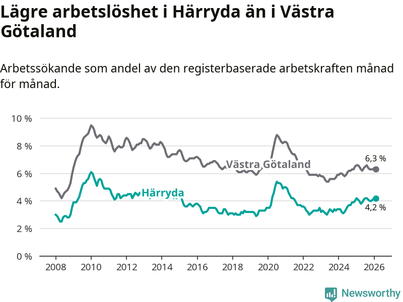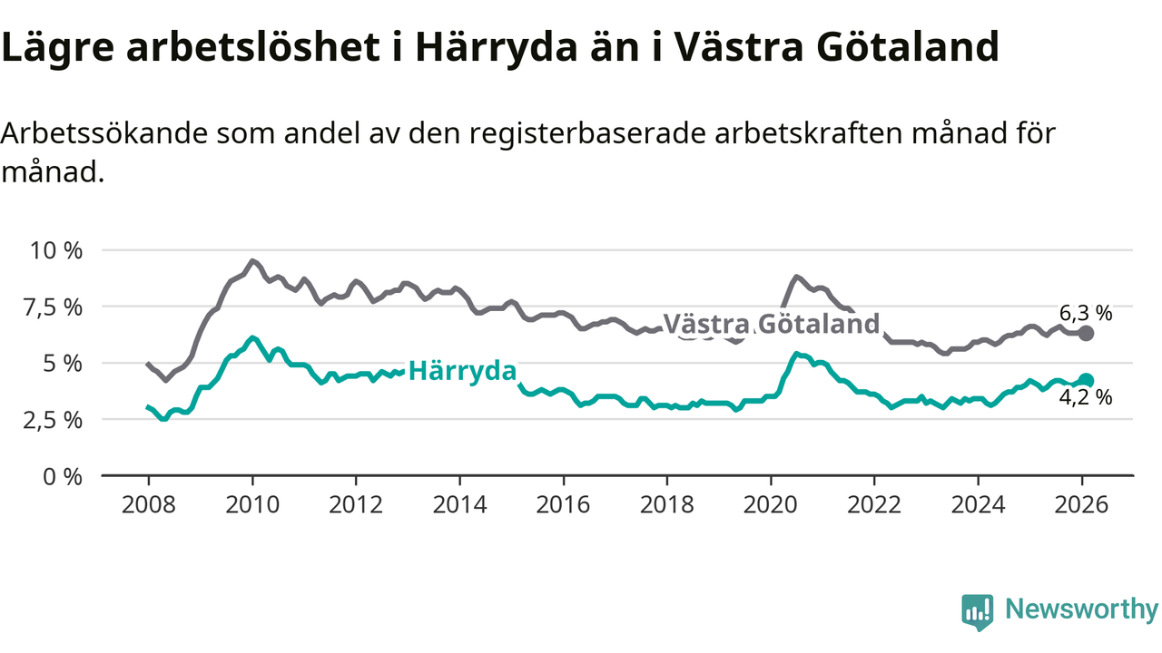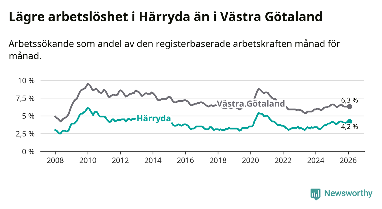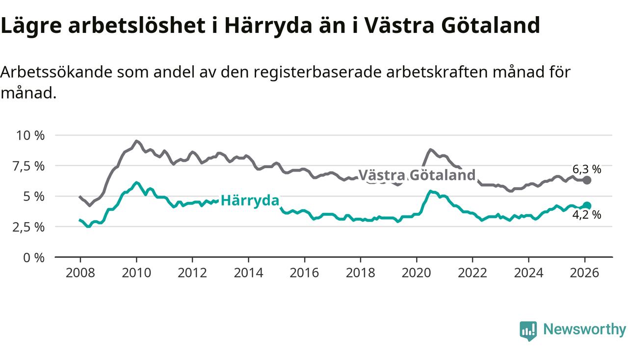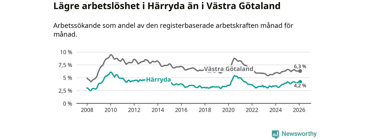 Under februari månad rapporterade Härryda kommun en total arbetslöshet på 4,2 procent. Det är en ökning jämfört med samma tidpunkt i fjol (+0,1 procentenheter). I Västra Götalands län däremot sjunker arbetslösheten .