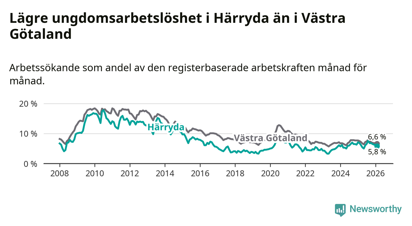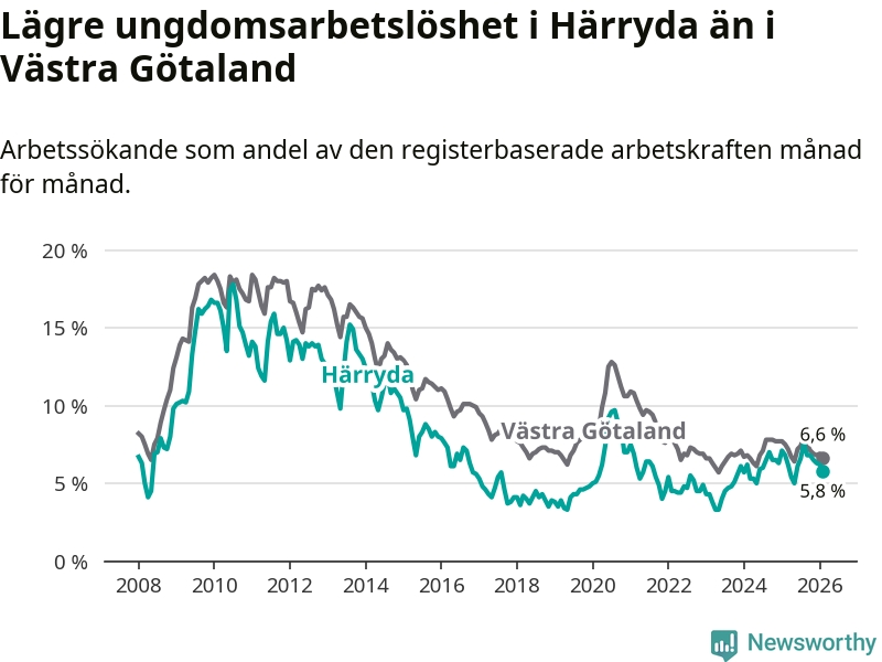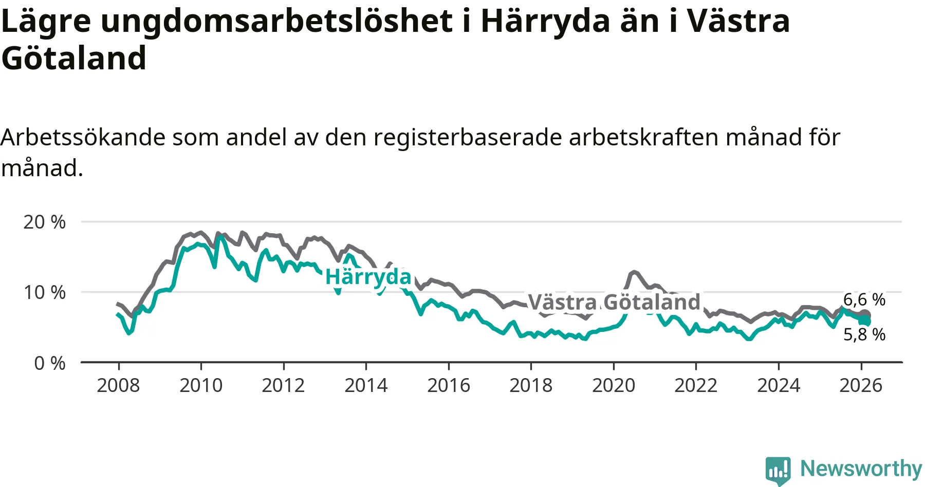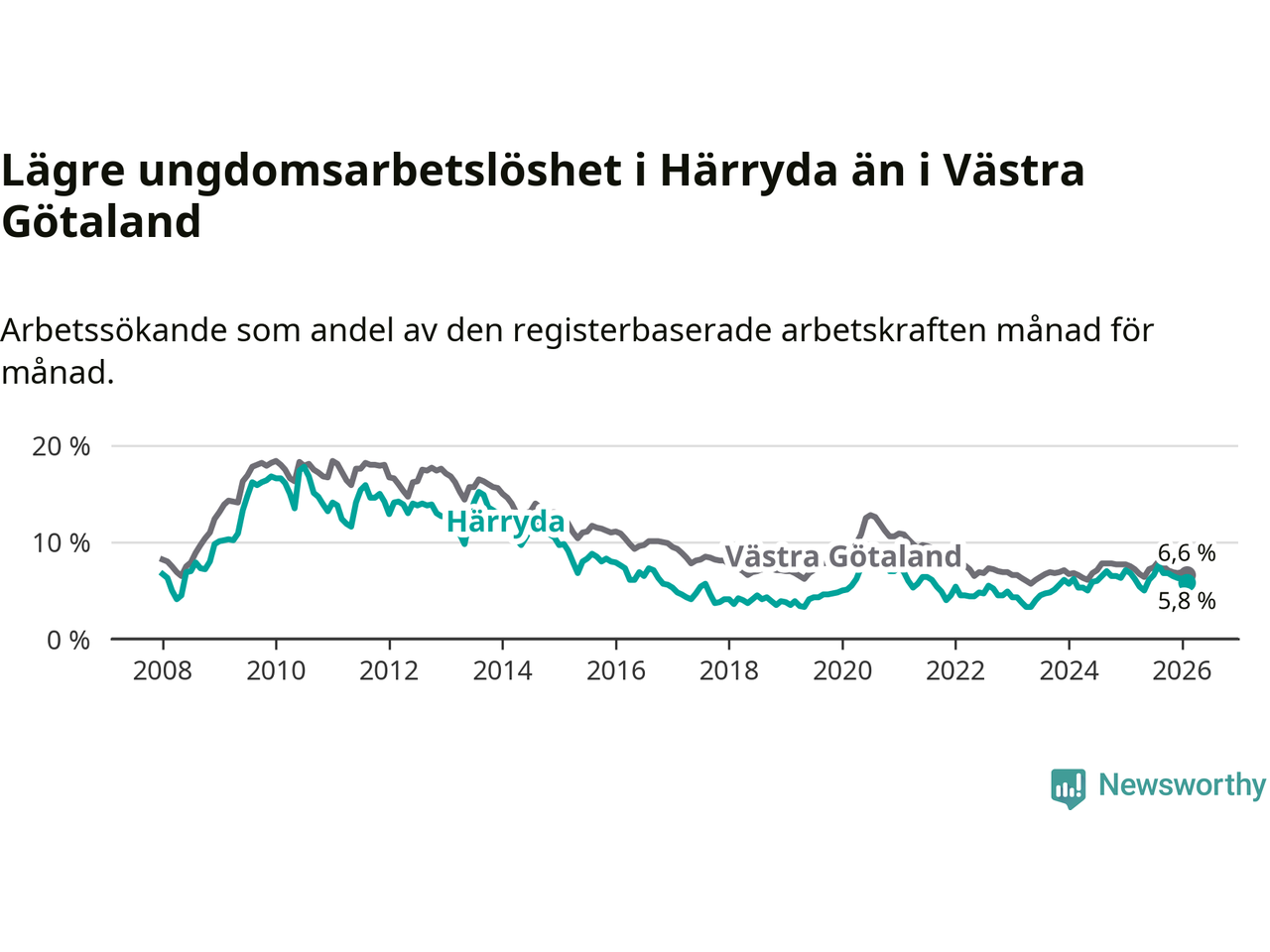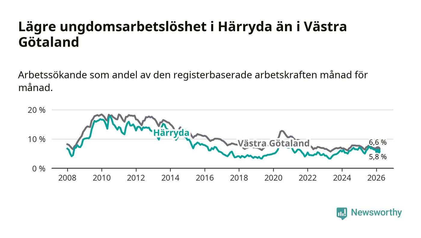Graf: Arbetslöshet bland unga i Härryda kommun och Västra Götalands län