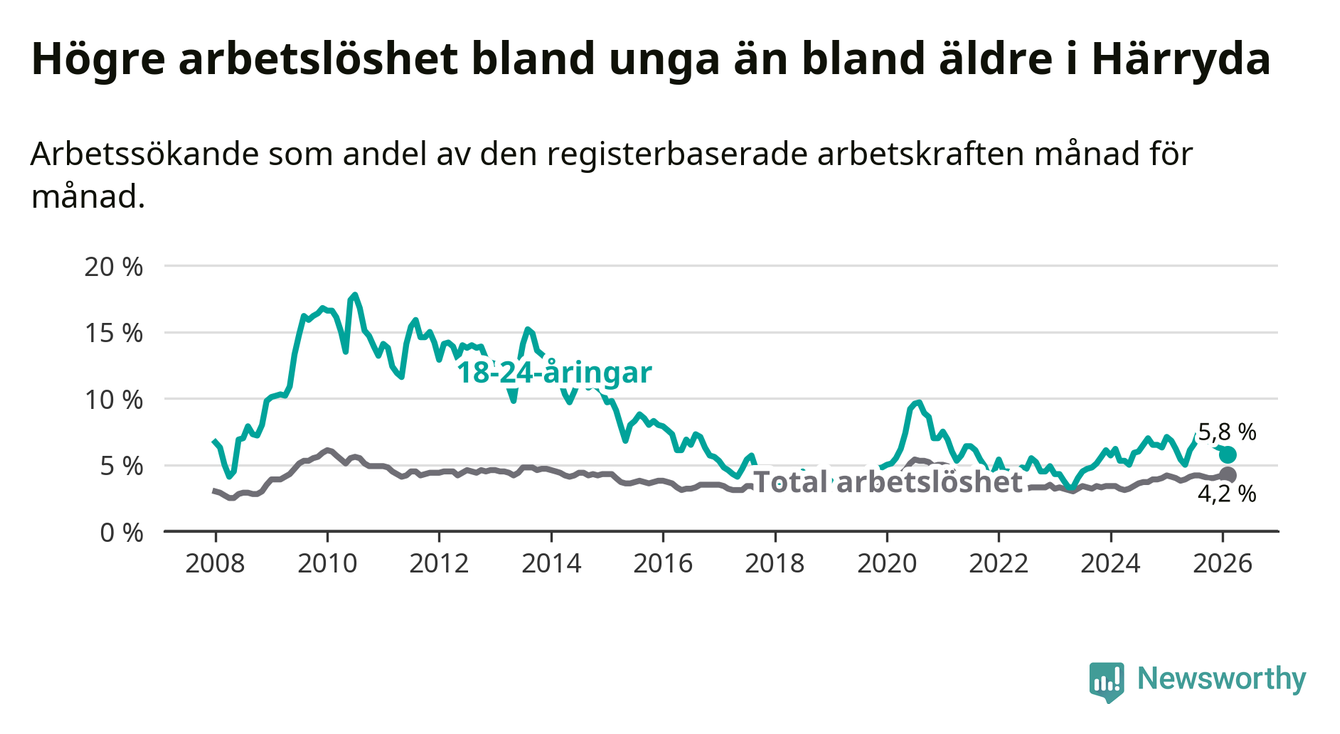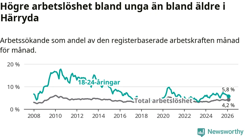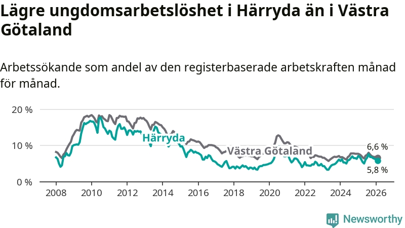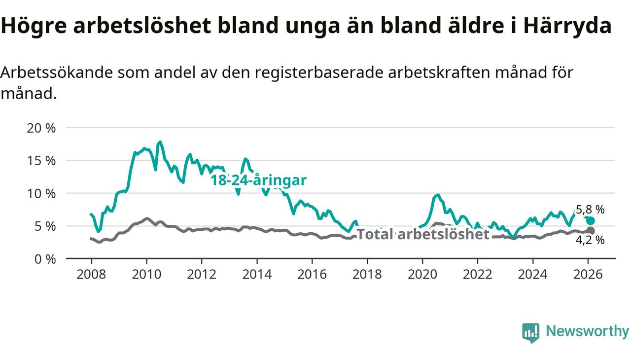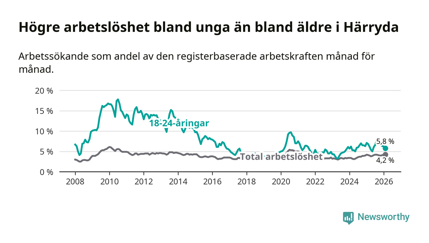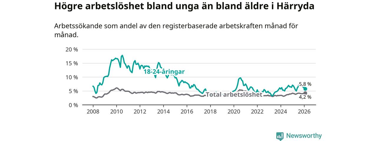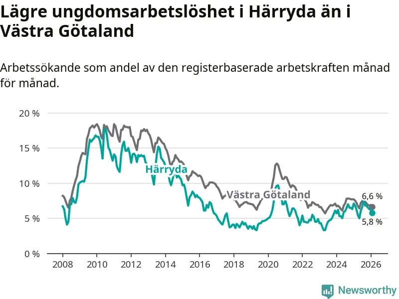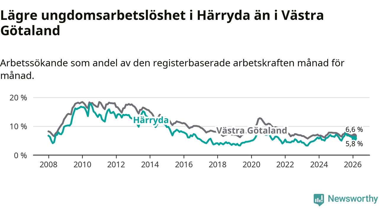 Graf: Arbetslöshet bland unga i Härryda kommun och Västra Götalands län