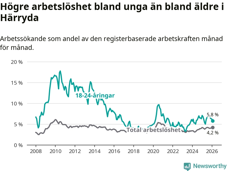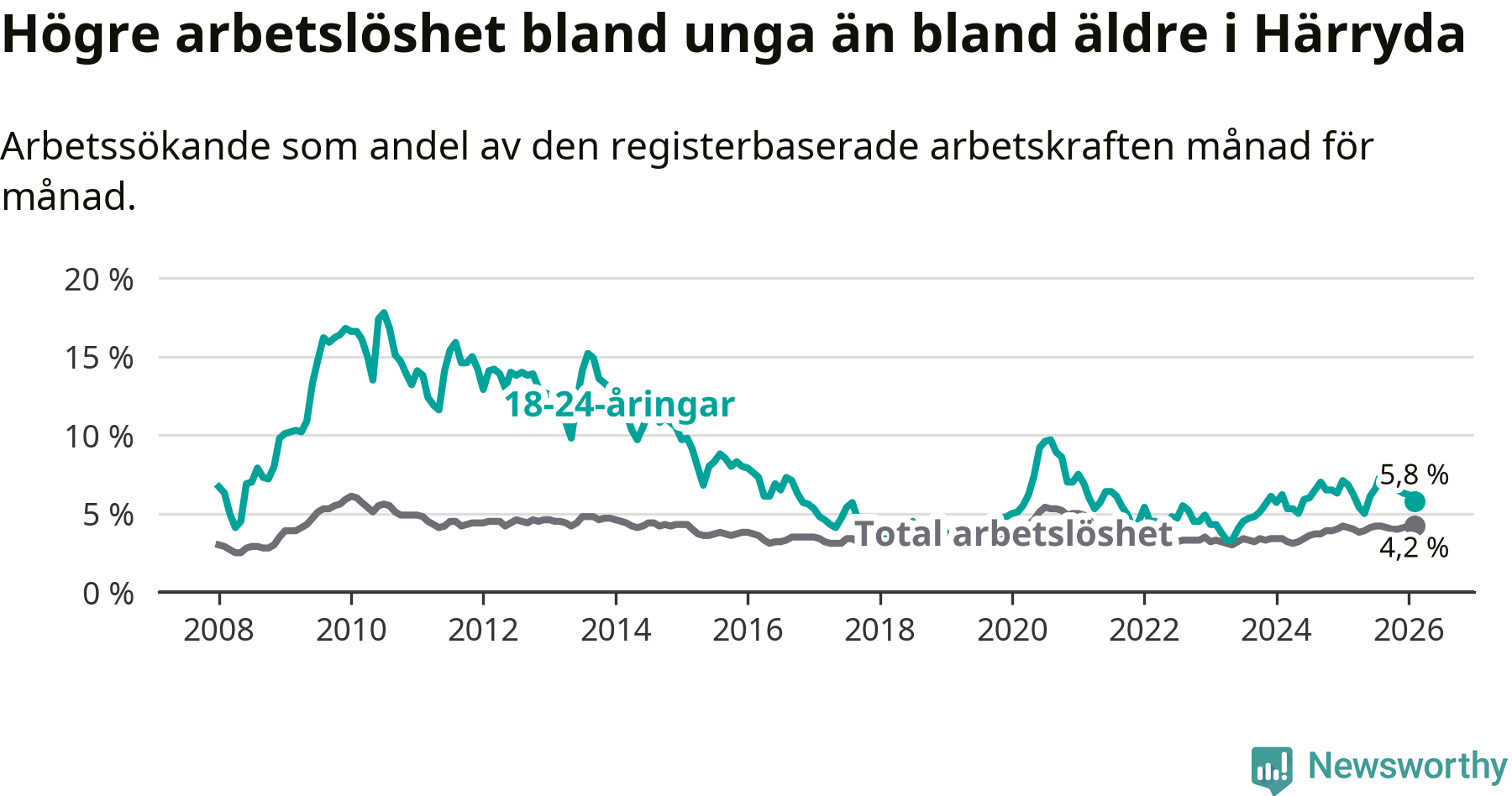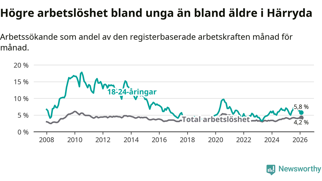 Till skillnad från den totala arbetslösheten sjunker arbetslösheten bland unga (−1 procentenheter). I februari var 5,8 procent av 18–24-åringarna inskrivna som arbetssökande (motsvarande 110 personer). Mäter vi antalet inskrivna ser vi en minskning med 14 personer på ett års sikt.