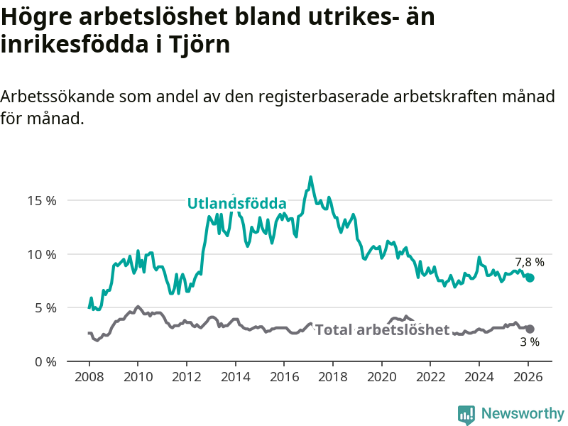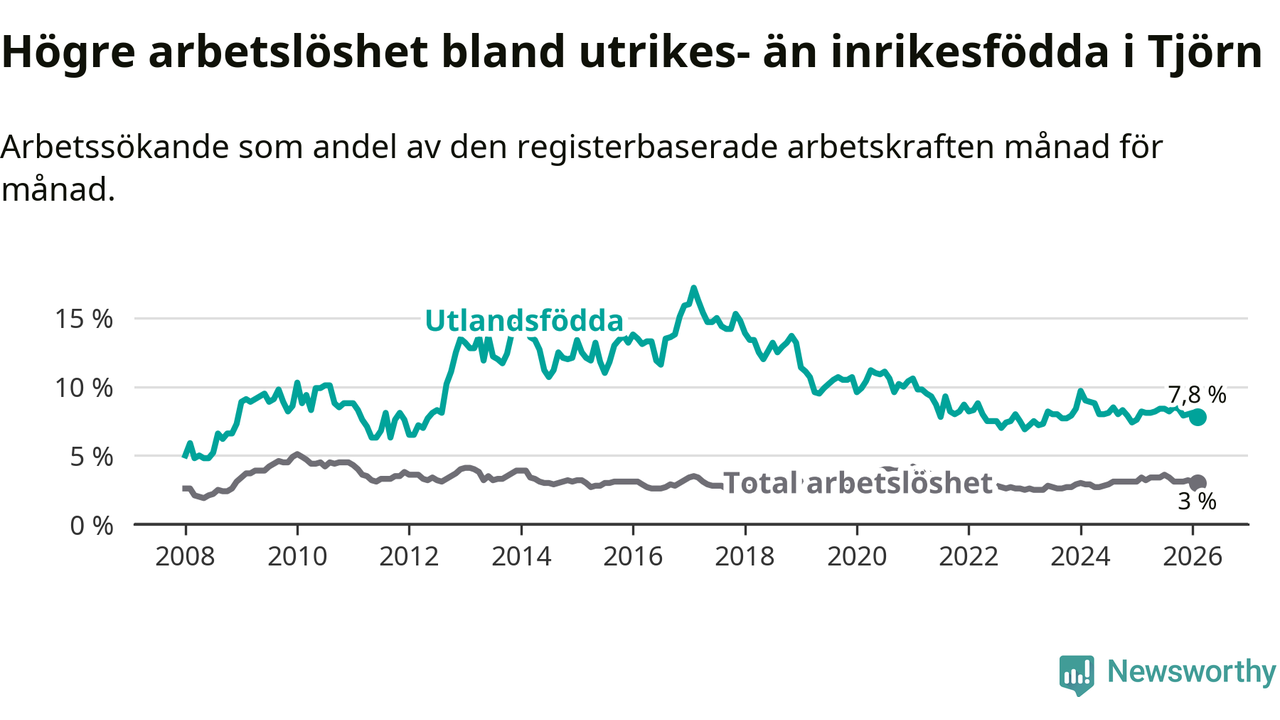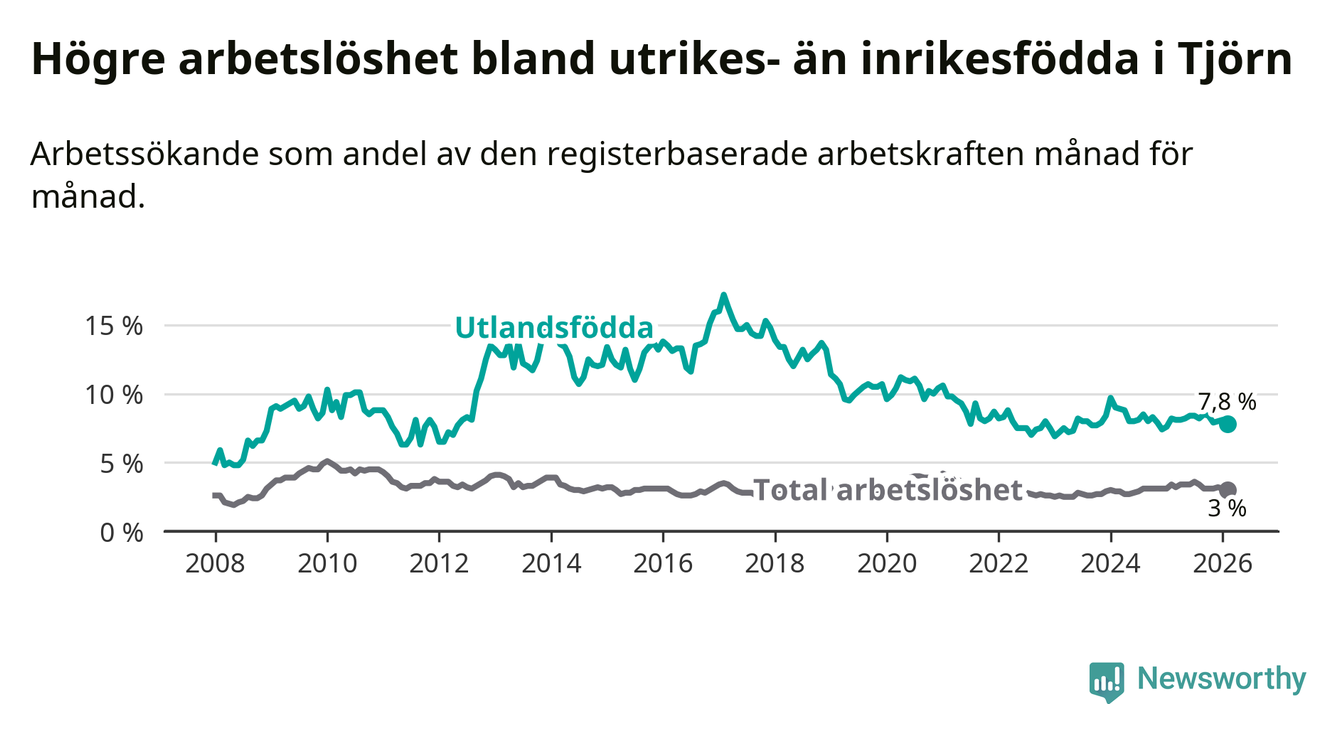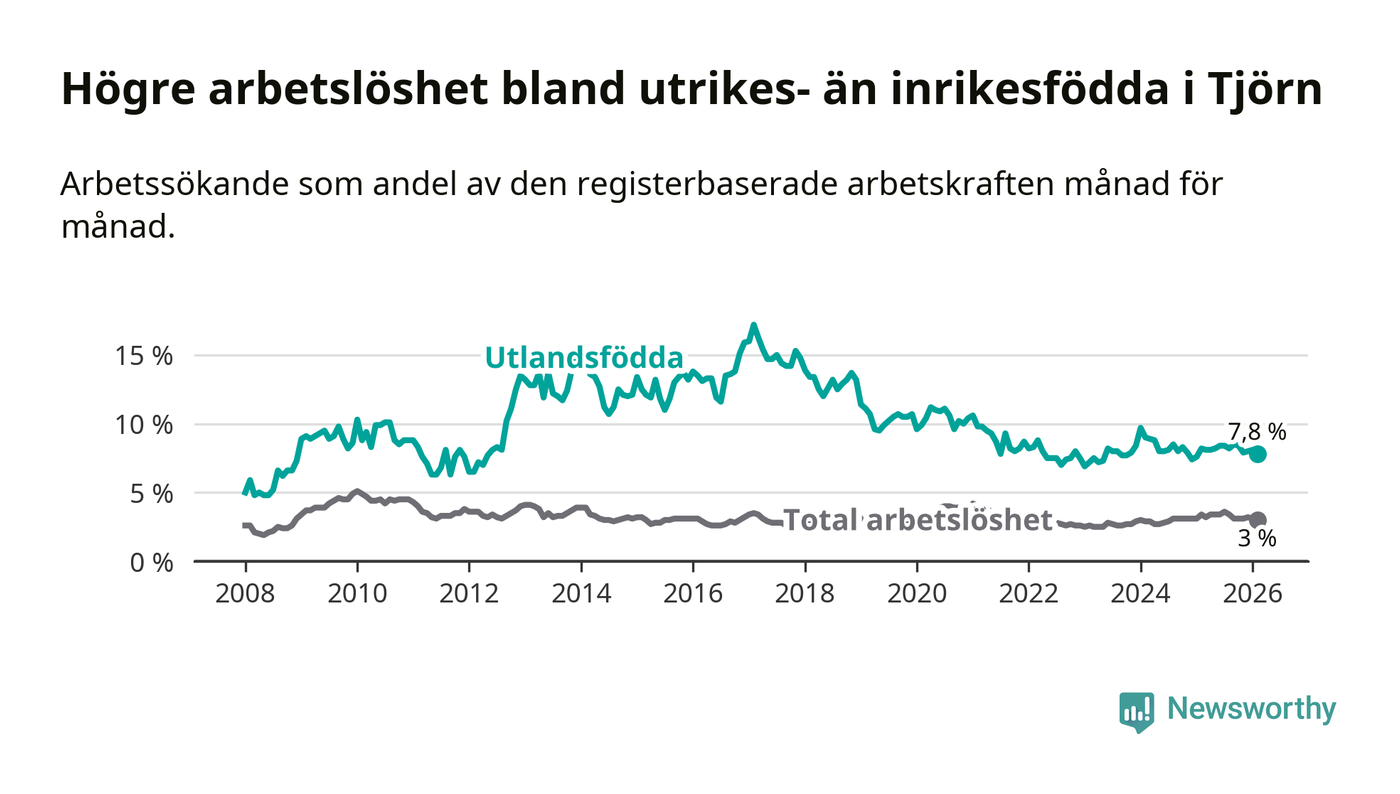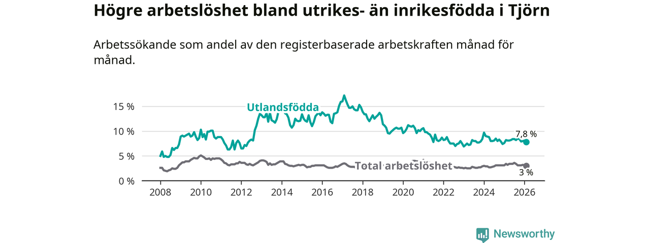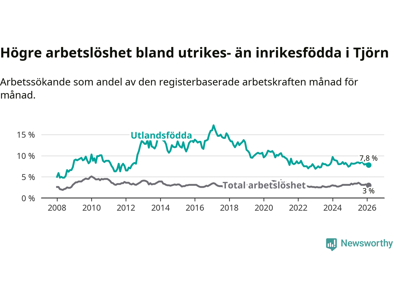 Arbetslösheten bland utlandsfödda var 7,8 procent på Tjörn under februari månad, motsvarande 64 av 821 personer. Det är 0,4 procentenheter färre än vid samma tidpunkt i fjol (−3 om man räknar personer). Den senaste månadens nedgång innebär ett trendbrott. Under de två föregående månaderna hade arbetslösheten bland utlandsfödda varit högre än motsvarande tidpunkt året innan.