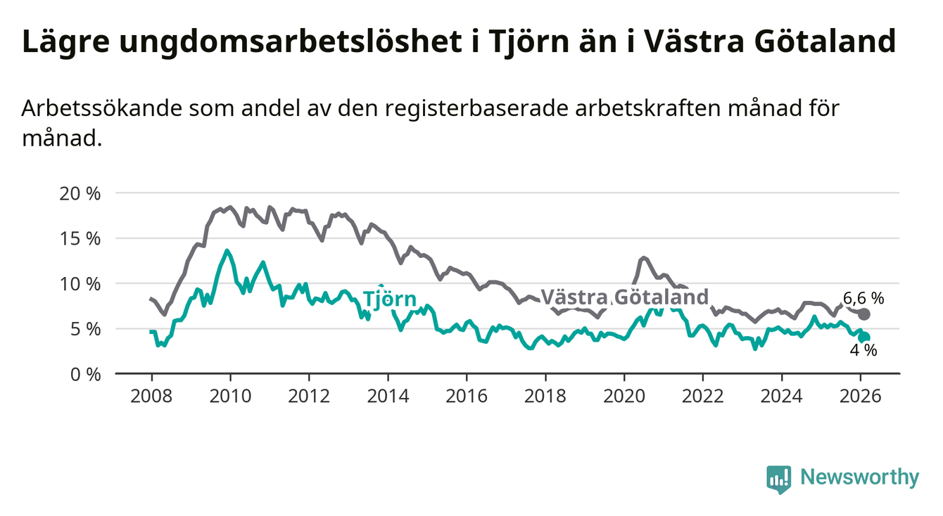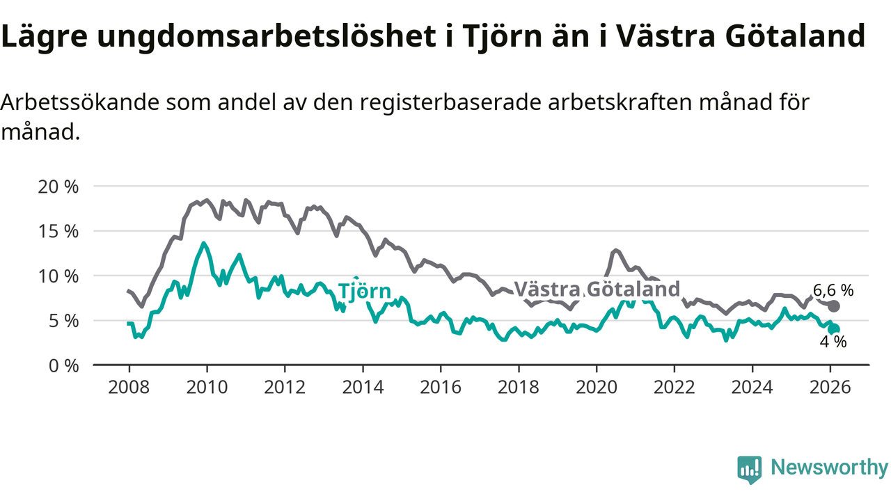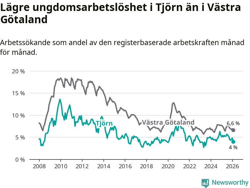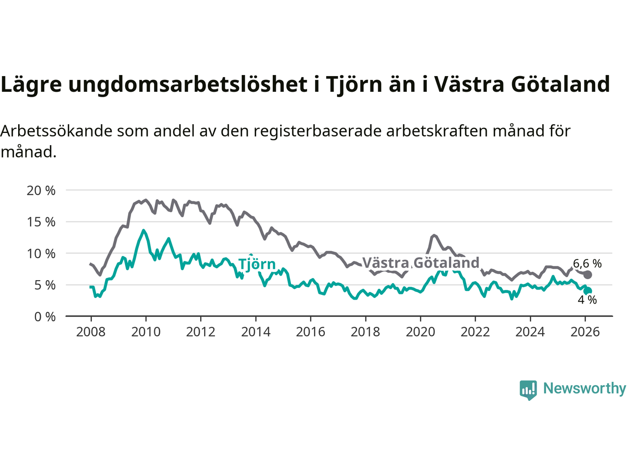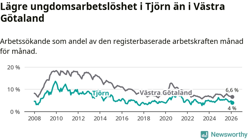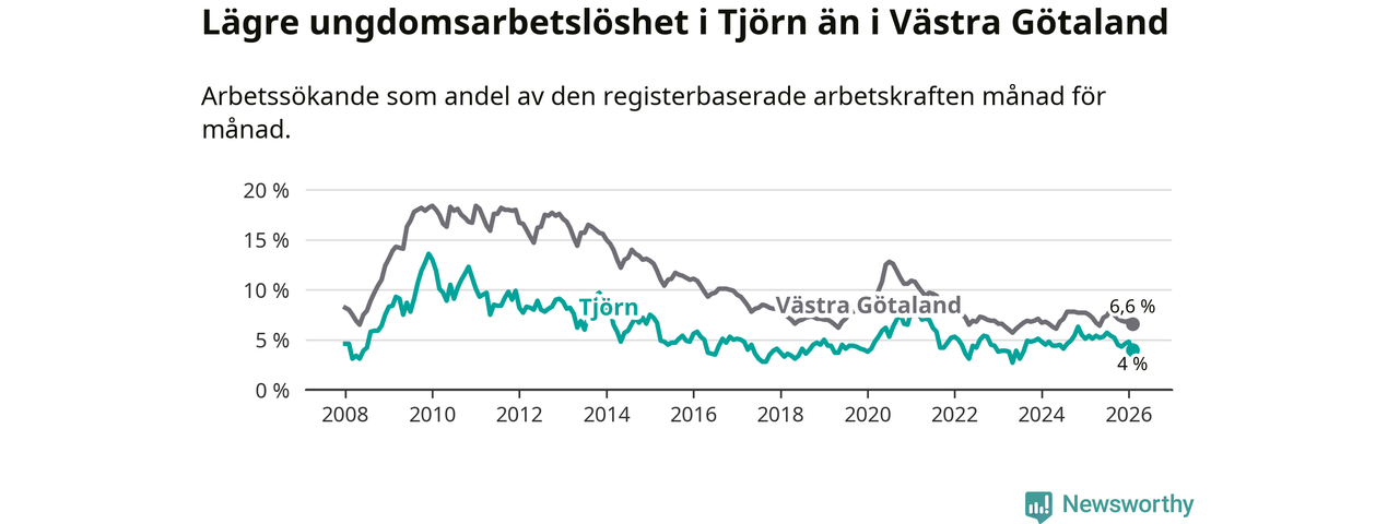 Precis som den totala arbetslösheten ligger ungdomsarbetslösheten på Tjörn lägre än i Västra Götaland som helhet. Skillnaden mellan kommunen och länet är 2,6 procentenheter.