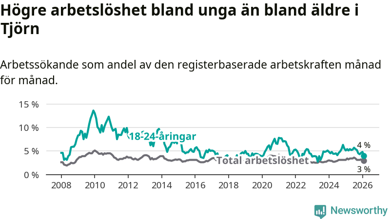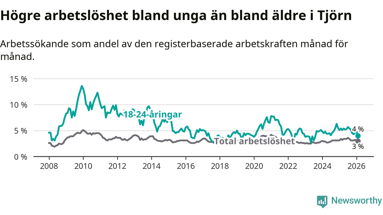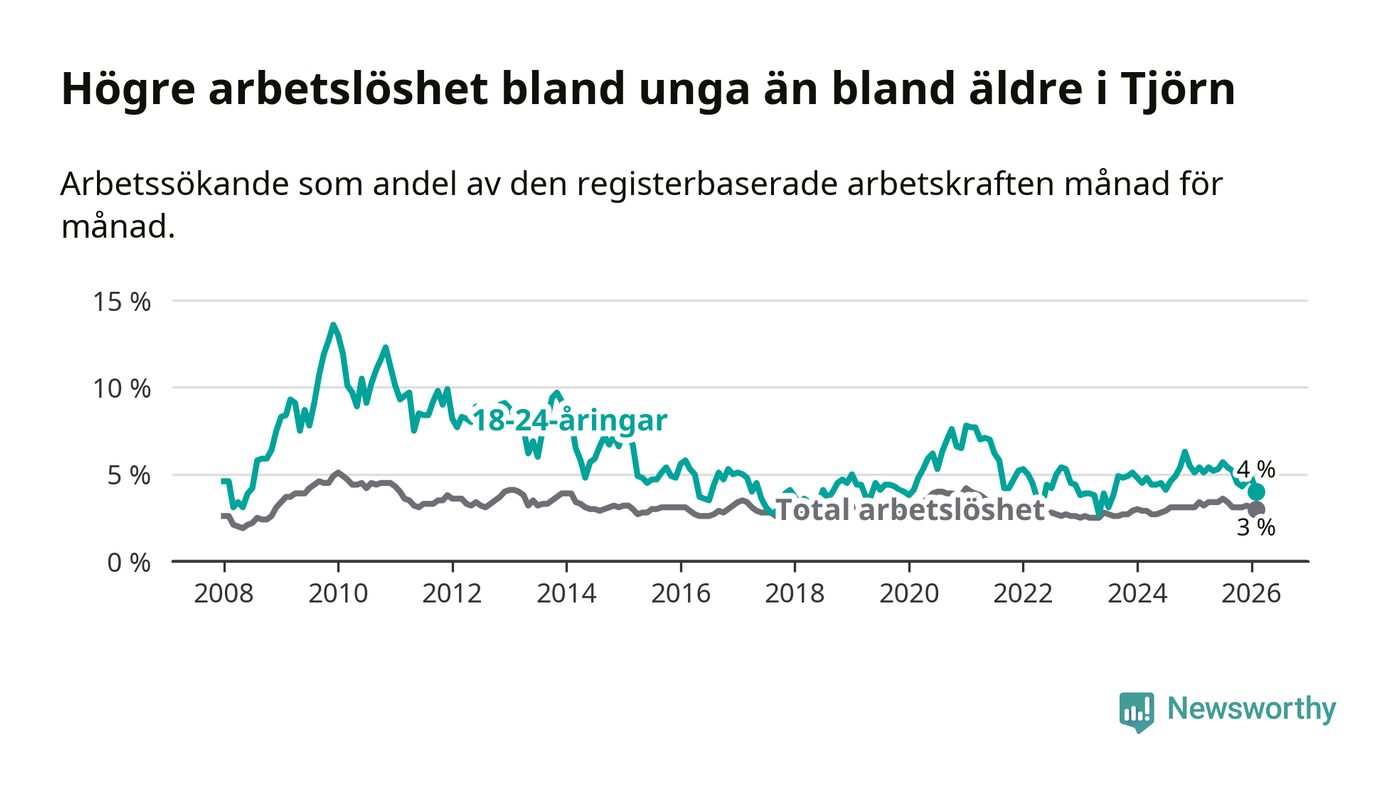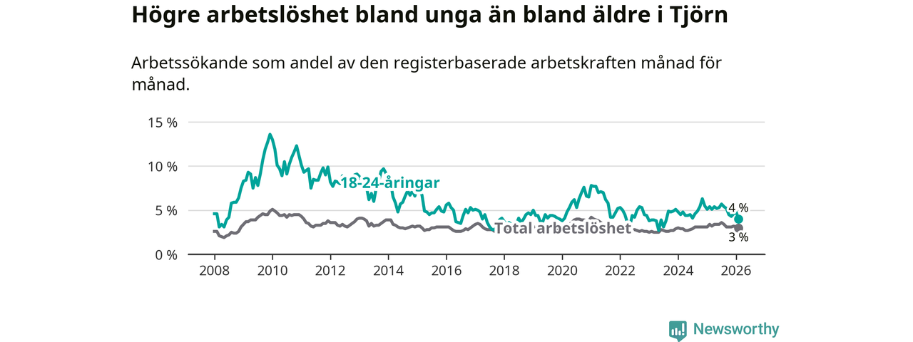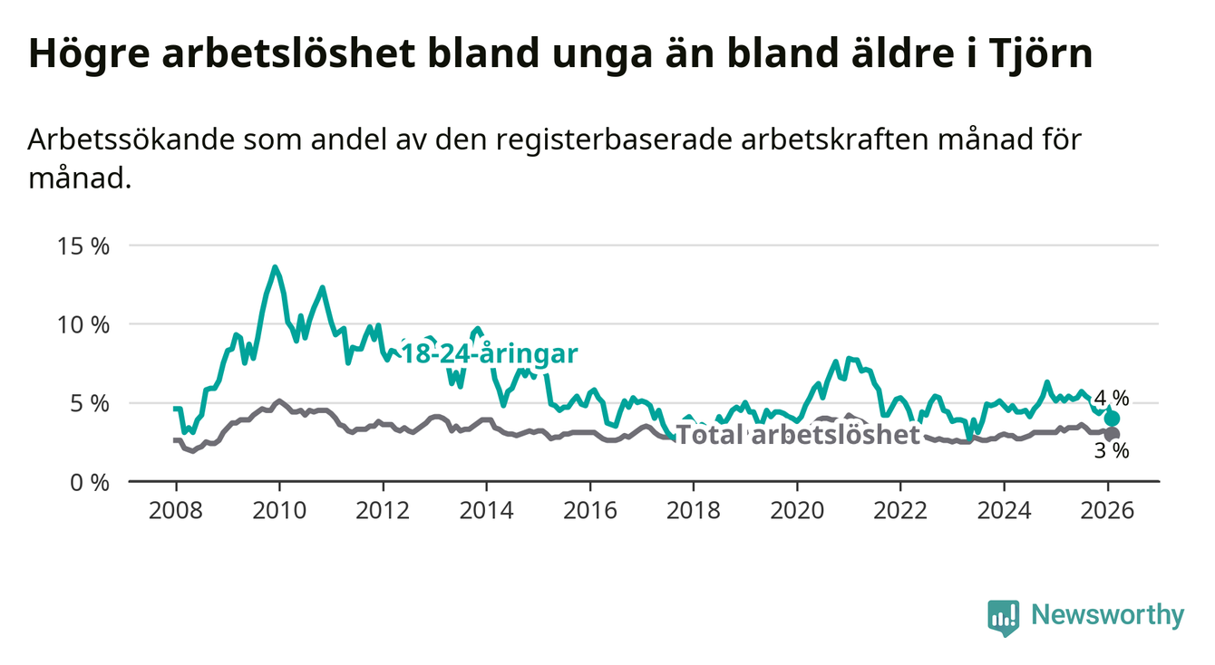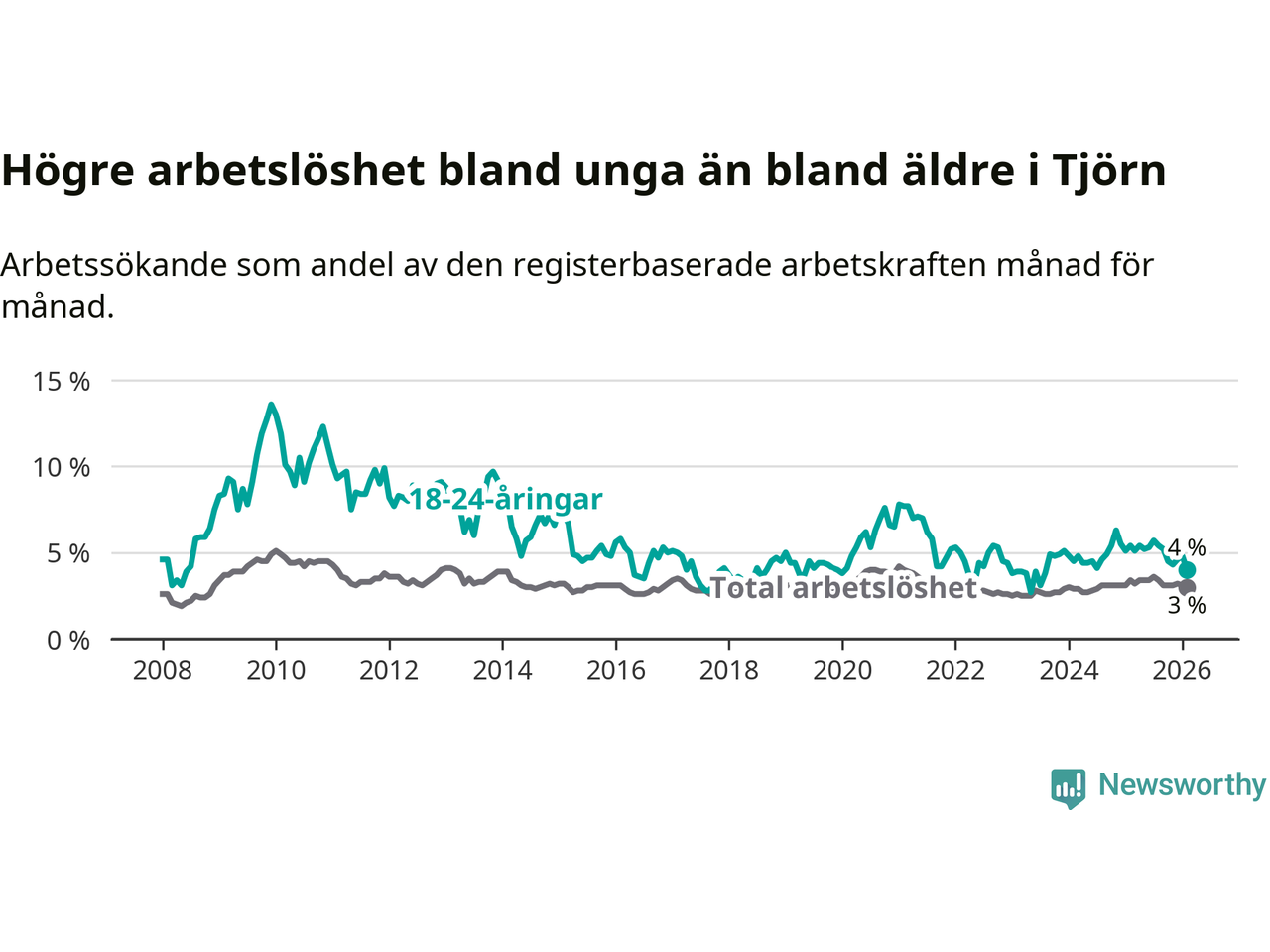 Precis som den totala arbetslösheten ligger ungdomsarbetslösheten på Tjörn lägre än i Västra Götaland som helhet. Skillnaden mellan kommunen och länet är 2,6 procentenheter.