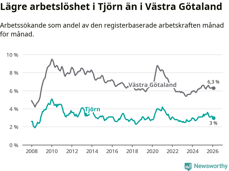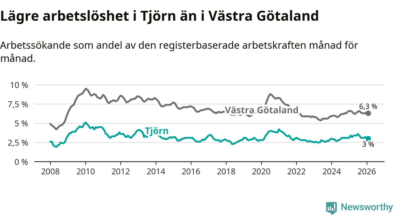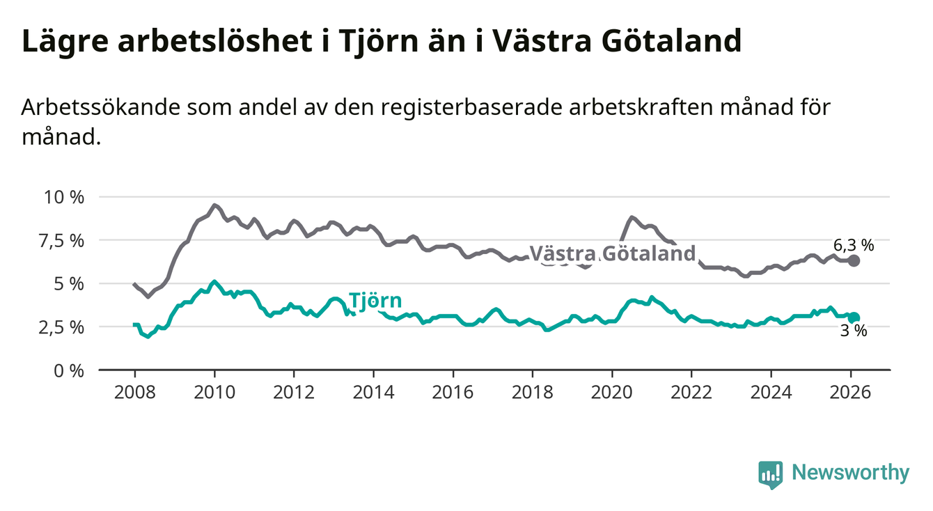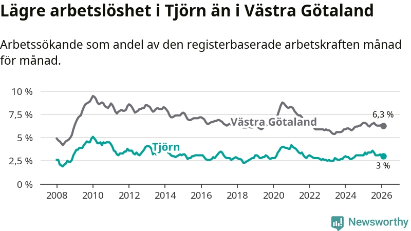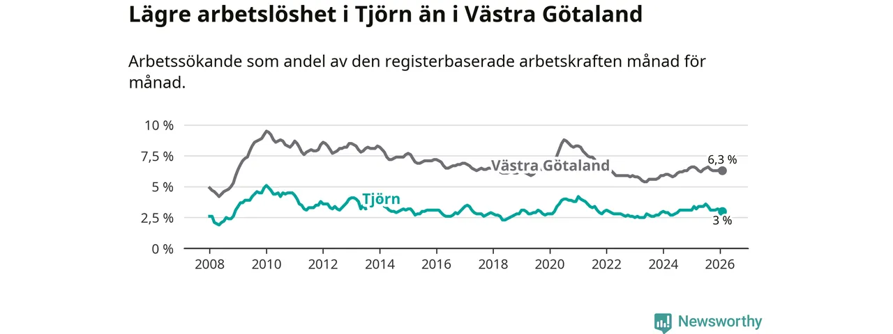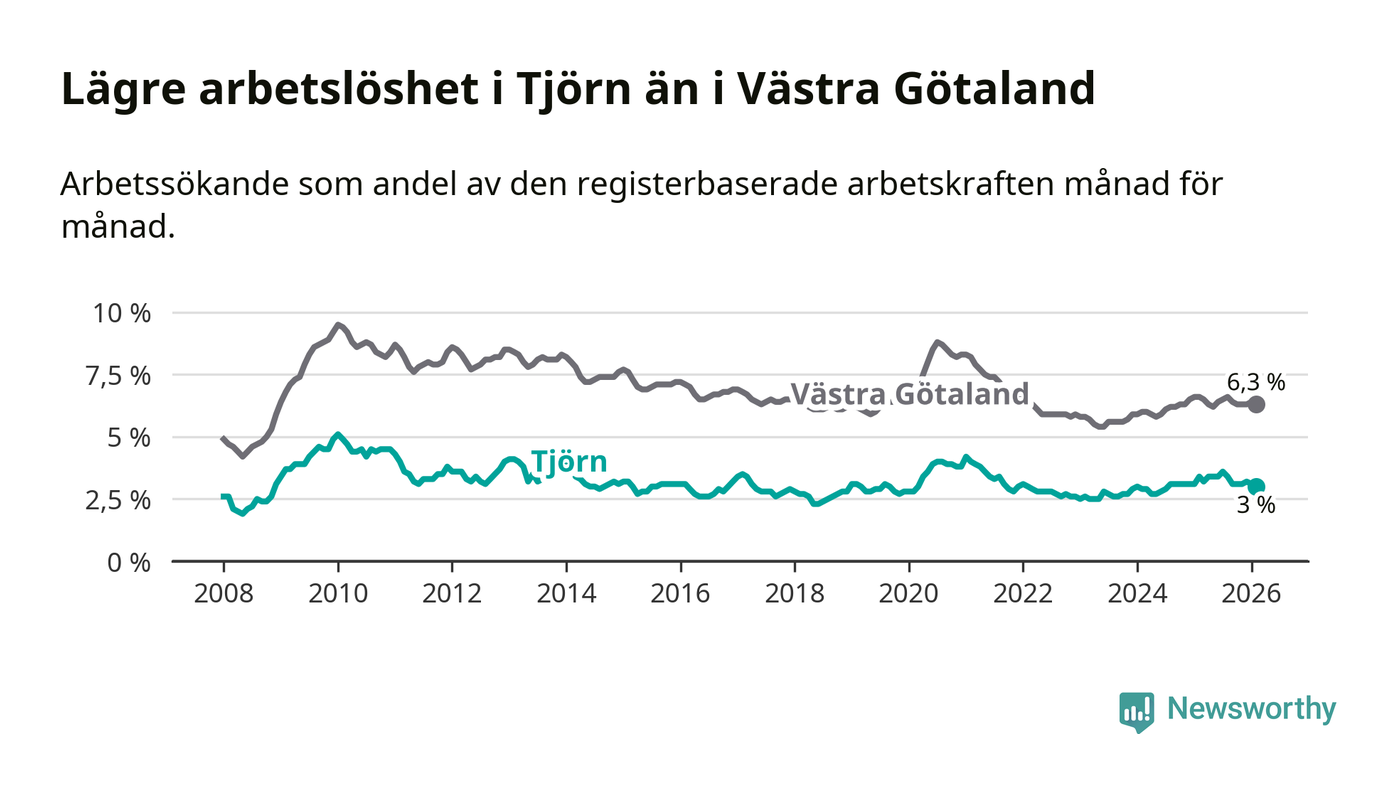 Tjörn hade redan tidigare lägre arbetslöshet än snittet i hela Västra Götalands län och nu växer klyftan (3,0 procent i kommunen, jämfört med 6,3 procent i hela länet). Öckerö har den lägsta arbetslösheten i länet (2,7 procent), medan Gullspång har den högsta (8,3 procent). För att Tjörn skulle komma ner i samma arbetslöshetsnivå som Öckerö skulle 22 personer behöva sysselsättas.