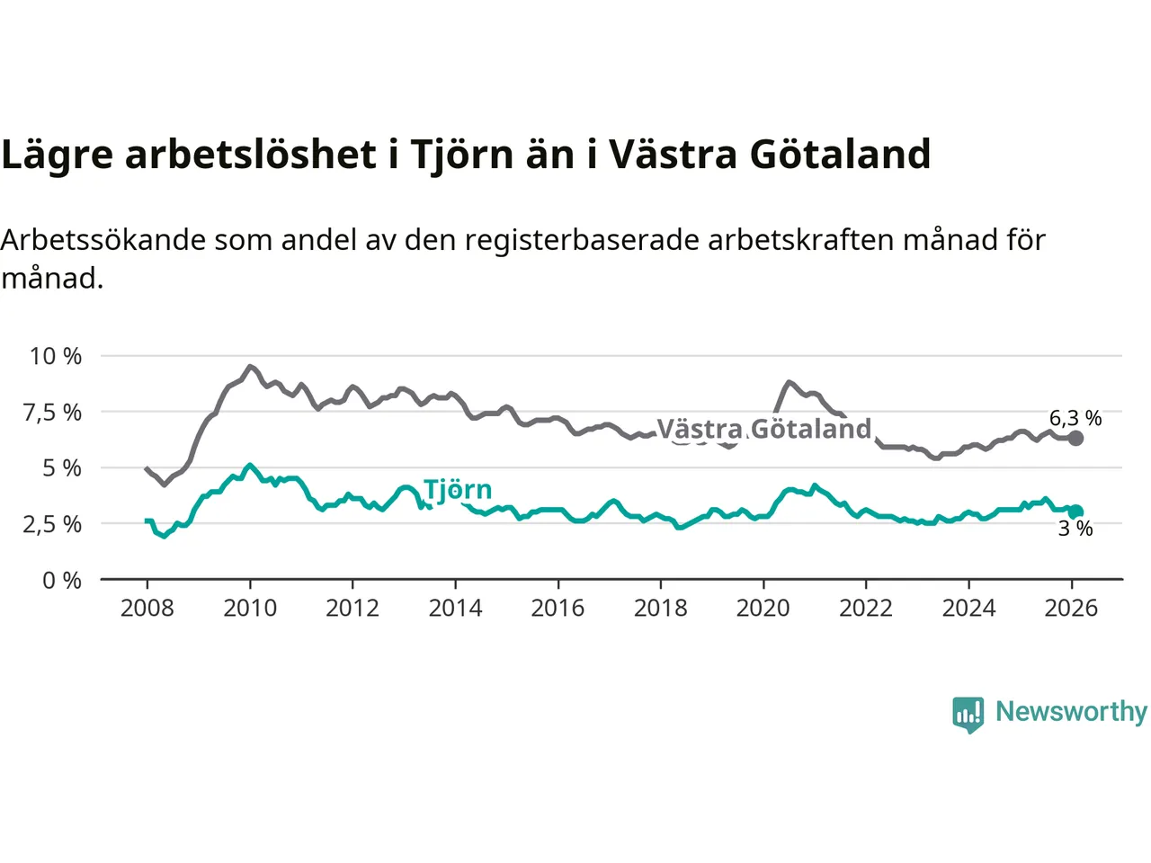 Under februari månad rapporterade Tjörns kommun en total arbetslöshet på 3,0 procent. Det är en minskning jämfört med samma tidpunkt i fjol (−0,4 procentenheter). Även i Västra Götalands län sjunker arbetslösheten .