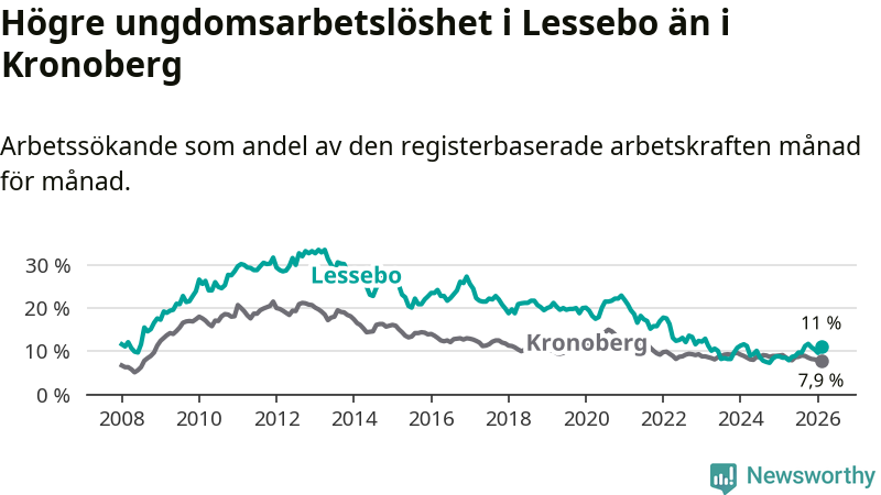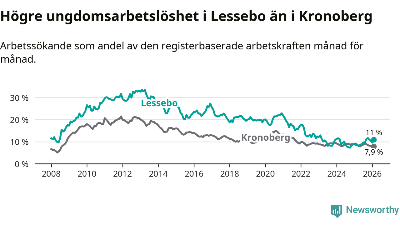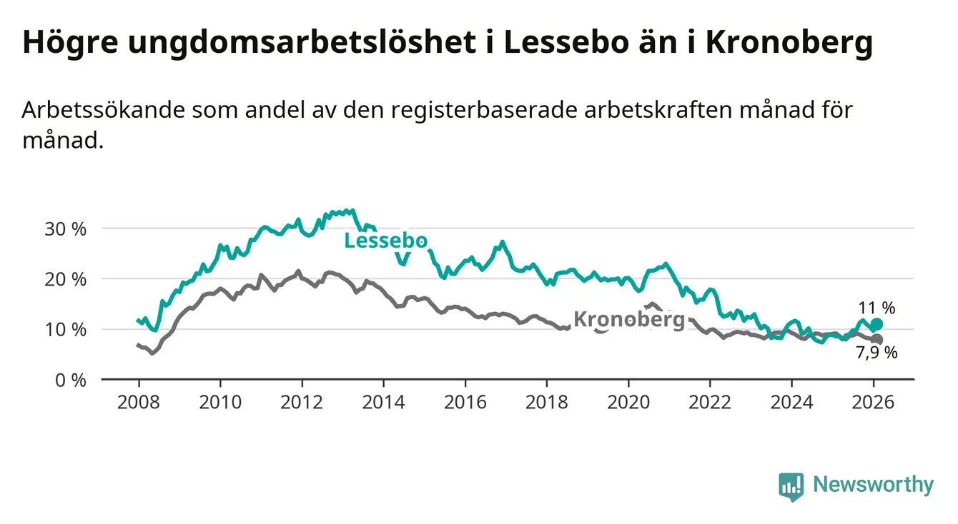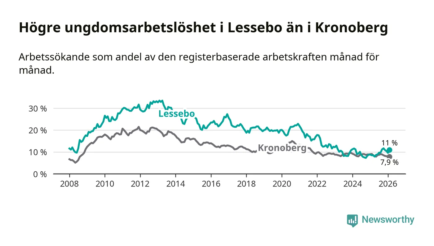 Precis som den totala arbetslösheten ligger ungdomsarbetslösheten i Lessebo högre än i Kronoberg som helhet. Skillnaden mellan kommunen och länet är 3,1 procentenheter.