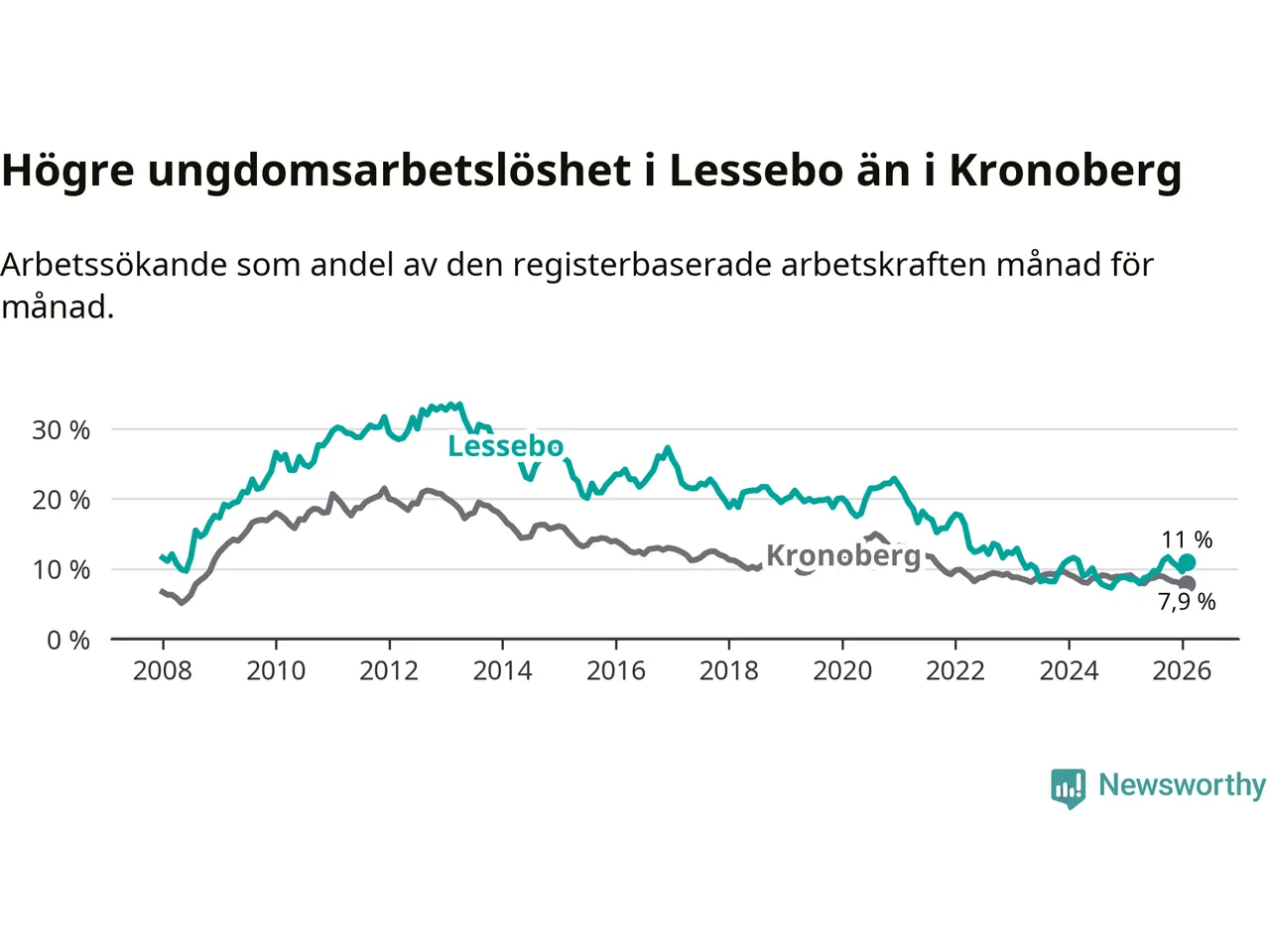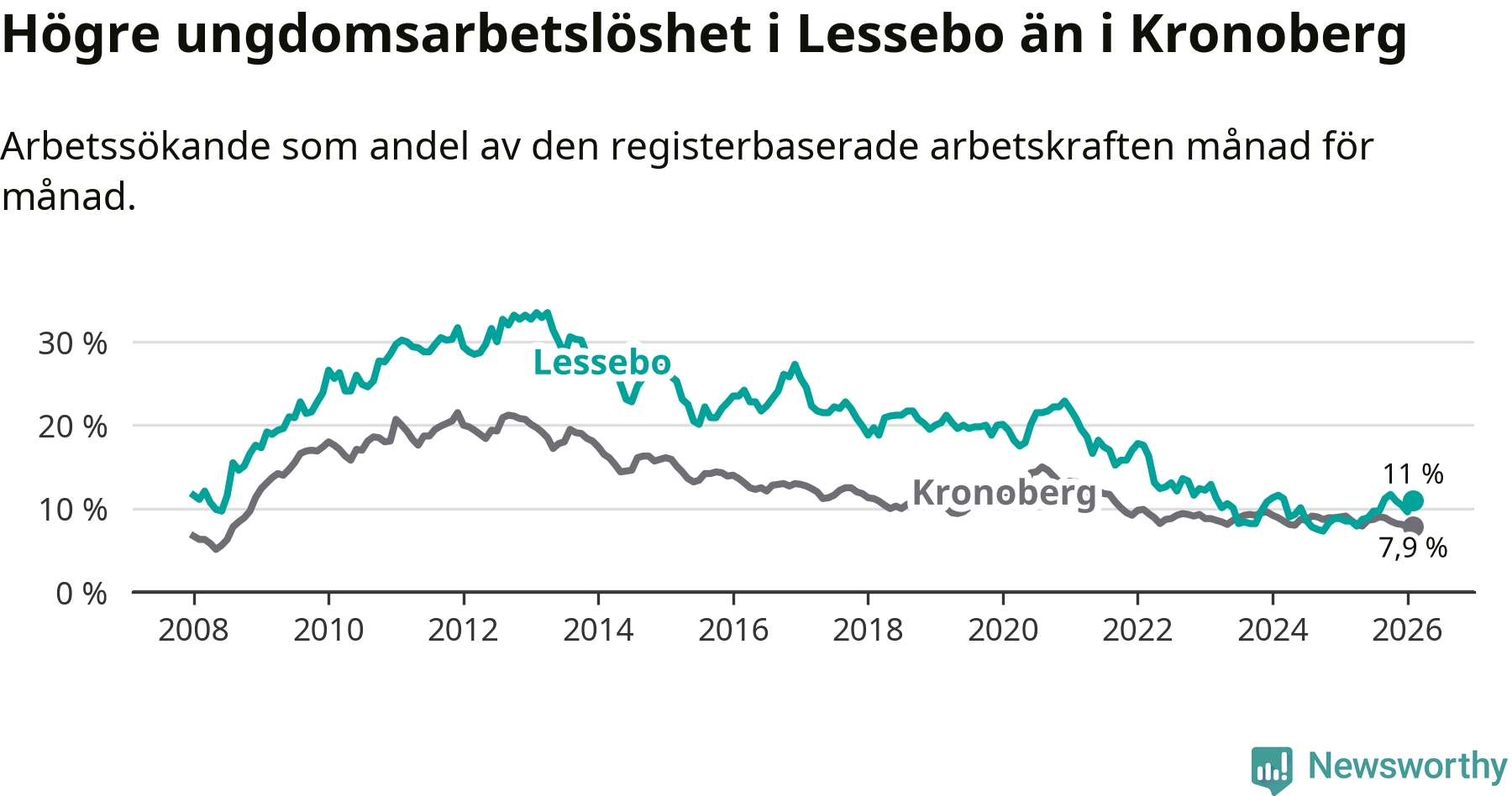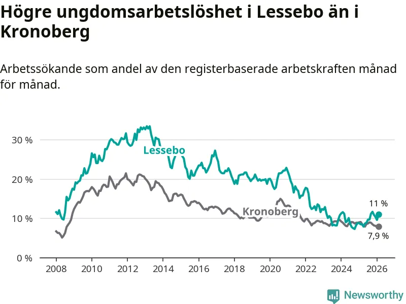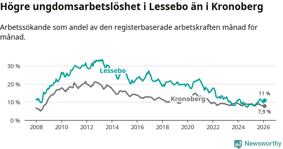 Precis som den totala arbetslösheten ligger ungdomsarbetslösheten i Lessebo högre än i Kronoberg som helhet. Skillnaden mellan kommunen och länet är 3,1 procentenheter.