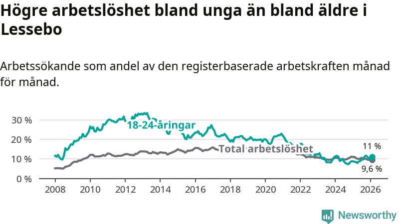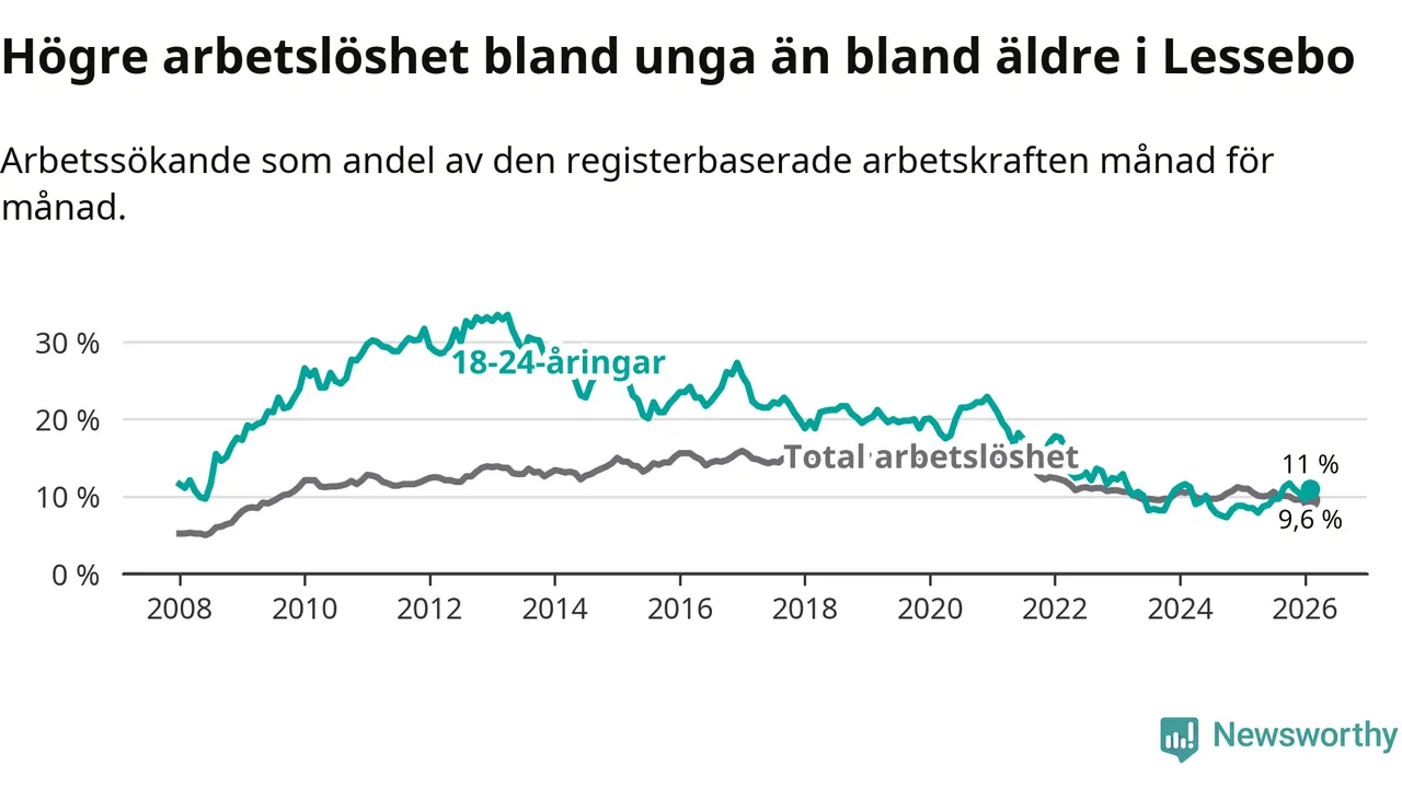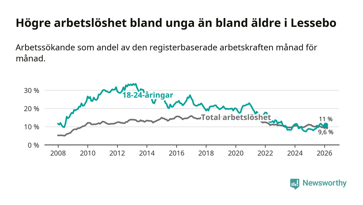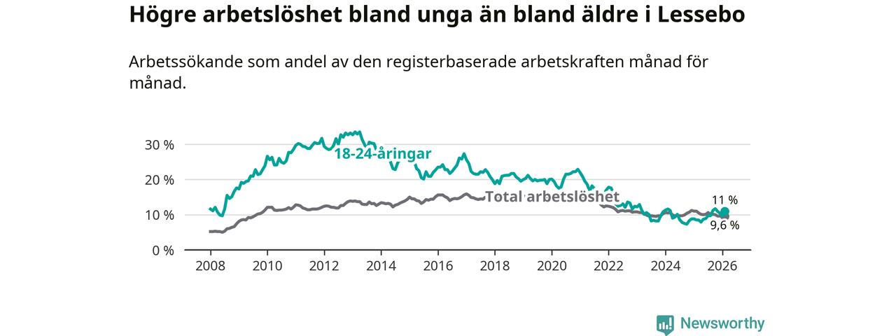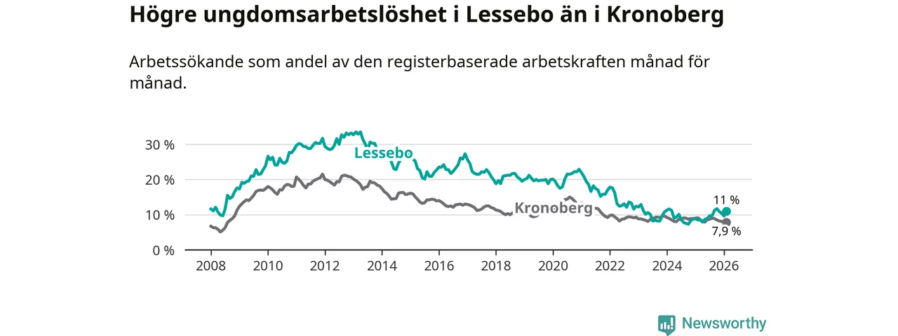 I och med den senaste månadens uppgång har de ungas arbetslöshet i Lessebo stigit åtta månader i följd (upp från 8,9 procent i juni 2025 till 11,0 procent nu).