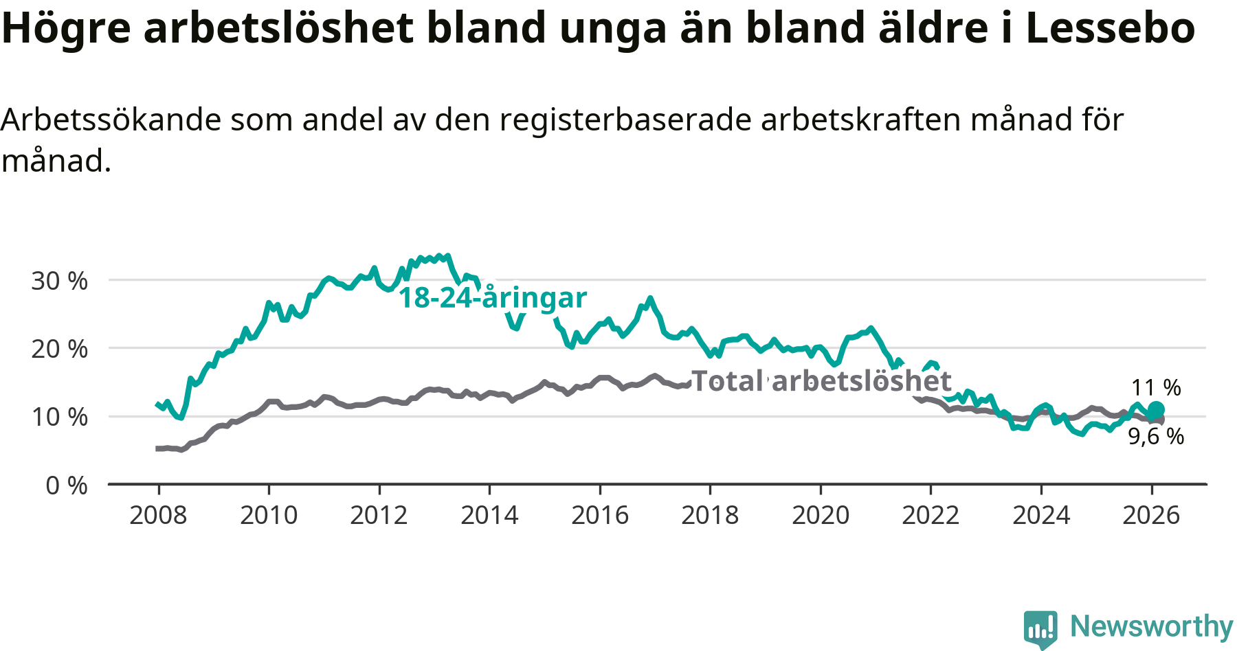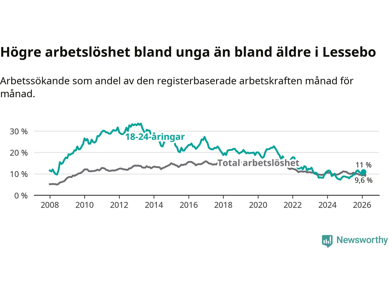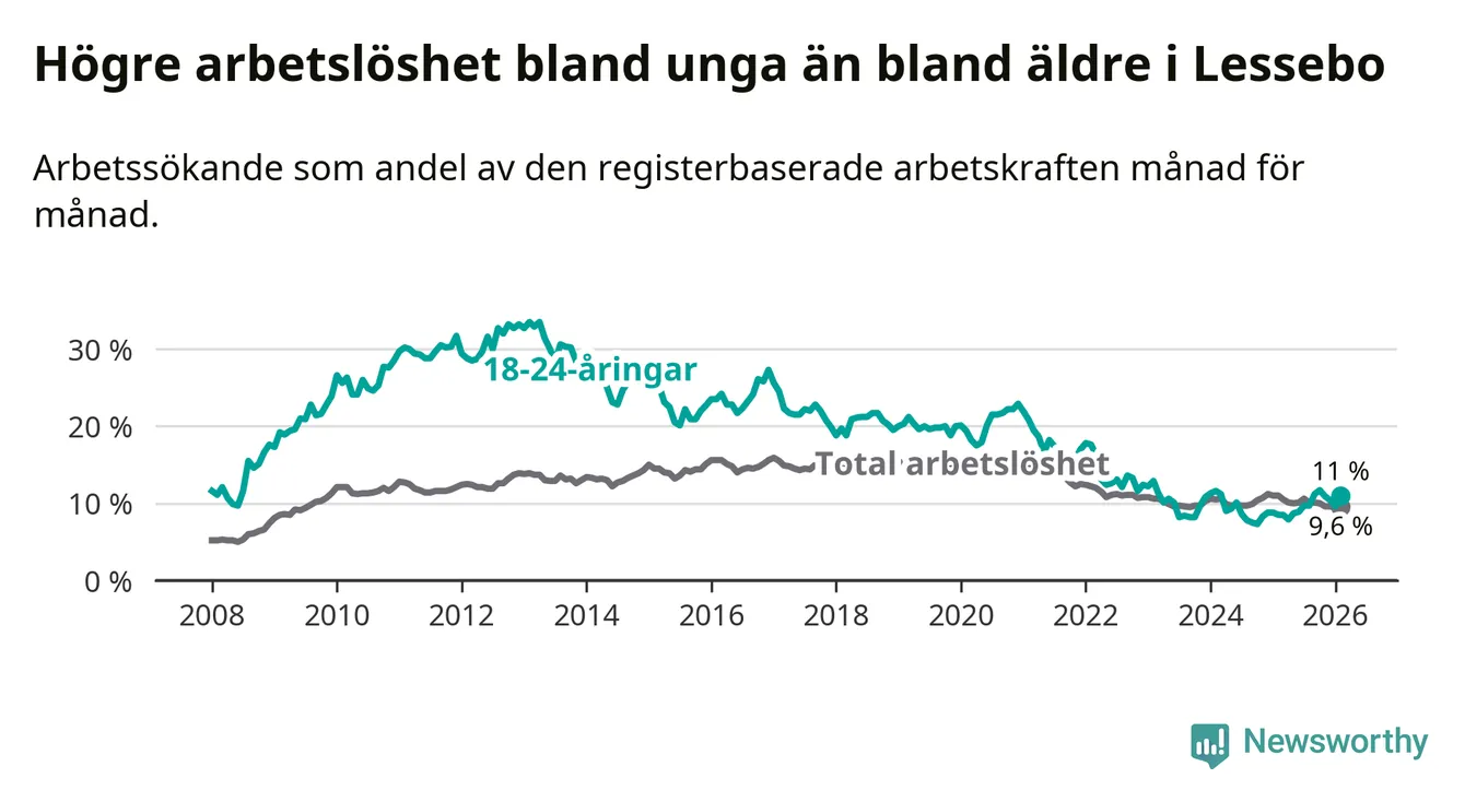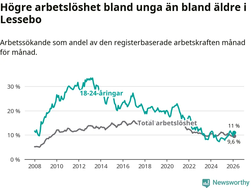 I och med den senaste månadens uppgång har de ungas arbetslöshet i Lessebo stigit åtta månader i följd (upp från 8,9 procent i juni 2025 till 11,0 procent nu).