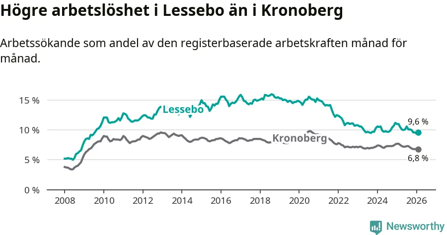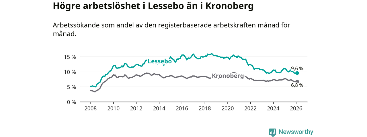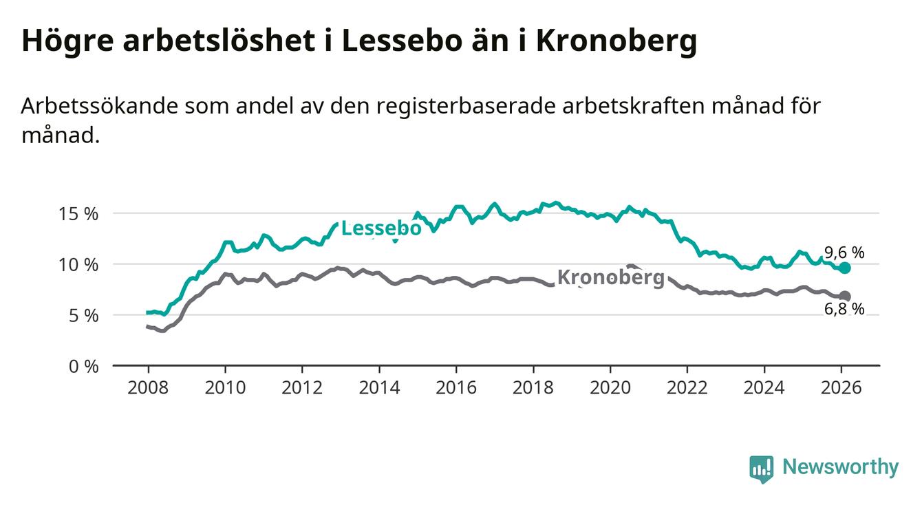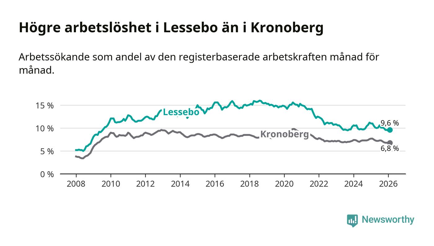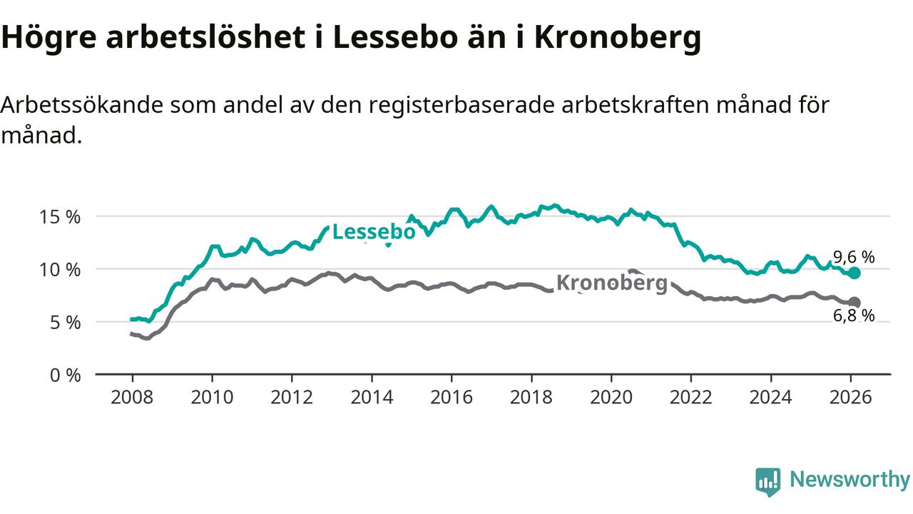 Under februari månad rapporterade Lessebo kommun en total arbetslöshet på 9,6 procent. Det är en minskning jämfört med samma tidpunkt i fjol (−1,4 procentenheter). Även i Kronobergs län sjunker arbetslösheten .