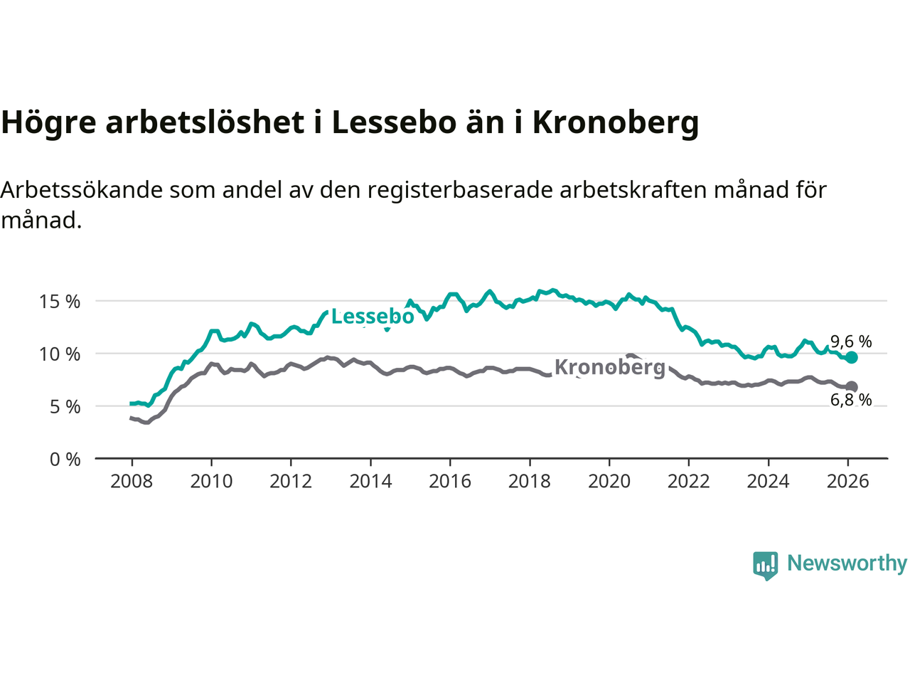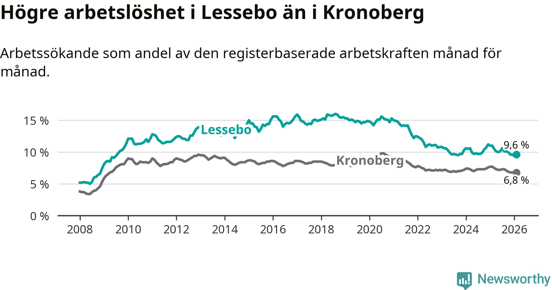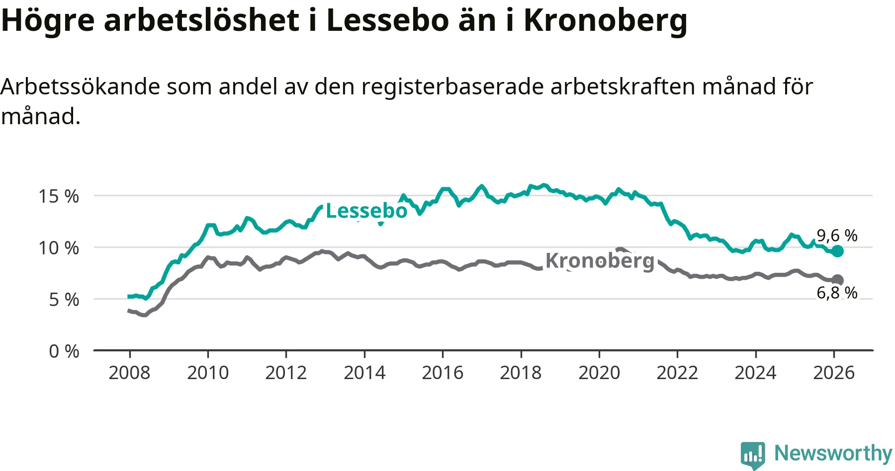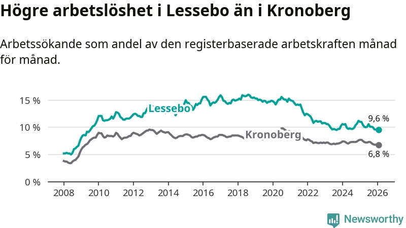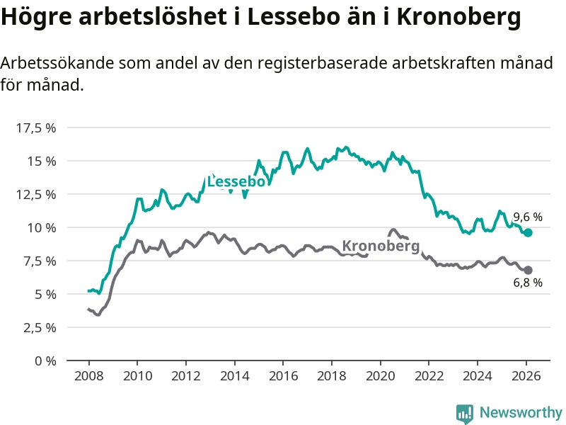 Under februari månad rapporterade Lessebo kommun en total arbetslöshet på 9,6 procent. Det är en minskning jämfört med samma tidpunkt i fjol (−1,4 procentenheter). Även i Kronobergs län sjunker arbetslösheten .