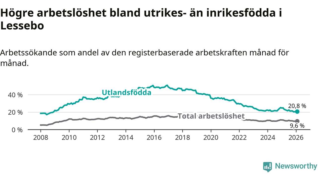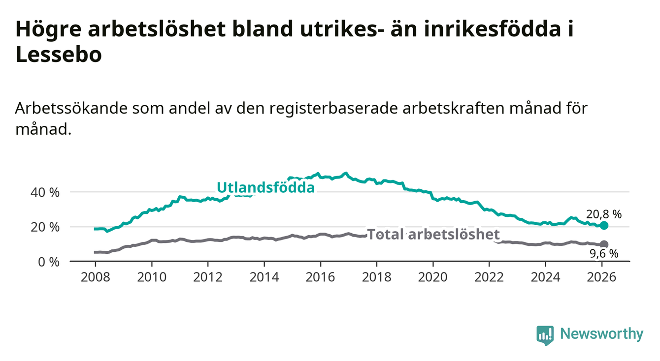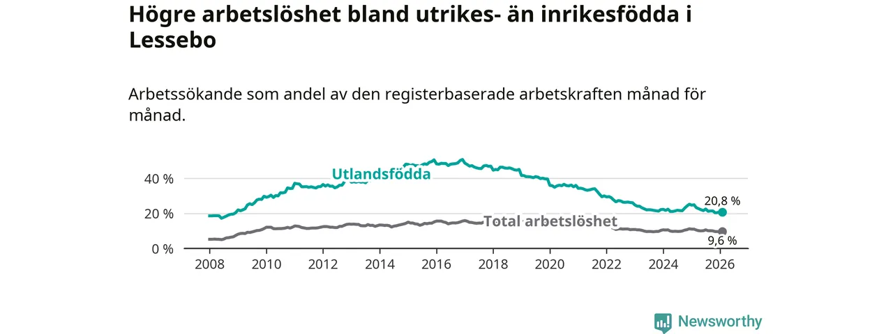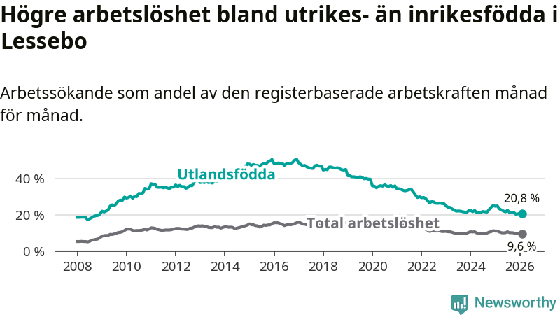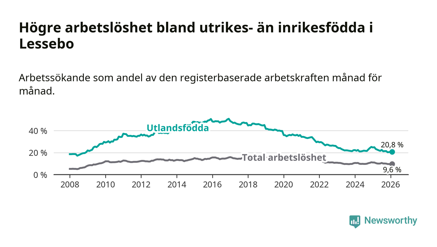 Arbetslösheten bland utlandsfödda var 20,8 procent i Lessebo under februari månad, motsvarande 226 av 1 087 personer. Det är 4,1 procentenheter färre än vid samma tidpunkt i fjol (−43 om man räknar personer). Därmed är de utlandsföddas arbetslöshet lägre än vid samma tidpunkt i fjol för sjunde månaden i följd. Sedan juli 2025 har arbetslösheten bland utlandsfödda minskat från 22,5 till 20,8 procent.
