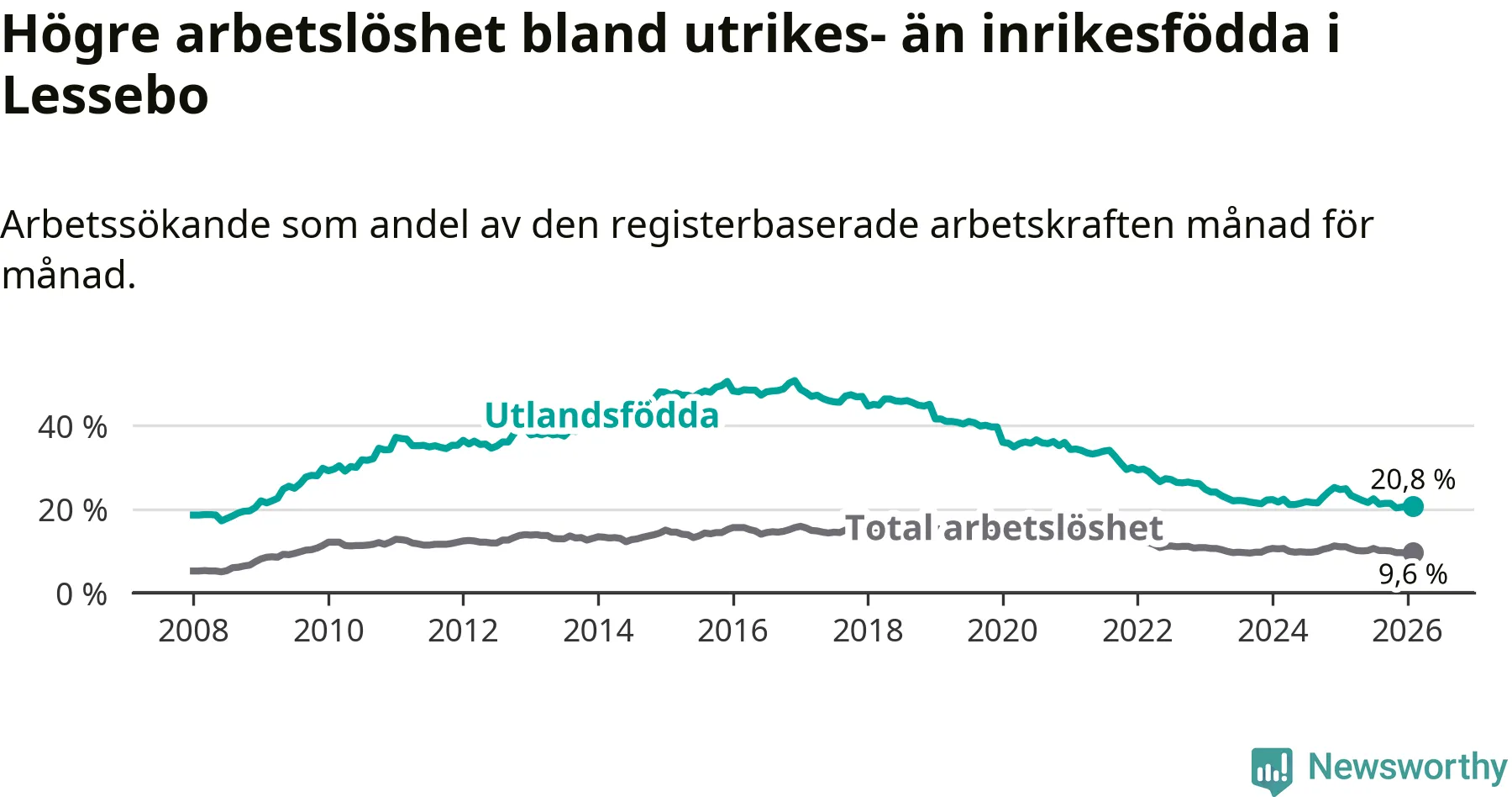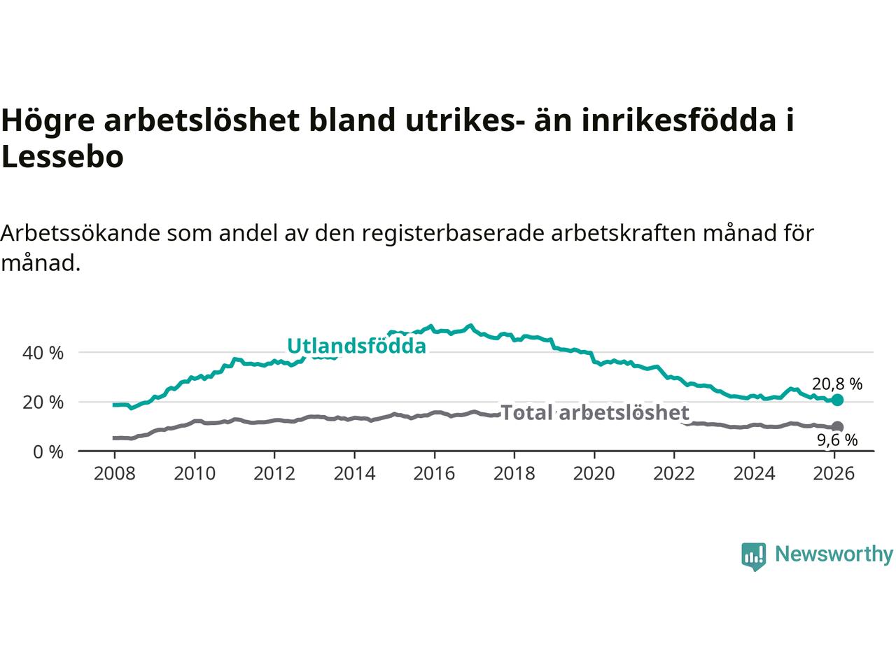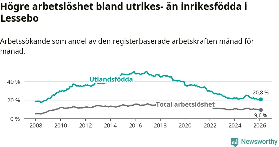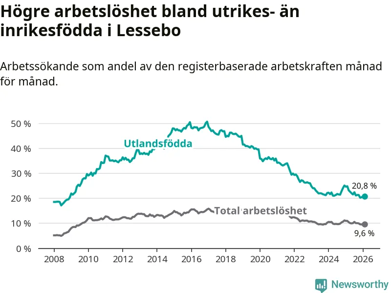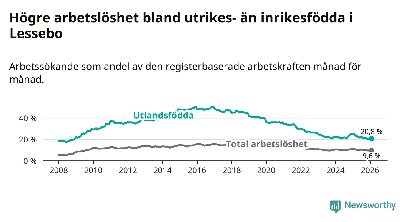 Arbetslösheten bland utlandsfödda var 20,8 procent i Lessebo under februari månad, motsvarande 226 av 1 087 personer. Det är 4,1 procentenheter färre än vid samma tidpunkt i fjol (−43 om man räknar personer). Därmed är de utlandsföddas arbetslöshet lägre än vid samma tidpunkt i fjol för sjunde månaden i följd. Sedan juli 2025 har arbetslösheten bland utlandsfödda minskat från 22,5 till 20,8 procent.