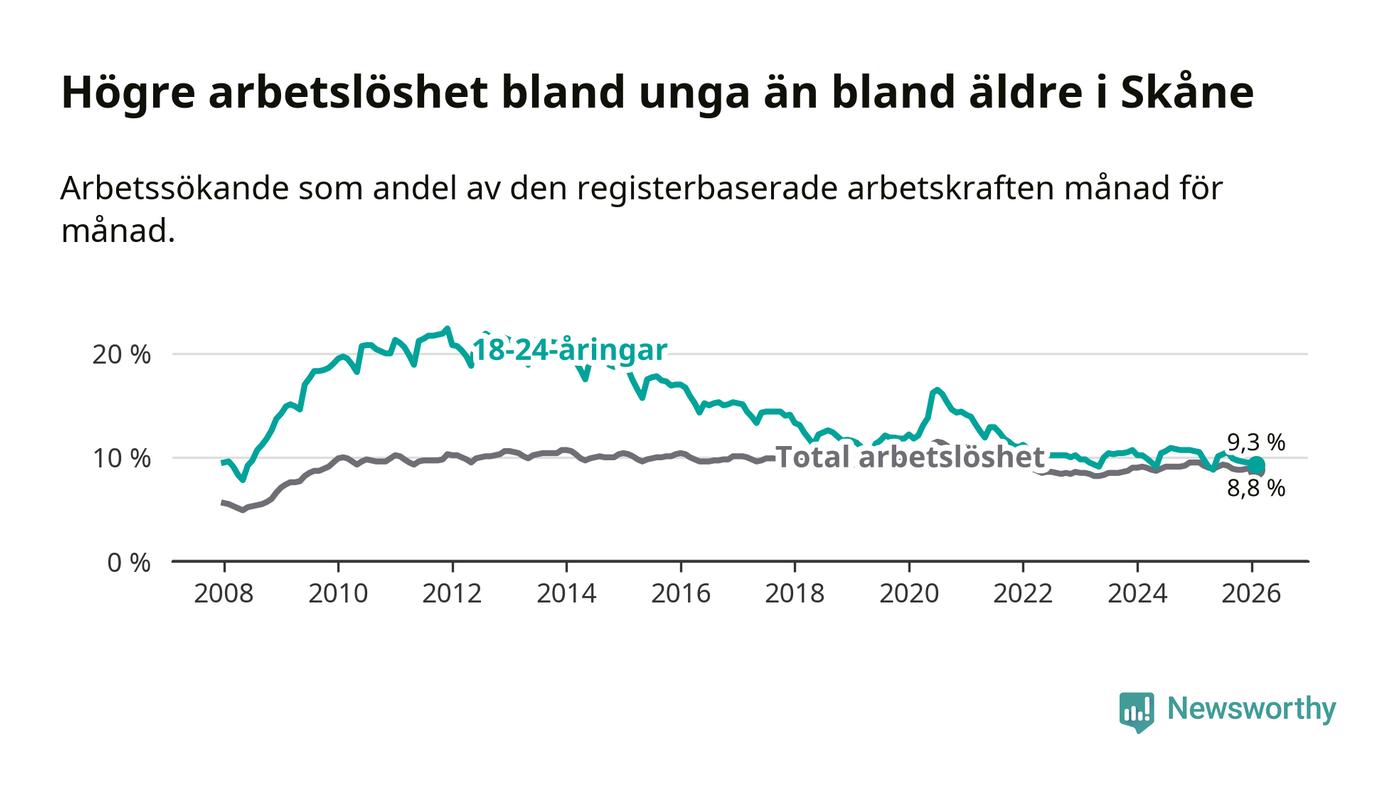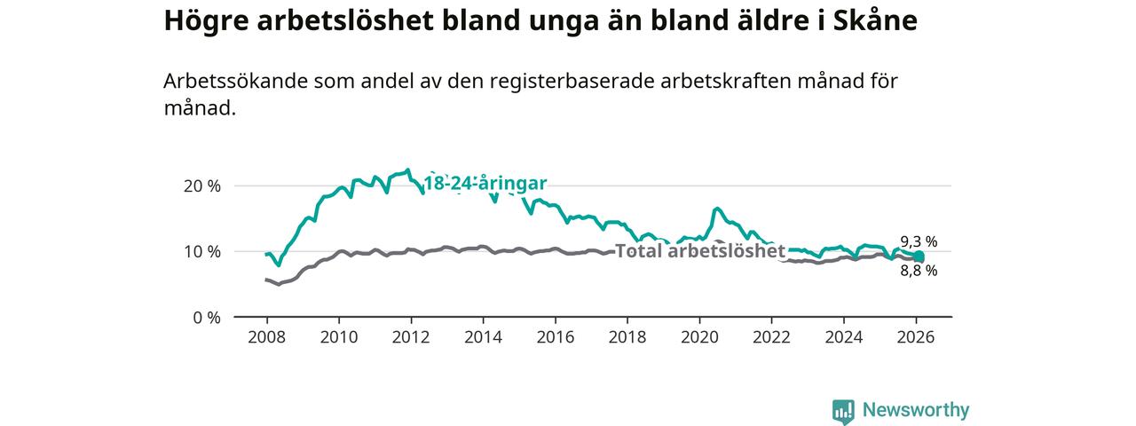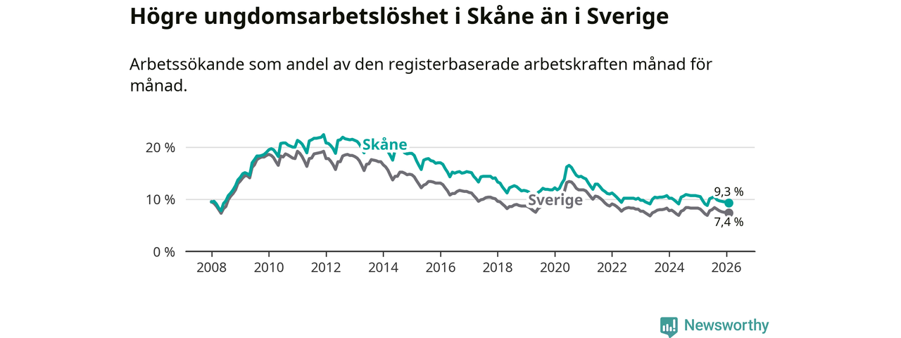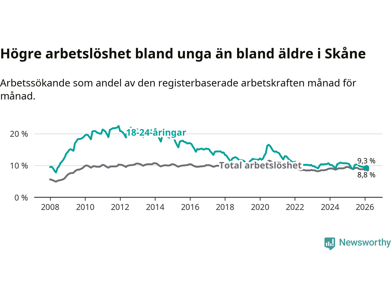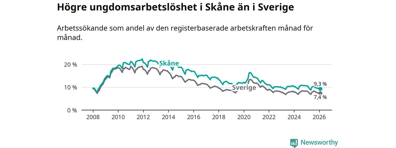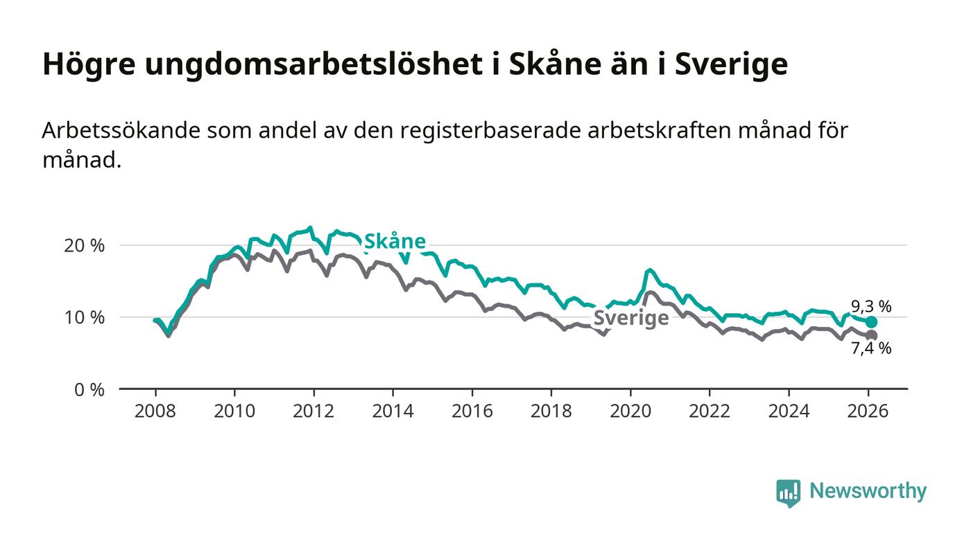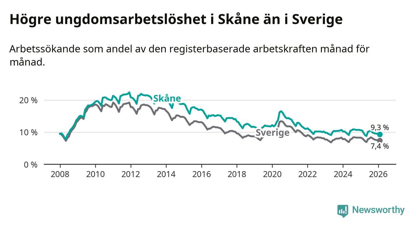 I och med den senaste månadens nedgång har de ungas arbetslöshet i Skåne sjunkit tolv månader i följd (ner från 10,5 procent i februari 2025 till 9,3 procent nu).