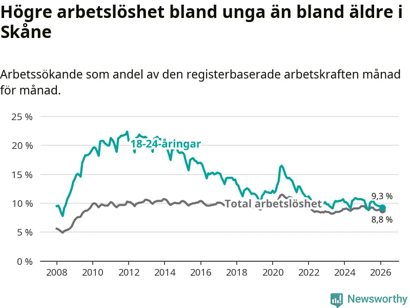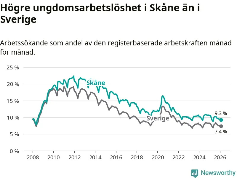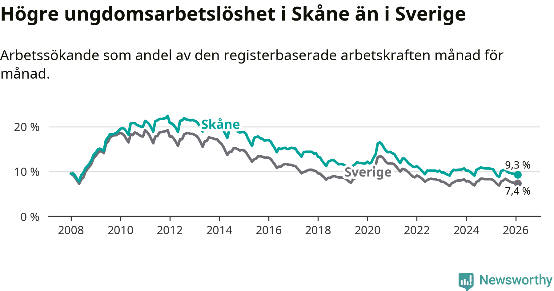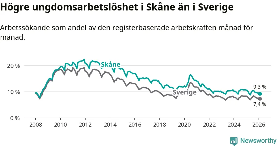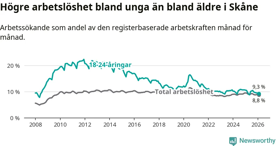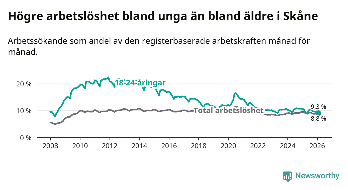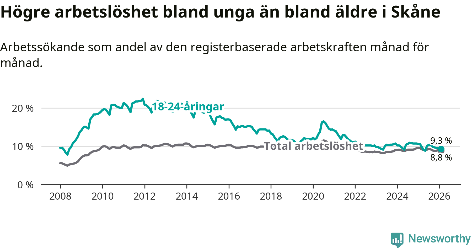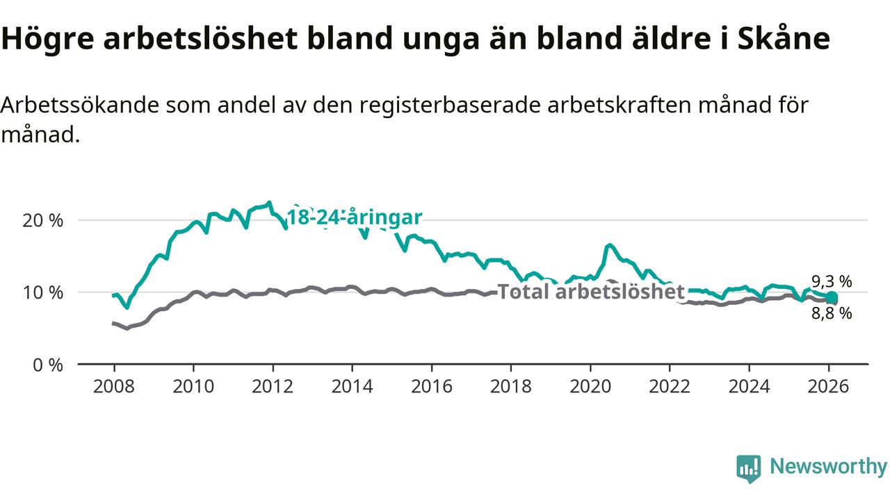 I och med den senaste månadens nedgång har de ungas arbetslöshet i Skåne sjunkit tolv månader i följd (ner från 10,5 procent i februari 2025 till 9,3 procent nu).