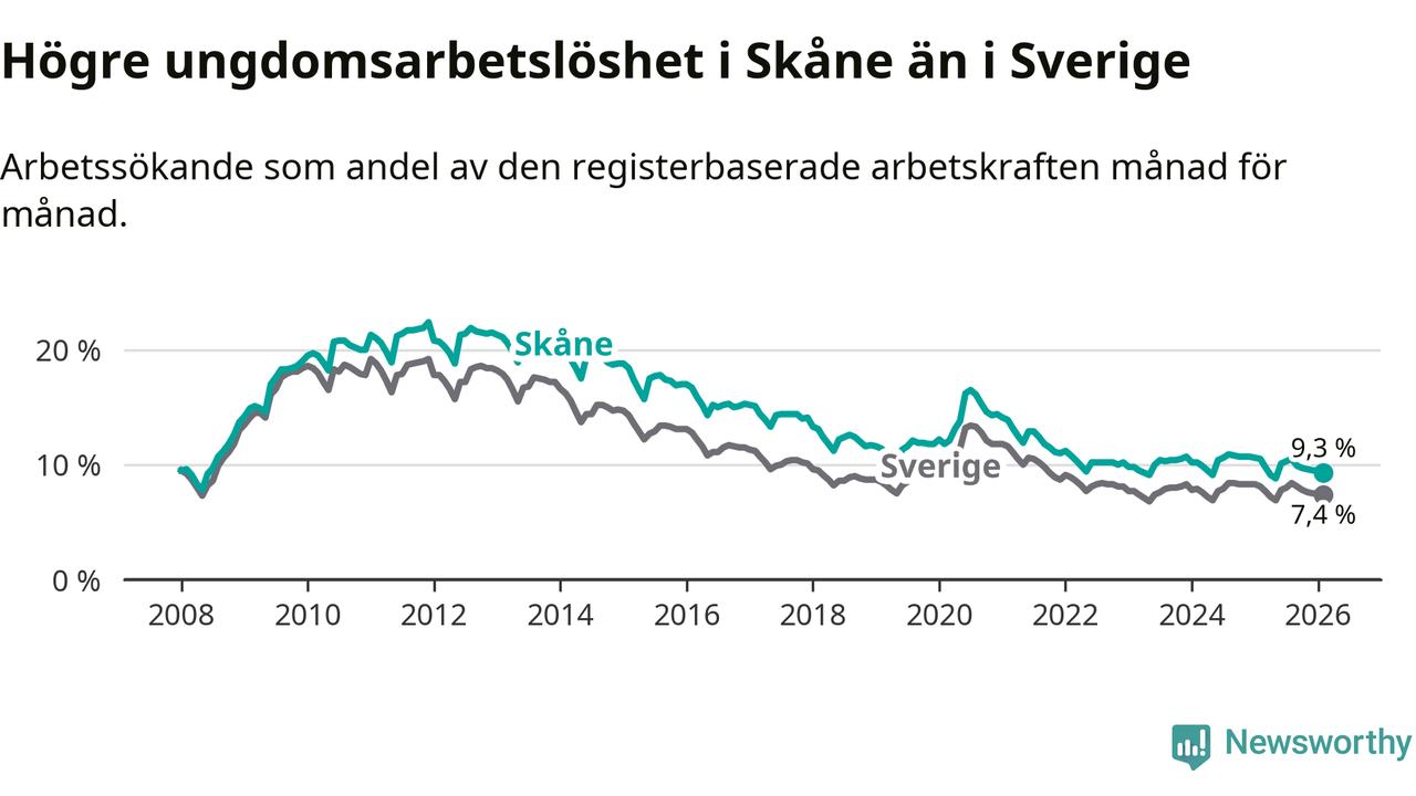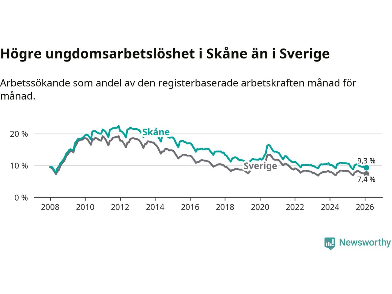 Graf: Arbetslöshet bland unga i Skåne län och Sverige