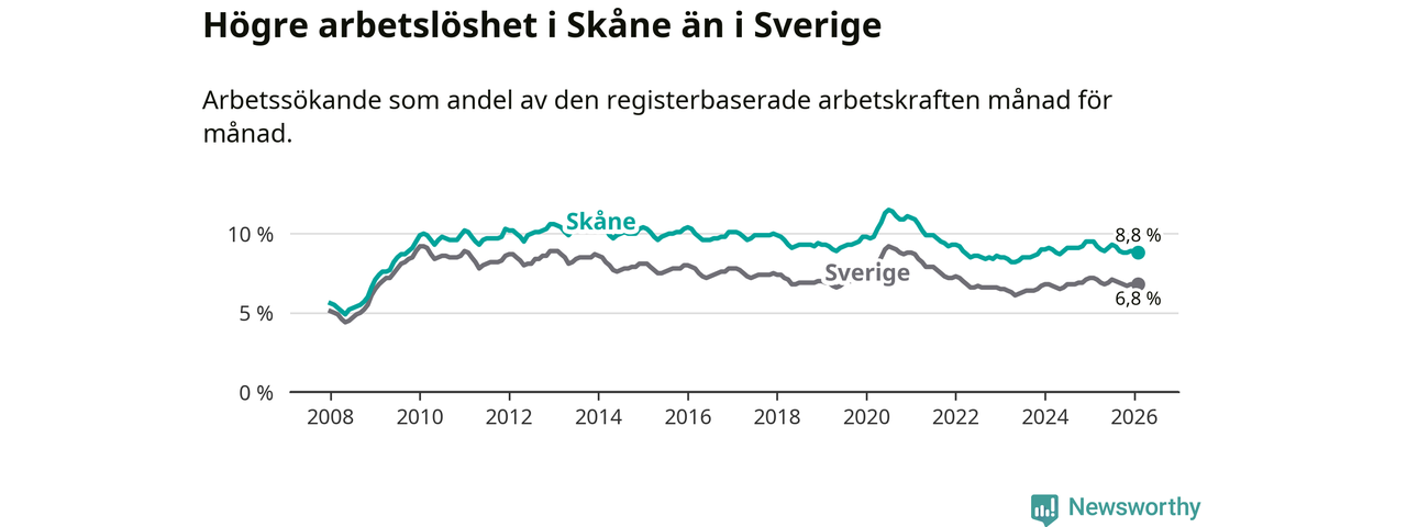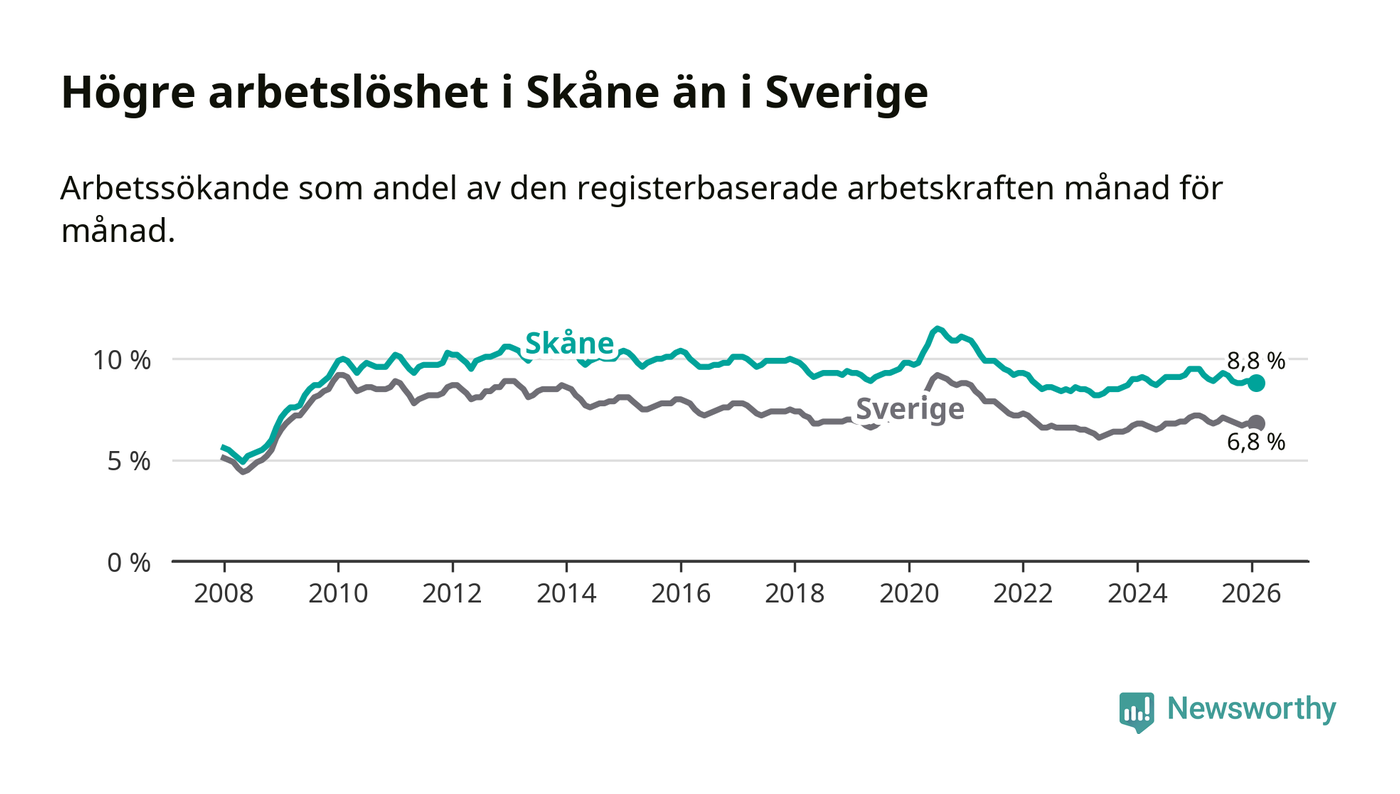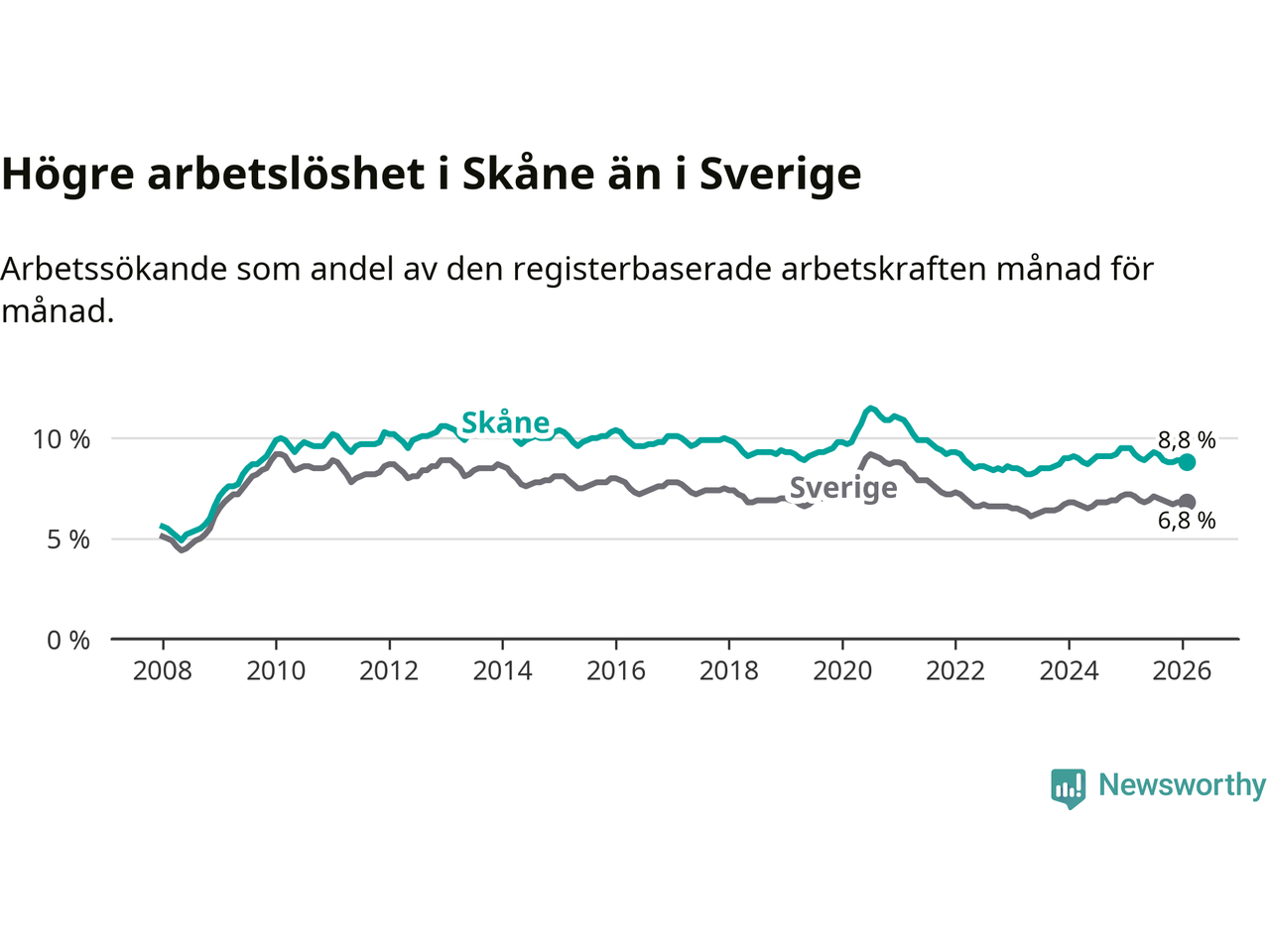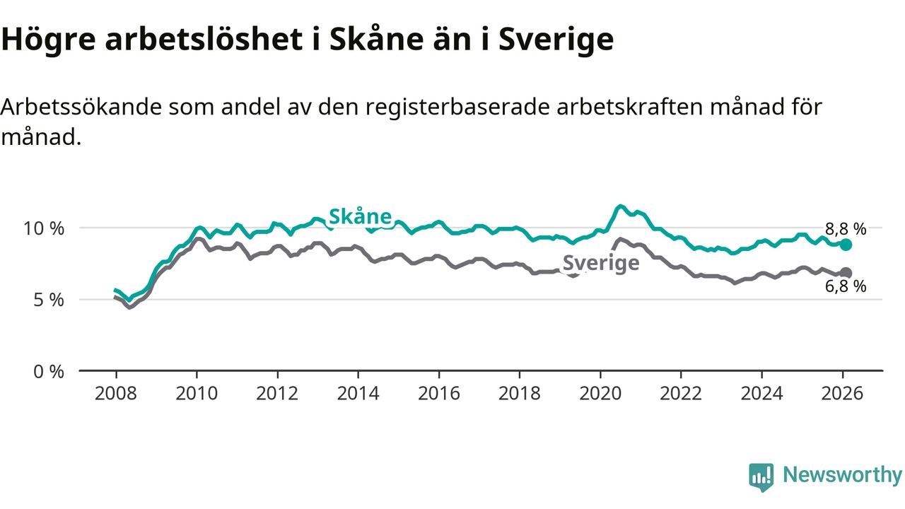 Under februari månad rapporterade Skåne län en total arbetslöshet på 8,8 procent. Det är en minskning jämfört med samma tidpunkt i fjol (−0,7 procentenheter). Även i Sverige sjunker arbetslösheten .