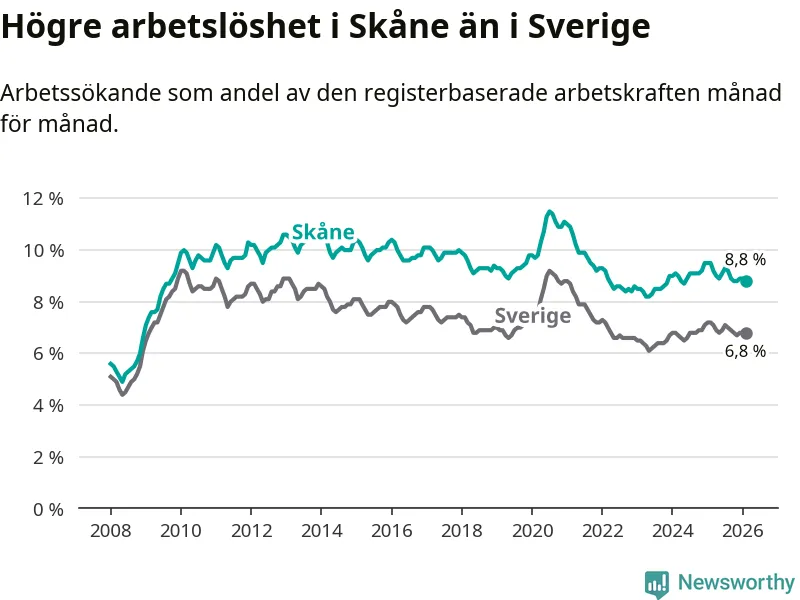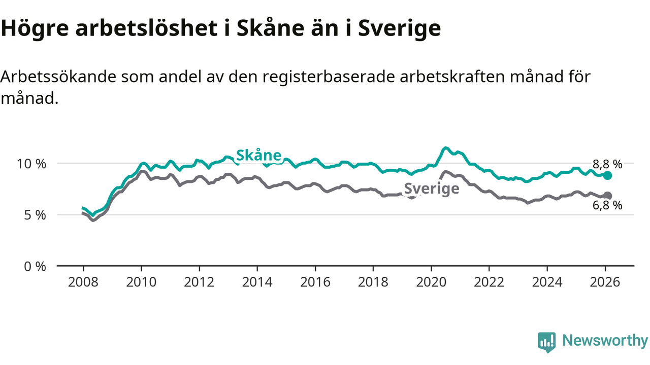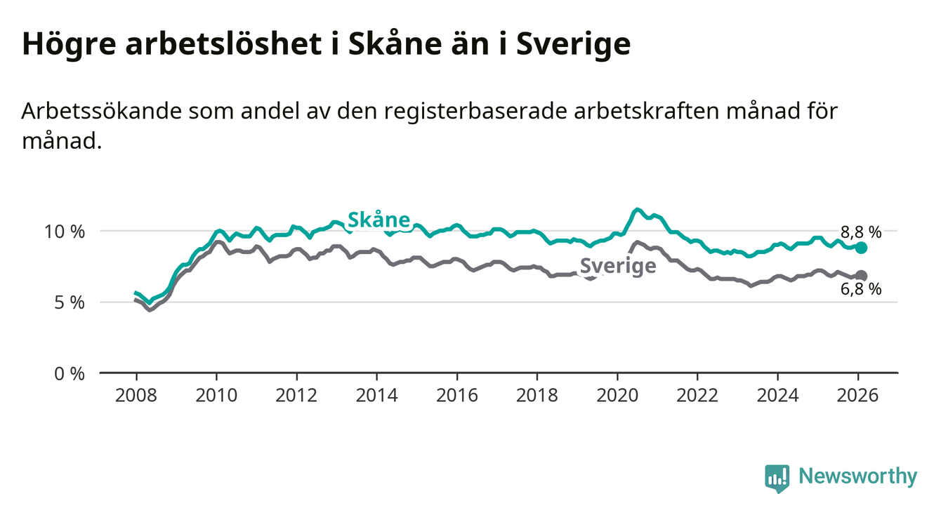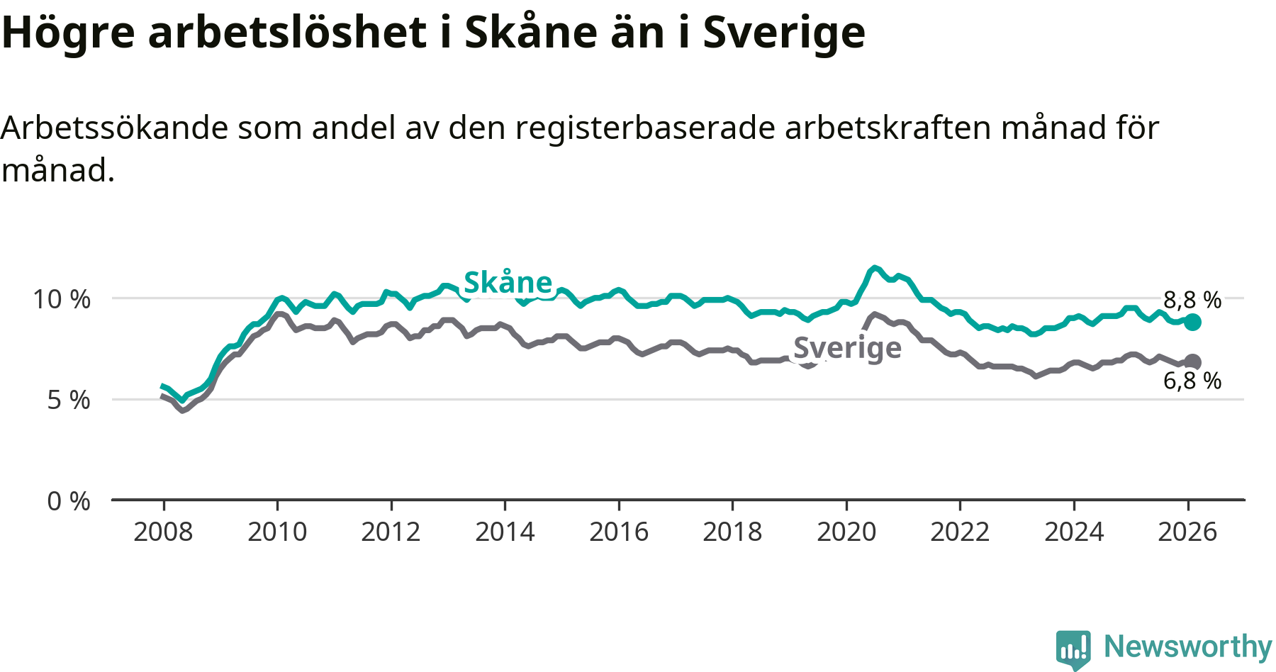 Under februari månad rapporterade Skåne län en total arbetslöshet på 8,8 procent. Det är en minskning jämfört med samma tidpunkt i fjol (−0,7 procentenheter). Även i Sverige sjunker arbetslösheten .