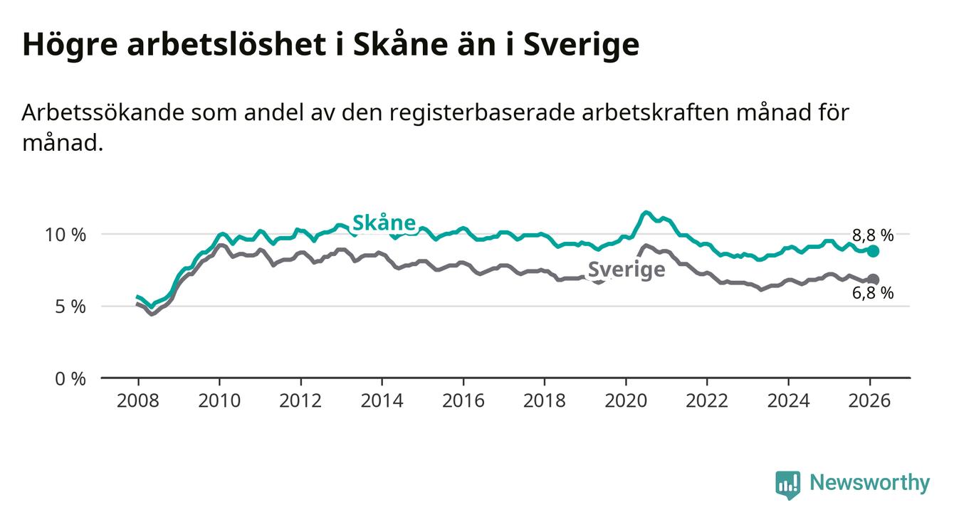 Även om arbetslösheten i Skåne alltså minskar, så ligger den fortfarande över snittet i hela Sverige (8,8 procent i länet, jämfört med 6,8 procent i hela riket). Skåne har därmed även den högsta arbetslöshetsnivån i riket. Norrbotten har den lägsta (3,8 procent). För att Skåne skulle komma ner i samma arbetslöshetsnivå som Norrbotten skulle 35 268 personer behöva sysselsättas.