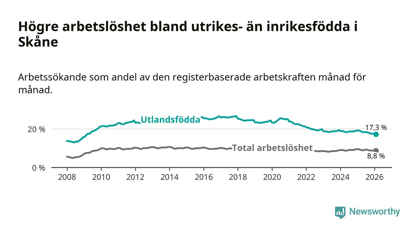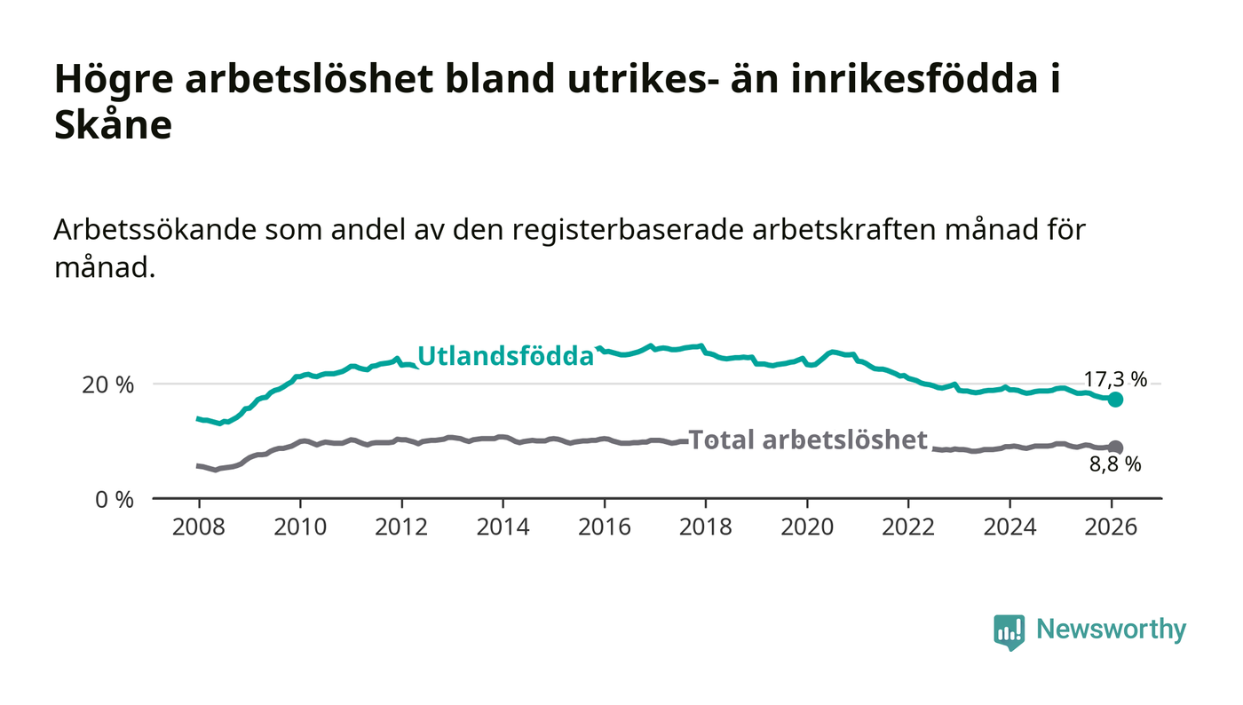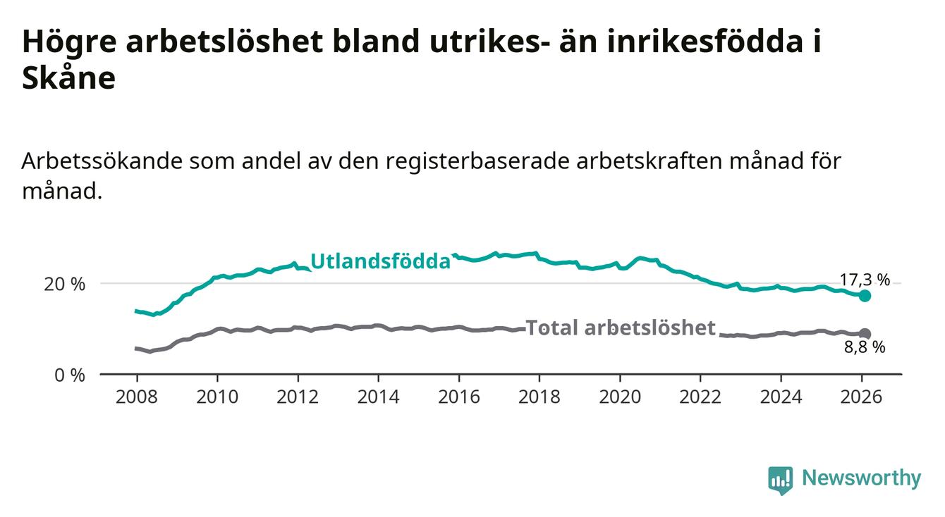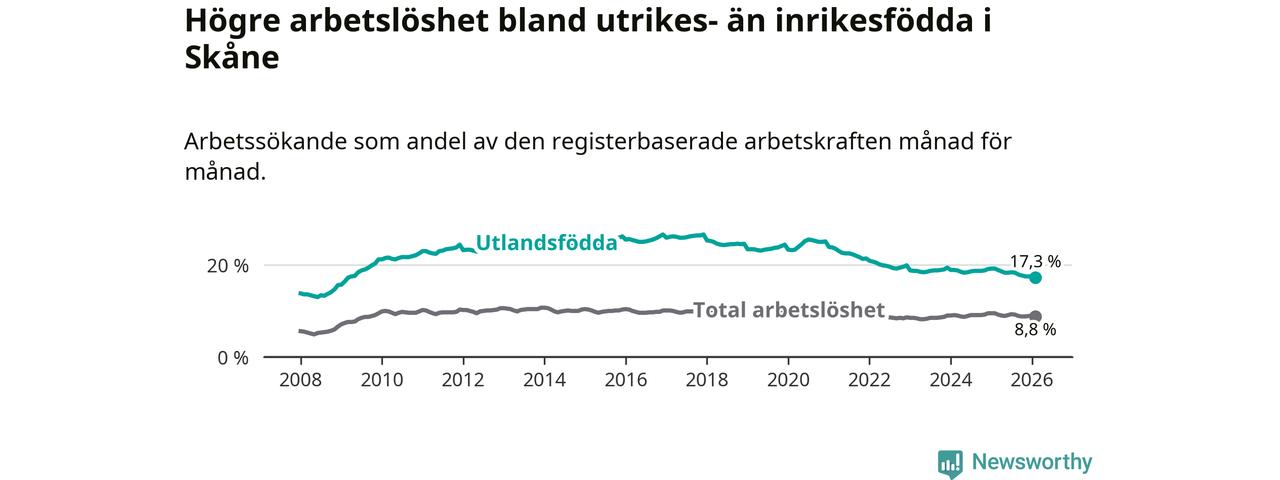 Arbetslösheten bland utlandsfödda var 17,3 procent i Skåne under februari månad, motsvarande 34 858 av 201 491 personer. Det är 1,9 procentenheter färre än vid samma tidpunkt i fjol (−2 936 om man räknar personer). Därmed är de utlandsföddas arbetslöshet lägre än vid samma tidpunkt i fjol för nionde månaden i följd. Sedan maj 2025 har arbetslösheten bland utlandsfödda minskat från 18,3 till 17,3 procent. Den nuvarande arbetslöshetsnivån är den lägsta sedan mars 2009.