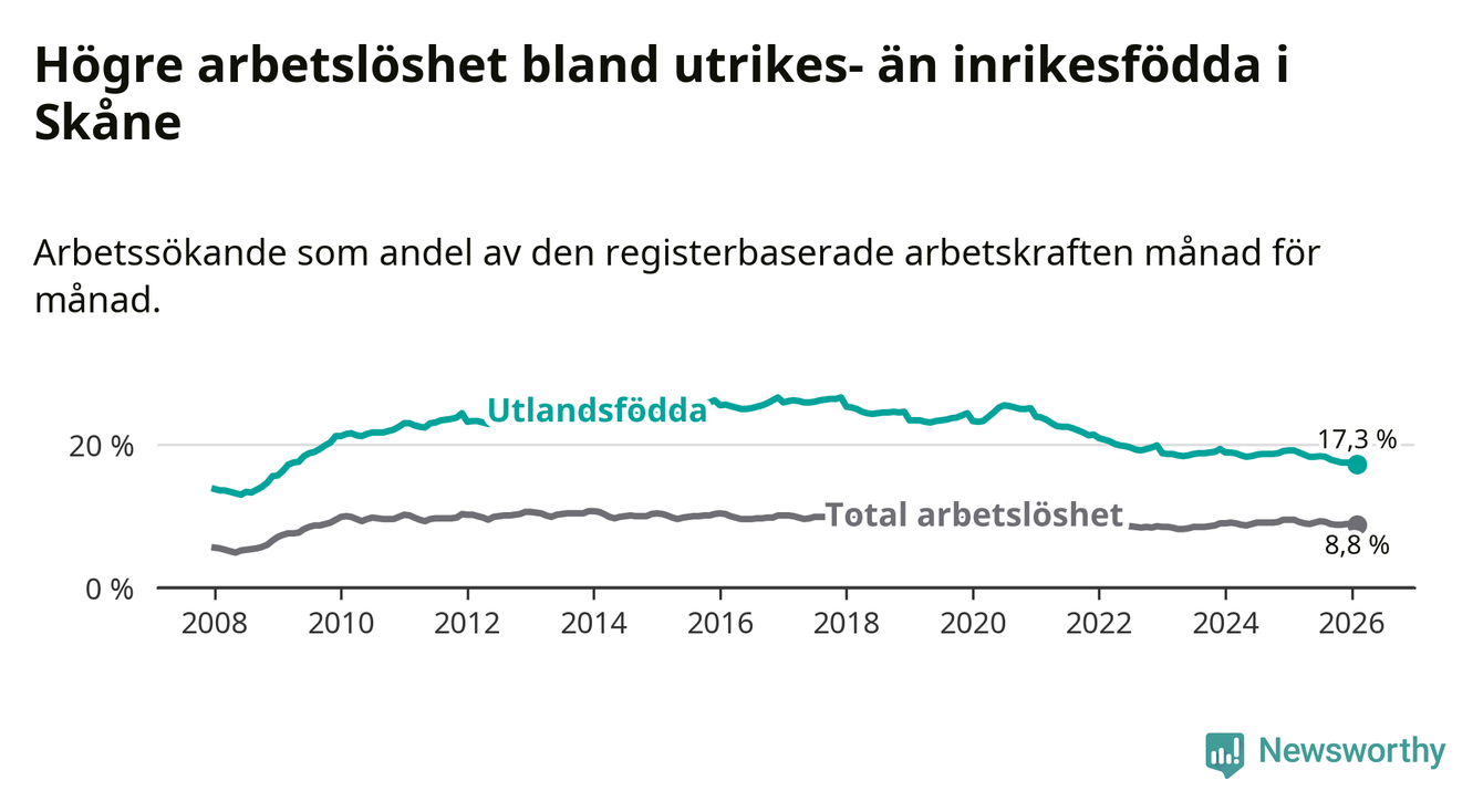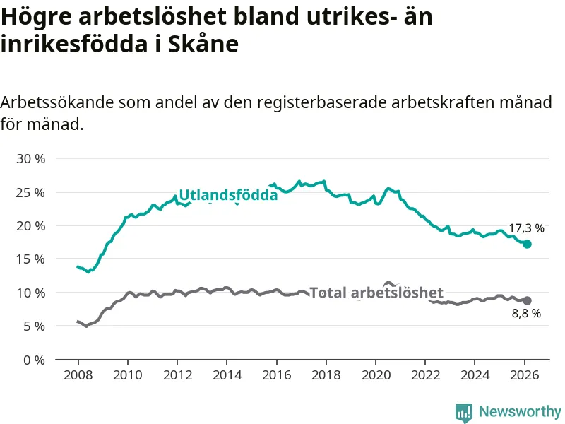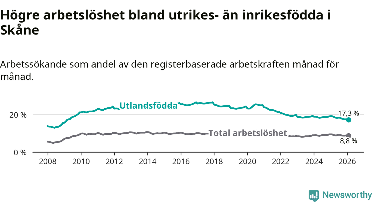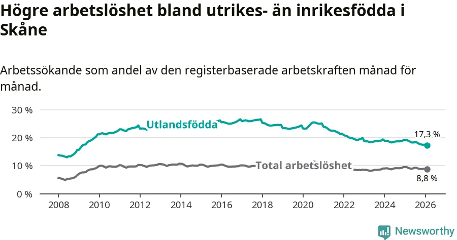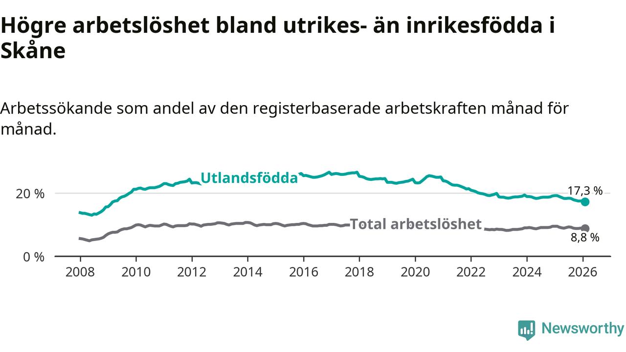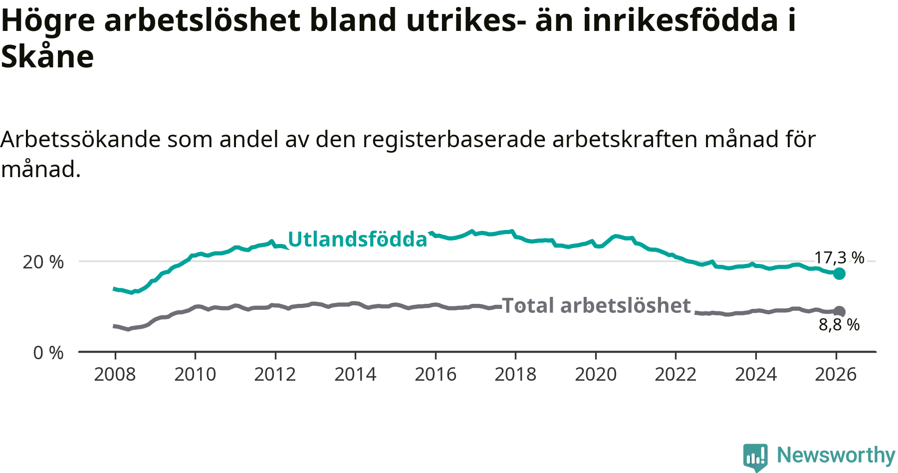 Arbetslösheten bland utlandsfödda var 17,3 procent i Skåne under februari månad, motsvarande 34 858 av 201 491 personer. Det är 1,9 procentenheter färre än vid samma tidpunkt i fjol (−2 936 om man räknar personer). Därmed är de utlandsföddas arbetslöshet lägre än vid samma tidpunkt i fjol för nionde månaden i följd. Sedan maj 2025 har arbetslösheten bland utlandsfödda minskat från 18,3 till 17,3 procent. Den nuvarande arbetslöshetsnivån är den lägsta sedan mars 2009.